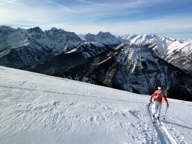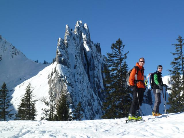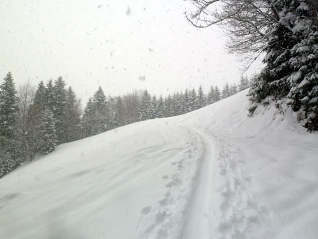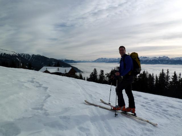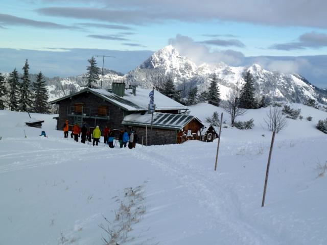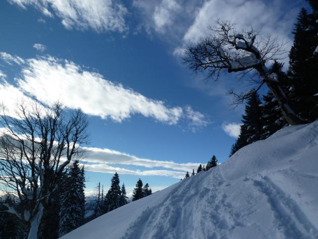 Tourenverhältnisse: Schneereicht gerade so zum Parkplatz, dorthin kann man aber dankt Rodelbahn (teils vereist) problemlos abfahren. Im Wald Aufstiegsspur oft eisig, kurzzeitig aber. Ab der Waldgrenze genügend Schnee, meist windverpresst und in der Abfahrt eher ruppig.