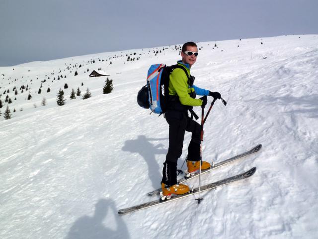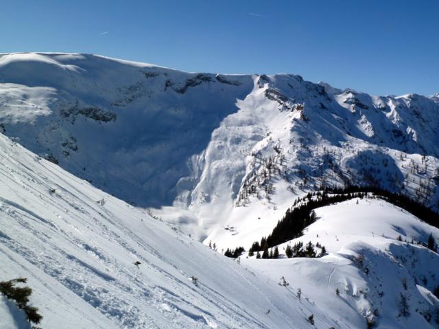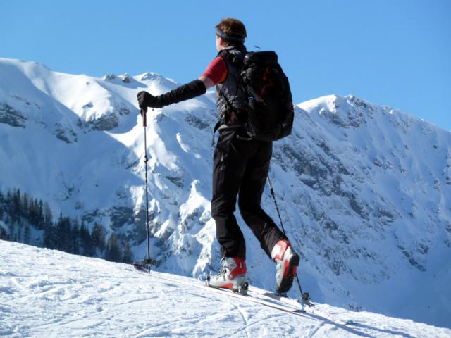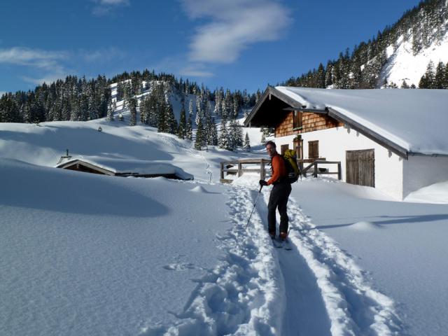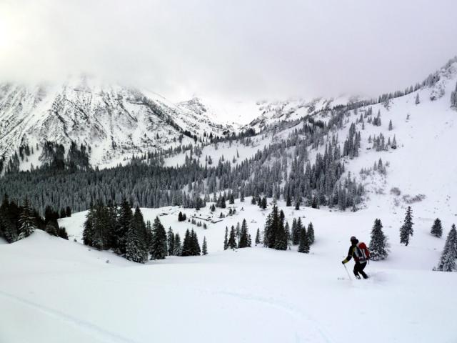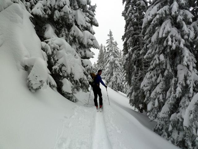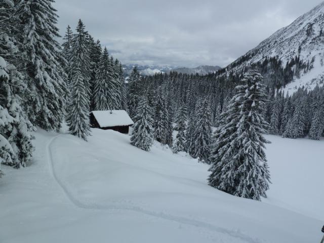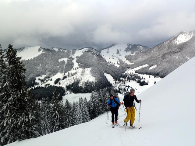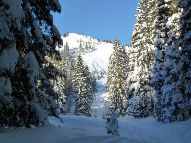 Tourenverhältnisse: Trotz Wärmeeinbruch heute Vormittag noch sehr gut! Griffige präparierte Piste (aber vormittags noch kein Liftbetrieb), im freien Gelände etwas schwerer Pulver, aber sehr schön zu fahren, vor allem im lichten Waldstück unterhalb der Weidbergalm.