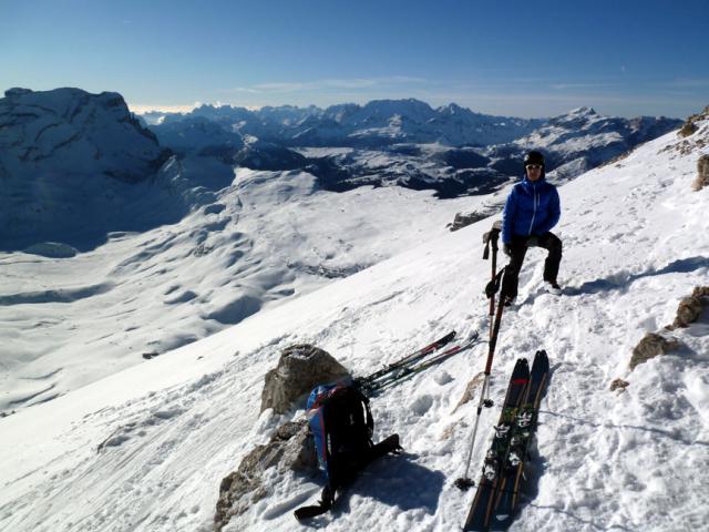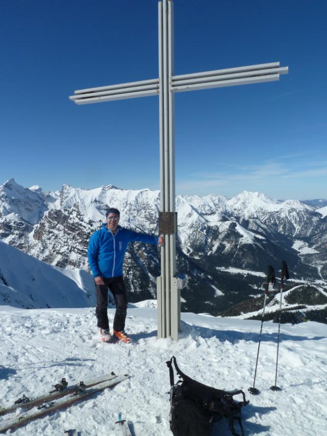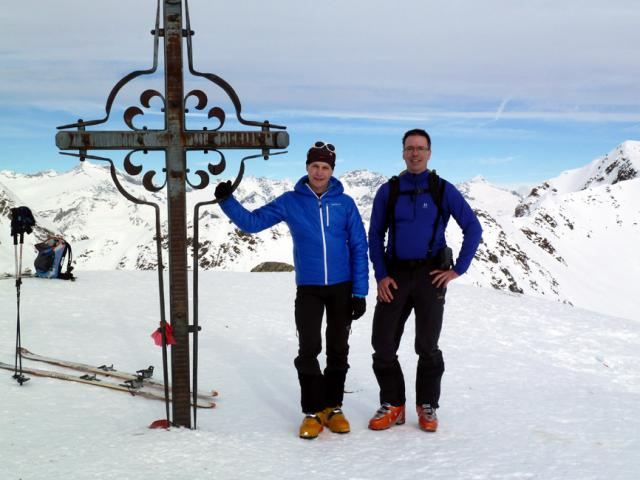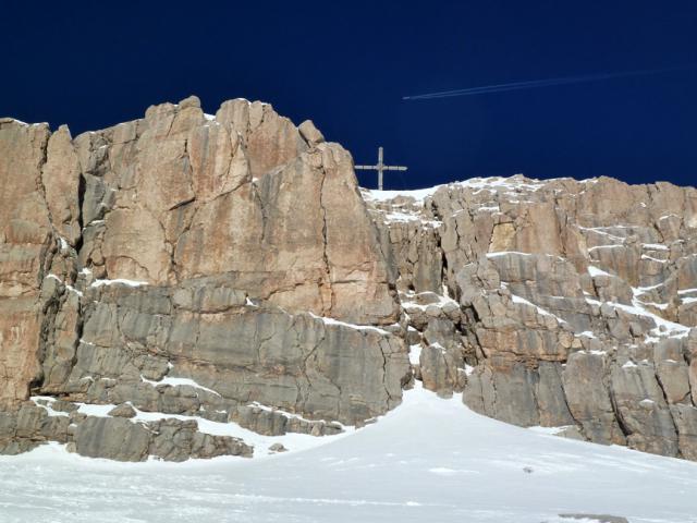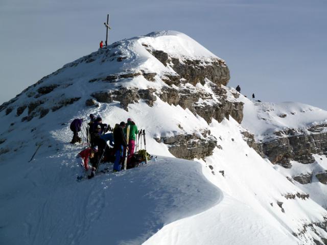 Gefahreneinschätzung: gering bei guter Spurwahl; Klettersteig zum Gipfelkreiz (ca. 15 Minuten ab Skidepot) aper/trocken, aber herausfordernd.