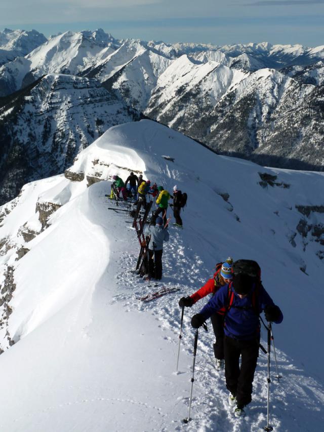 Höchster Punkt: Kreuzspitze, 2185 m Art der Tour: Skitour Datum der Tour: 16. Februar 2013 Gebirge: Ammergauer Alpen Ausgangspunkt: an der Straße von Linderhif Richtung Plansee, vgl. Touren- und Anfahrtsbeschreibung http://www.tourentipp.de/de/to…Ammergauer-Alpen_494.html Exposition der Tour: Nord, Nordost Tourenverhältnisse: Powder von oben bis unten (ca. 30 cm Neuschnee von gestern auf stabiler Unterlage), nun allerdings zusammengefahren... Gipfelaufbau auch ohne Steigeisen machbar, teils aber etwas unangenehm (lockerer Schnee auf lockeren Steinen). Gefahreneinschätzung: Lawinenrisiko heute bei LWS 1-2 gering, die größere (Absturz-)Gefahr lauert im Gipfelanstieg an Skidepot (einige haben dort Steigeisen eingesetzt, mit etwas Vorsicht geht's aber auch ohne) Prognose: So gut wie heute geht's die nächsten Tage nicht mehr (weil die ganzen unverspurten Pulverhänge jetzt zusammengefahren sind) - aber gehen tut's natürlich trotzdem.