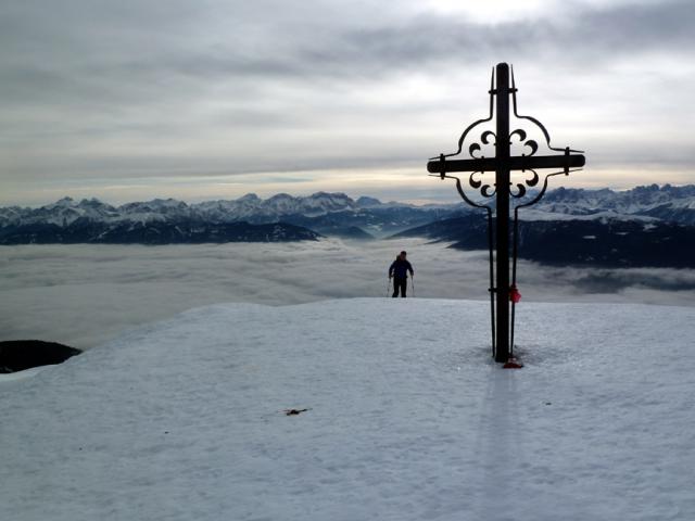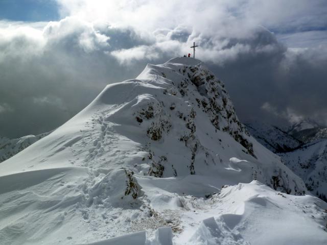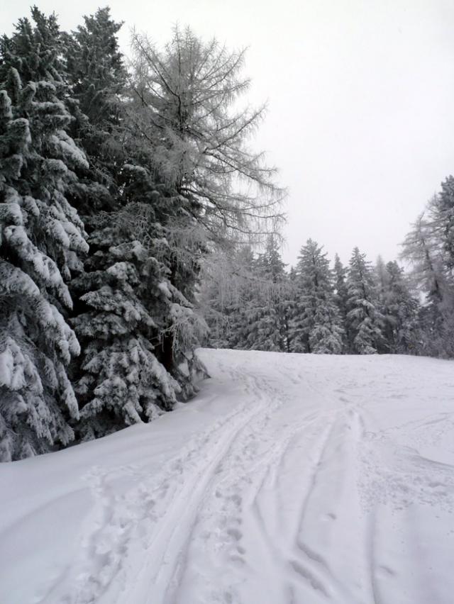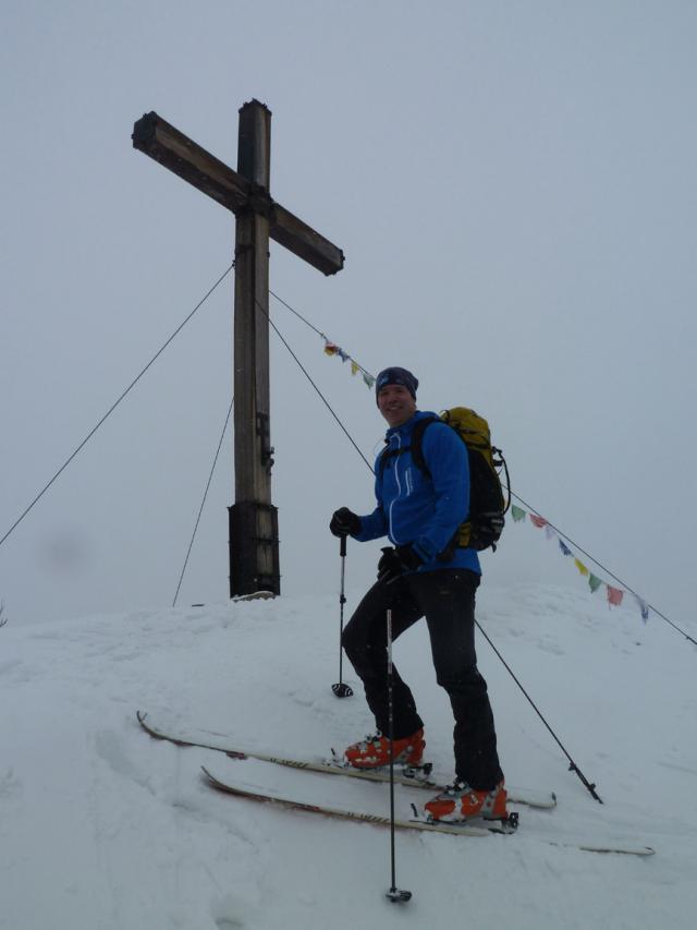 Tourenverhältnisse: Auf der Forststraße teils sehr dünne Schneedecke (Kratzer in der Abfahrt kaum vermeidbar), erst ab dem großen Viehgatter genug Schnee. Oben 10 bis 20 cm Neuschnee, am Gipfelhang etwas verblasen (auch hier manchmal Steinkontakt). Sehr schöne Pulververhältnisse in den von Wald umsäumten Passagen. Skidepot fast am Gipfel, die wenigen Meter zum Kreuz sind problemlos zu gehen. Insgesamt waren die Bedingungen besser als erwartet - mit etwas Weitblick lässt sich auch die Forststraße passabel fahren.