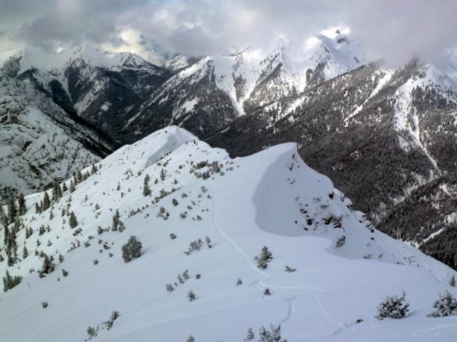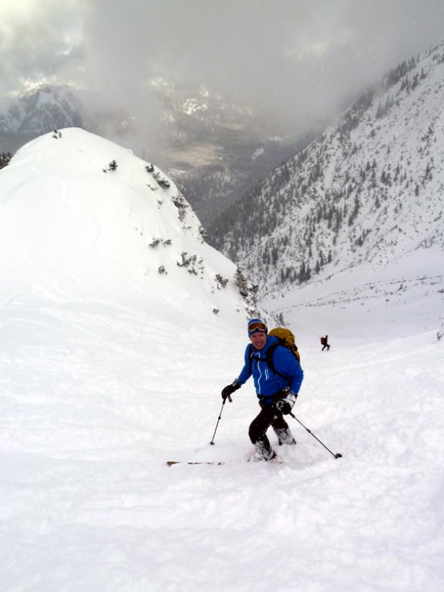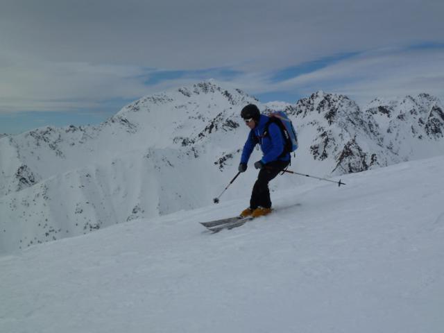Tourenverhältnisse: Aufstieg auf der Normalroute (vgl. http://www.tourentipp.de/de/to…renkopf-Skitour_1522.html) zum Gipfel. Abfahrt zur Weißenbachalm, wieder rauf zum Bärenkopf, Talabfahrt nun nicht auf der Anstiegsroute, sondern nach Sprung über die Wechte oberhalb der Gratschulter in eine nordseitige Steilrinne hinein - tolles Kar, nur wenig Spuren drin. Nordseitig Pulver auf stabiler Unterlage, unten im finalen Kar auch Lawinenboller (aber schon wieder gut zugeschneit), südseitig mehr Sulz (teils tief) als Firn, westseitig Harschdeckel.