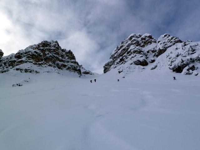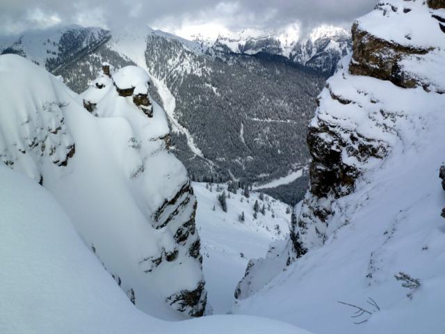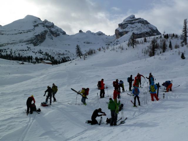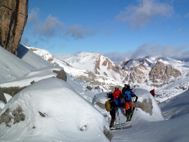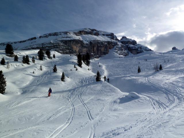 Tourenverhältnisse: Im oberen Teil Pulverschnee (windverpresst, aber schön zu fahren), weiter unten nicht mehr ganz so komfortabel. Ab Fanes-Hütte gespurte Abfahrt nach Pederü, teils steinig.