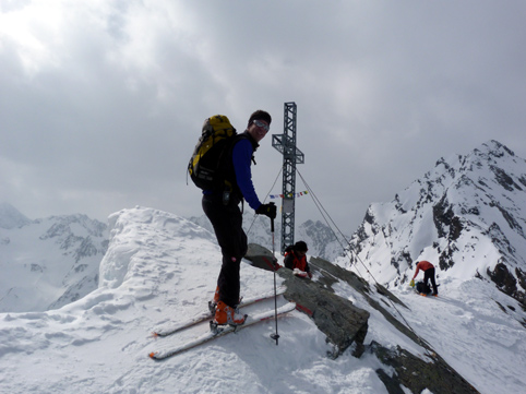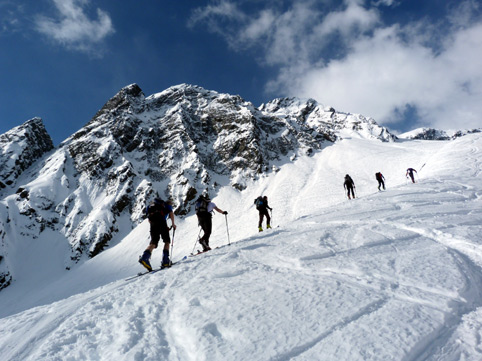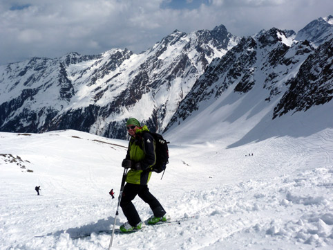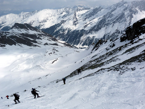 Gefahreneinschätzung: LLB 1-2 am Vormittag, 3 ab Mittag. Aufstieg Gipfelhang mit Entlastungsabständen; größer ist dort aber das Sturzrisiko im verbuckelten Gelände des anhaltend 35-40 Grad steilen Gipfelhangs; ein Abfahrer hat bei einem Sturz seinen Ski verloren, der 50 m nach unten katapultiert wurde und nur knapp am Kopf eines Aufsteigers vorbeischrammte. Unterhalb von 2000 m in der Abfahrt stark durchfeuchteter Schnee, was im Steilgelände bei der Abfahrt zur Auslösung kleiner Rutsche führen kann; insgesamt aber - mit Blick auf Stufe 3 ab Mittag - überschaubares und (abgesehen von steilen Einzelstellen) geringes Risiko. Weinger Risiko, wenn man auf der Aufstiegsroute (mit Tragestellen) abfährt.