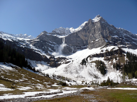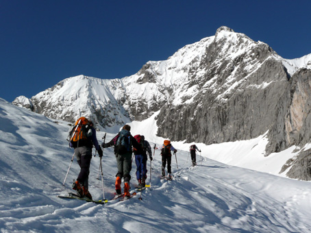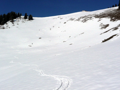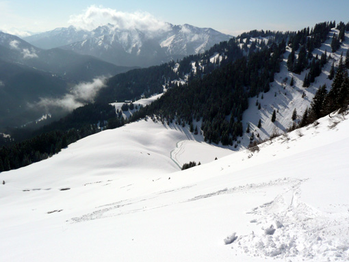 Ich war froh, dass ich um 10 Uhr im Enger Grund die Ski abgeschnallt habe, denn just in diesem Moment brauste eine riesige Schnee-Stein-Lawine von der Eiskarlspitze Richtung Brotzeitfelsen (noch zu sehen auf Foto 5).