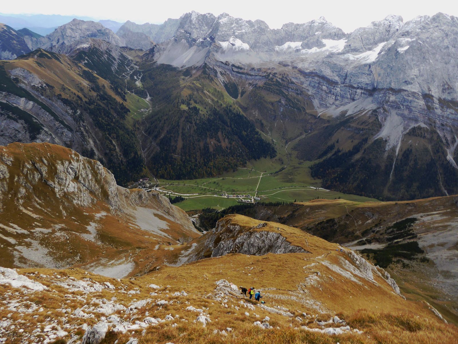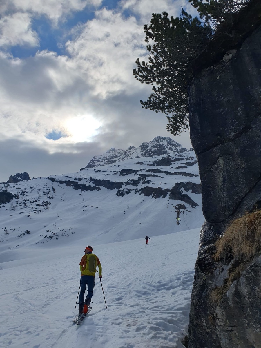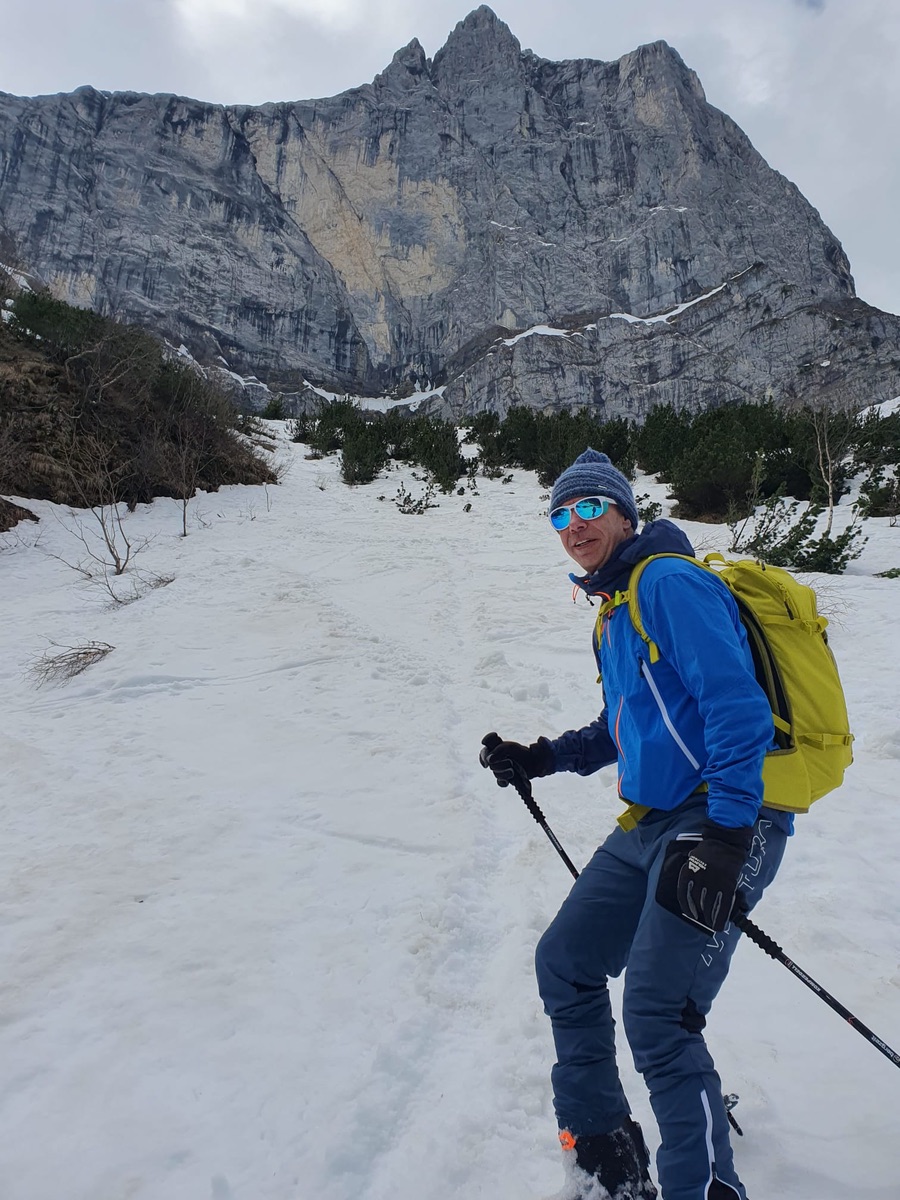 So schön (wirklich absolut gut) die Abfahrtsbedingungen auch waren, zur Wahrheit gehört aber auch, dass die Aufstiege machbar waren, ohne Begeisterung auszulösen. Bei mir vor der Haustür in München liegt momentan mehr Naturschnee als in Lenggries (was auch Einheimische bestätigen), die Aufstiegsrouten bieten insofern so manche Tücke. Dort, wo Wiesen unter freiem Himmel sind (wie am Draxl- Streidlhang): alles ok, basst fei scho. Dort, wo Bäume stehen (und den Schnee "aufhalten"), ist es teils arg dünn mit der Schneedecke. Von Wegscheid aus sind wir deshalb nicht der offiziellen Tourengeherroute gefolgt, sondern beim Milchhäusl geradewegs hinauf zur Kotalm; dann hinübergequerrt zur Bergstation von Flori II und nun auf dem extrem schneearmen Standardanstieg hinauf zur Streidlalm und weiter zum Gipfel.