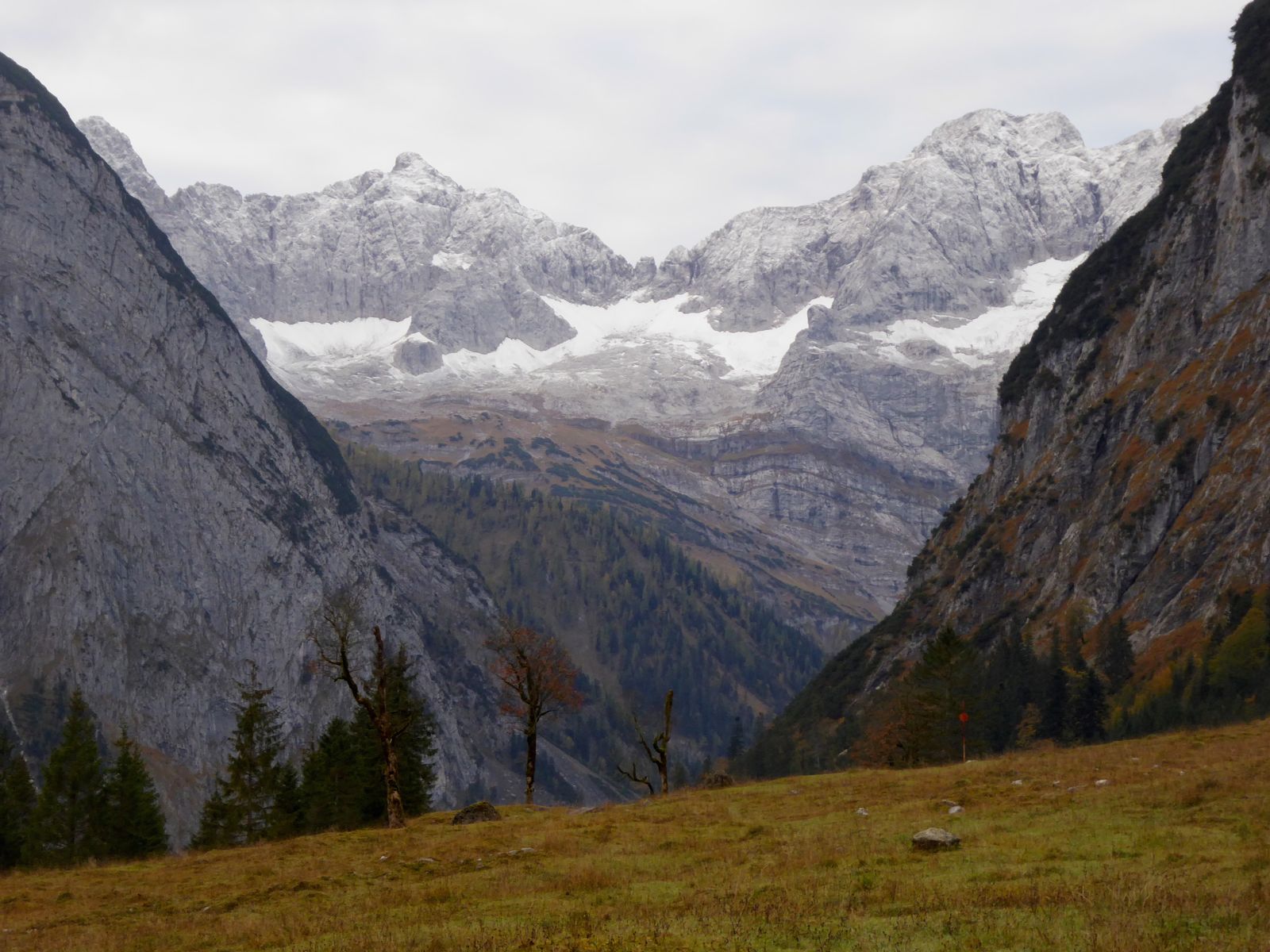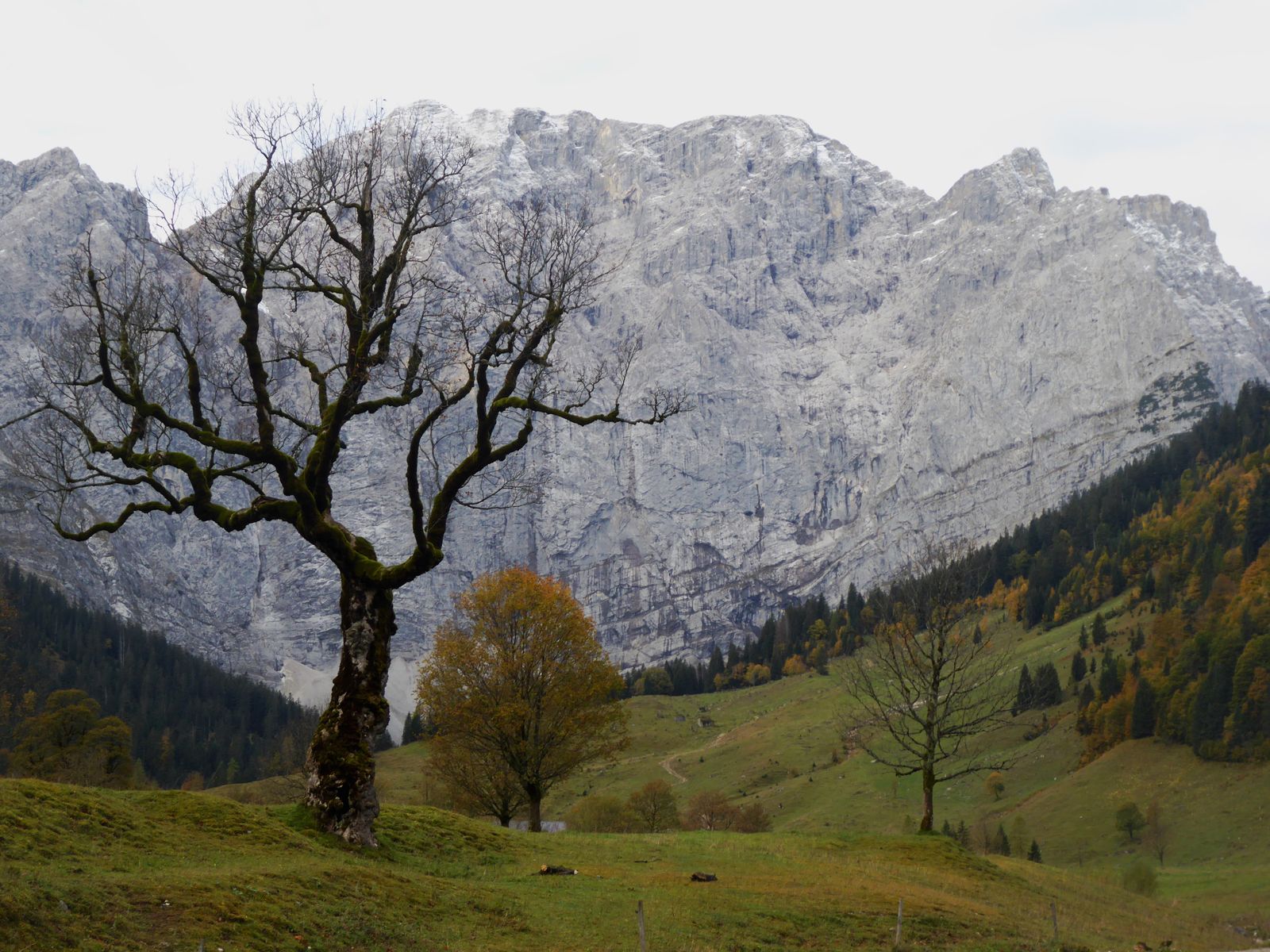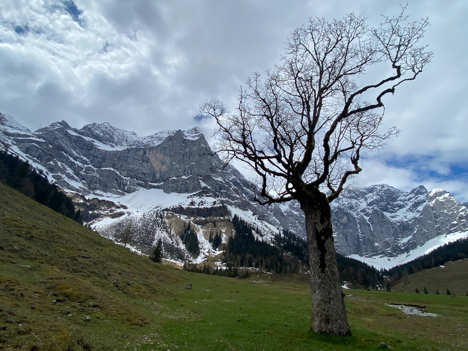 So schön (wirklich absolut gut) die Abfahrtsbedingungen auch waren, zur Wahrheit gehört aber auch, dass die Aufstiege machbar waren, ohne Begeisterung auszulösen. Bei mir vor der Haustür in München liegt momentan mehr Naturschnee als in Lenggries (was auch Einheimische bestätigen), die Aufstiegsrouten bieten insofern so manche Tücke. Dort, wo Wiesen unter freiem Himmel sind (wie am Draxl- Streidlhang): alles ok, basst fei scho. Dort, wo Bäume stehen (und den Schnee "aufhalten"), ist es teils arg dünn mit der Schneedecke. Von Wegscheid aus sind wir deshalb nicht der offiziellen Tourengeherroute gefolgt, sondern beim Milchhäusl geradewegs hinauf zur Kotalm; dann hinübergequerrt zur Bergstation von Flori II und nun auf dem extrem schneearmen Standardanstieg hinauf zur Streidlalm und weiter zum Gipfel.