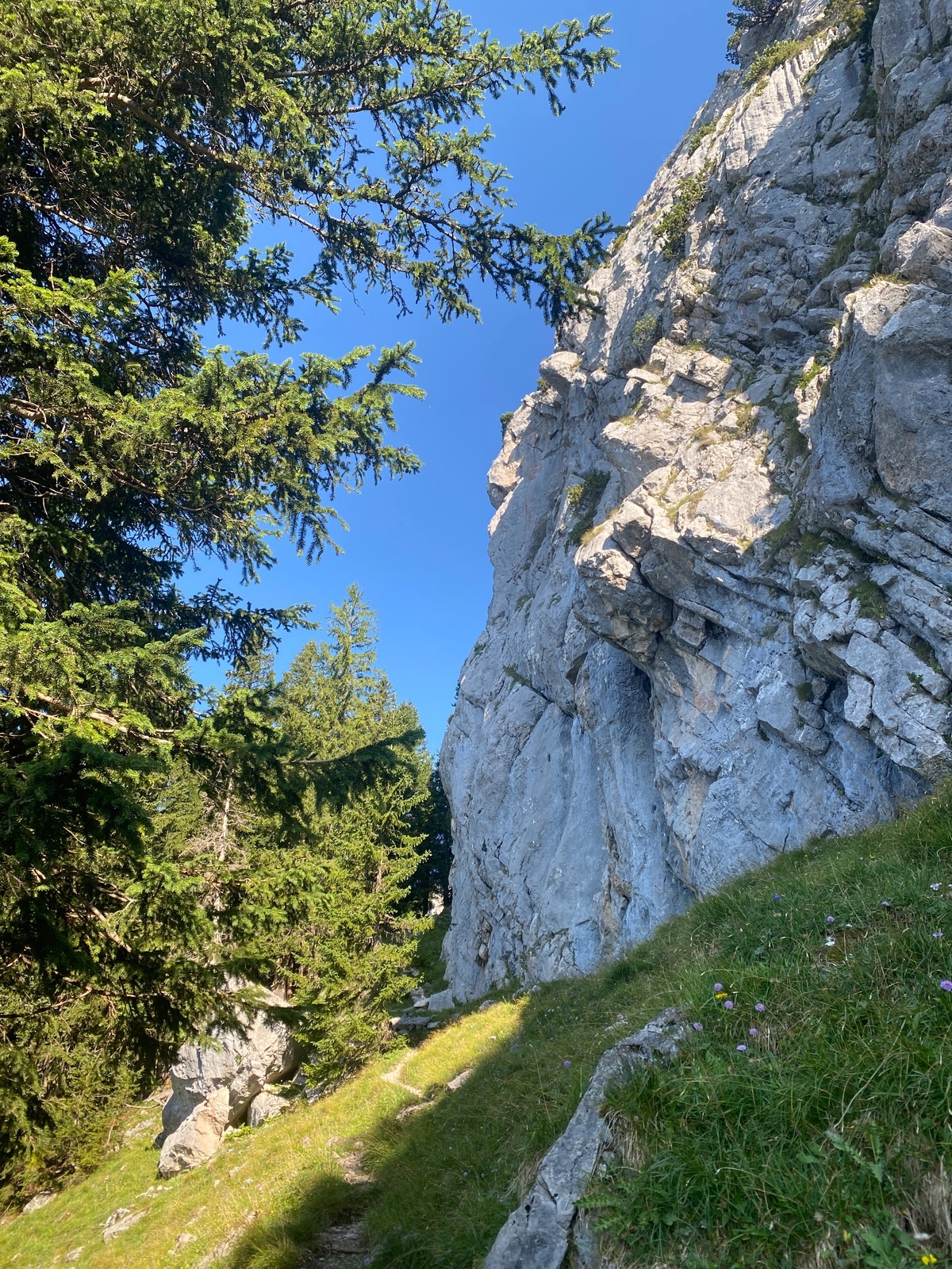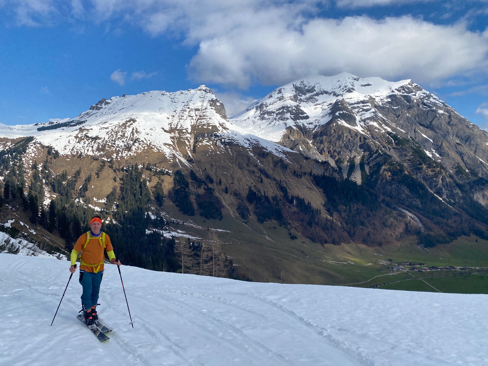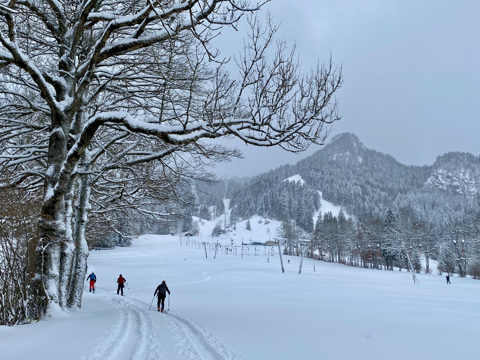 Noch dünner ist es beim einsamen (zweiten) Anstieg auf der Brauneck-Nordseite (gespurt am Talstation Dreiersessel, kommt bei der Windfahne am Gipfel raus). Zweimal mussten wir die Skier mangels Schnee ausziehen, die Waldpassagen waren grenzwertig (eher was zum Wandern), oben beim Spitzkehrenfestival dann ganz okay.