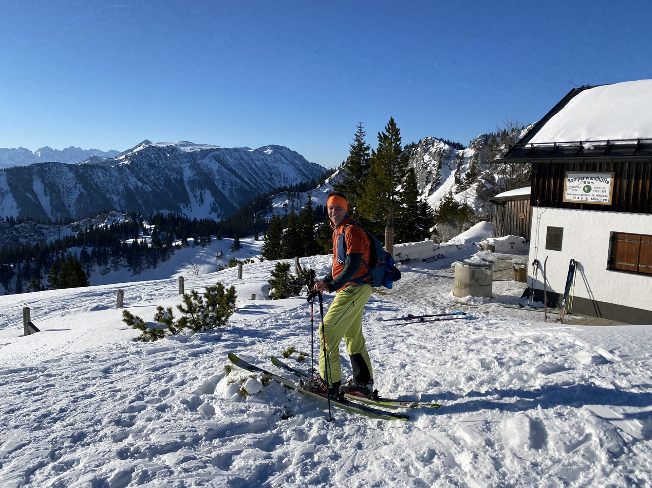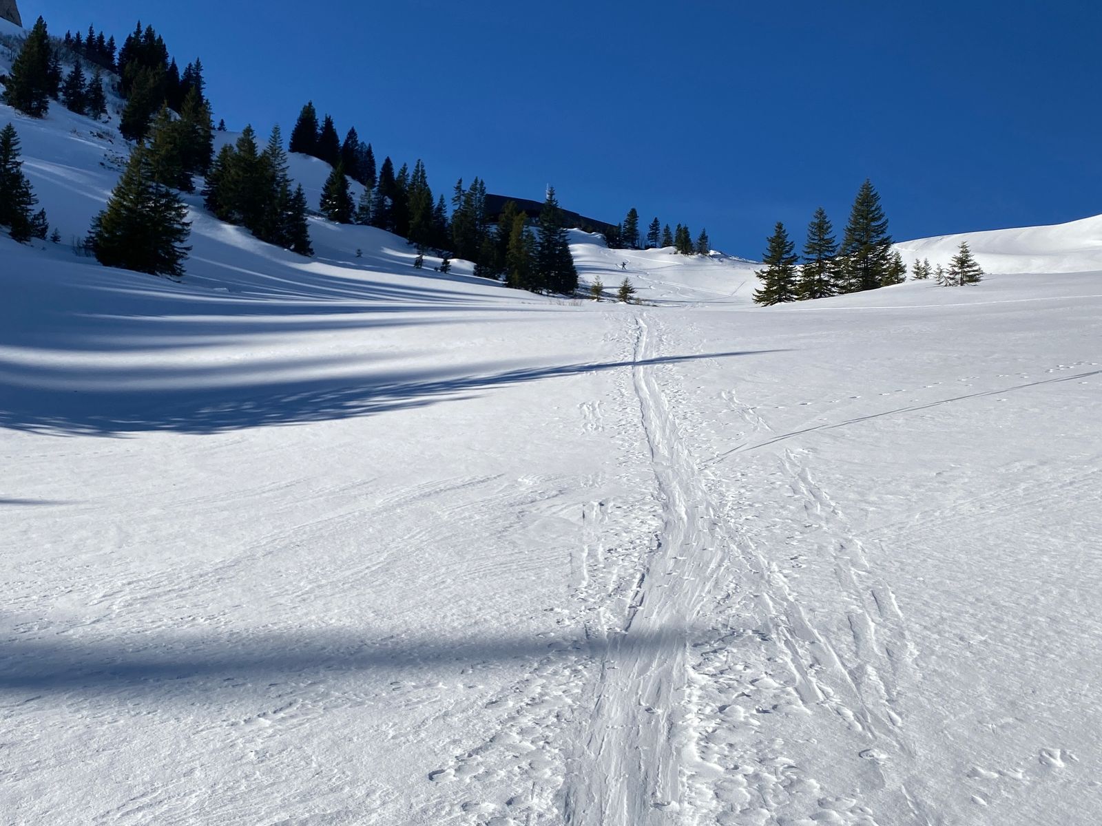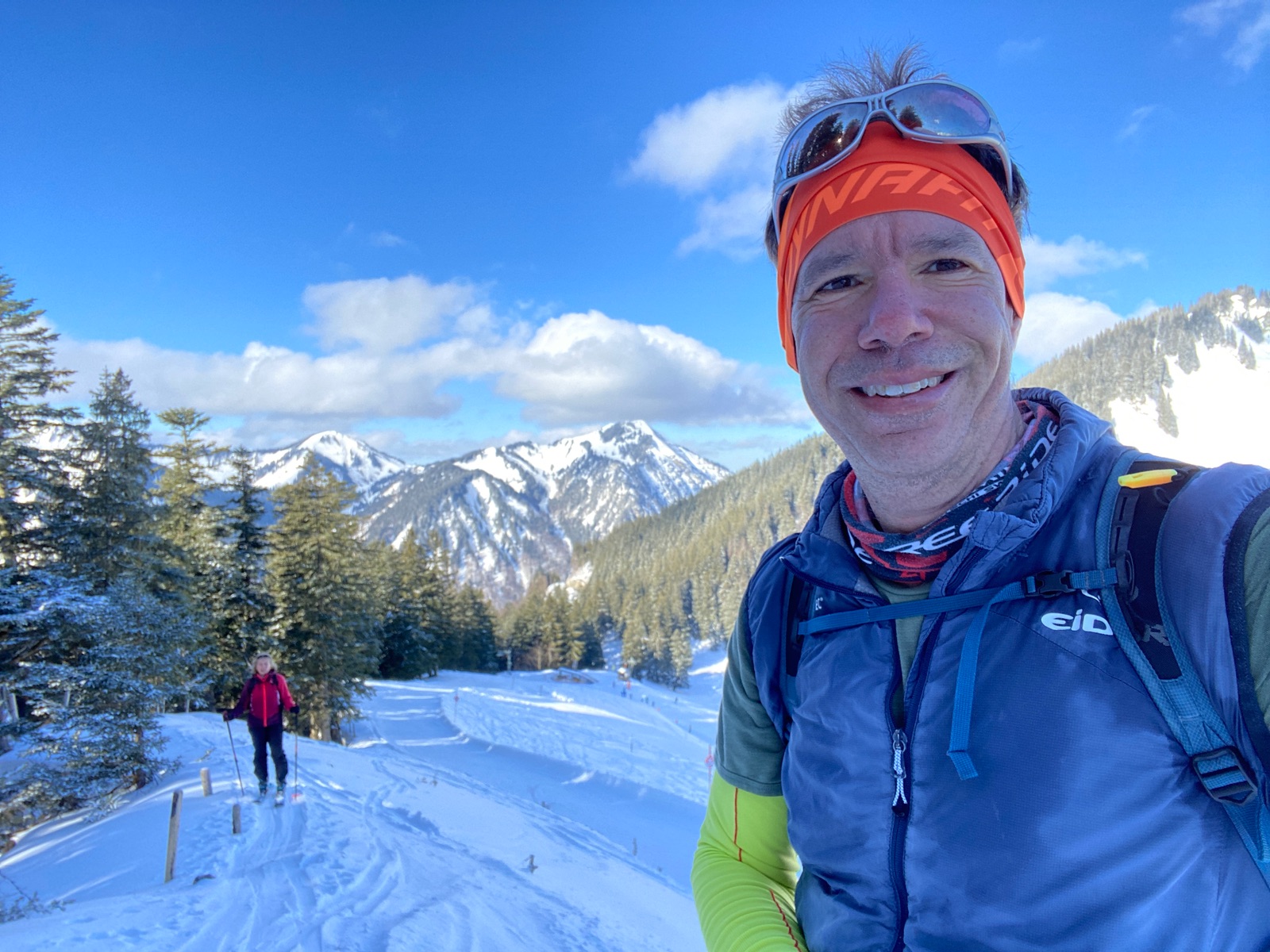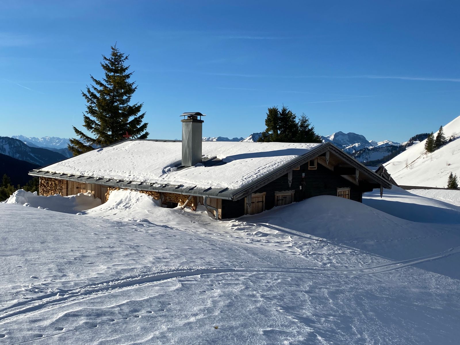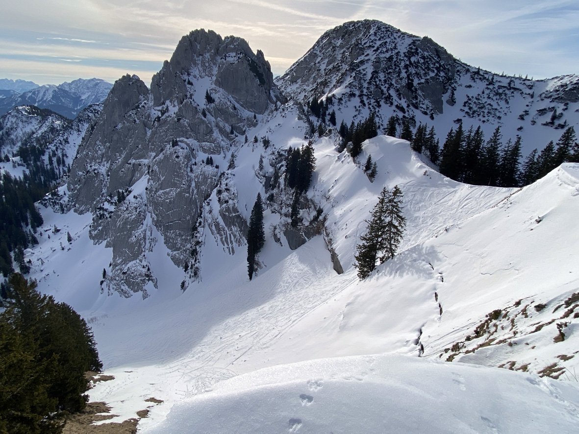 Also, Felle drauf und los. Ich drehte meine übliche Runde: über die Dreitannenroute in den Firstalmkessel und von hinten auf den Stümpfling, dann die erste Abfahrt - den herrlich pulvrigen Osthang hinunter, weiter auf der unten unangenehm harschigen Stümpflingabfahrt Richtung Valepp bis Höhe Albert-Link-Hütte, dann der zweite Aufstieg über die Grünseeroute, bei der richtiges Skitouren-Ambiente herrscht (keine Liftanlagen und Schneekanonen). An den Almen beim Grünsee habe ich mal die Schneehöhe gemessen, 60 cm.