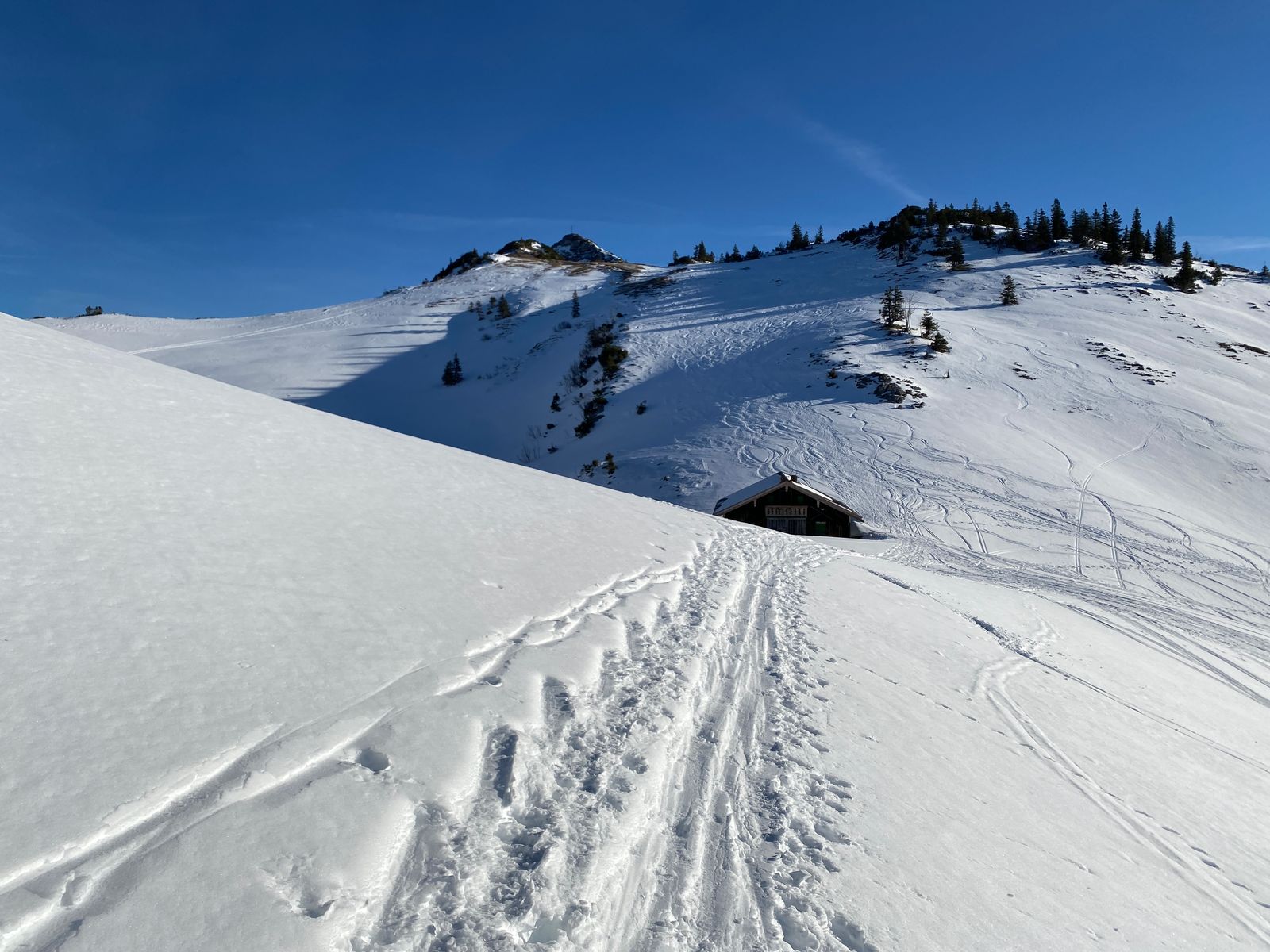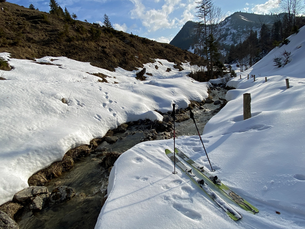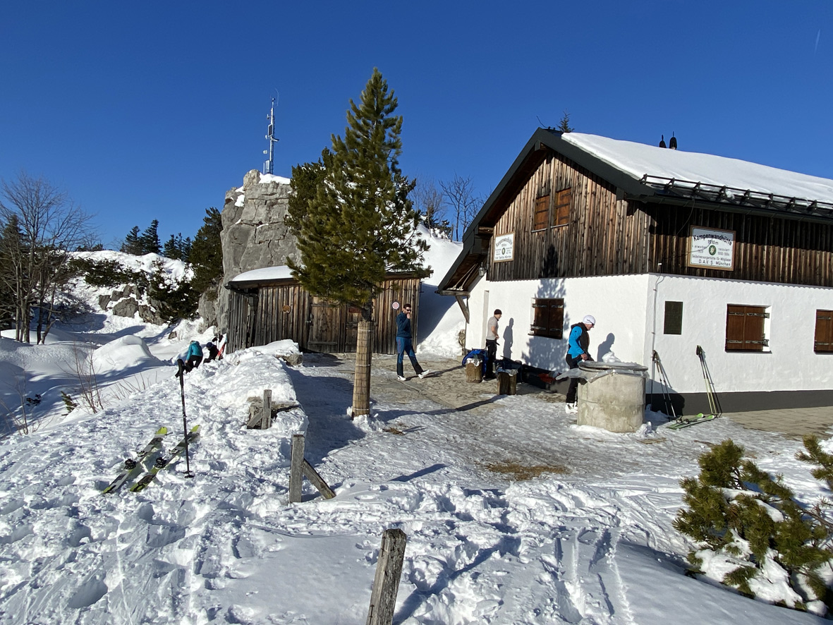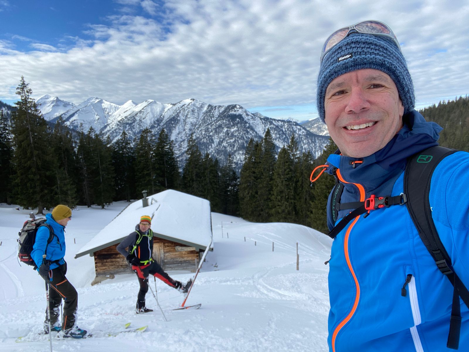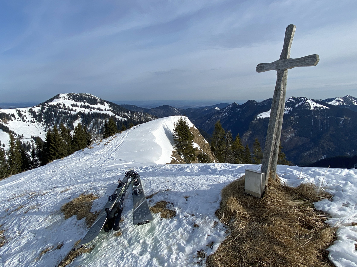 Also, Felle drauf und los. Ich drehte meine übliche Runde: über die Dreitannenroute in den Firstalmkessel und von hinten auf den Stümpfling, dann die erste Abfahrt - den herrlich pulvrigen Osthang hinunter, weiter auf der unten unangenehm harschigen Stümpflingabfahrt Richtung Valepp bis Höhe Albert-Link-Hütte, dann der zweite Aufstieg über die Grünseeroute, bei der richtiges Skitouren-Ambiente herrscht (keine Liftanlagen und Schneekanonen). An den Almen beim Grünsee habe ich mal die Schneehöhe gemessen, 60 cm.