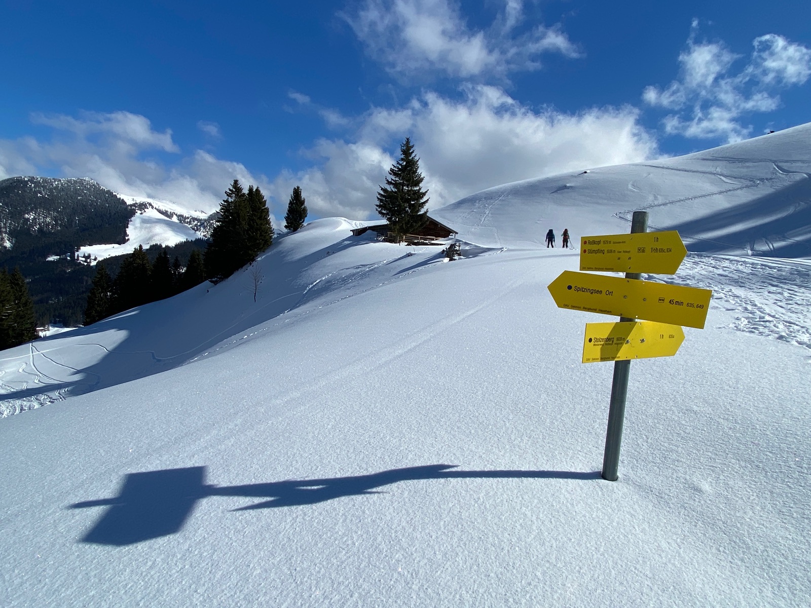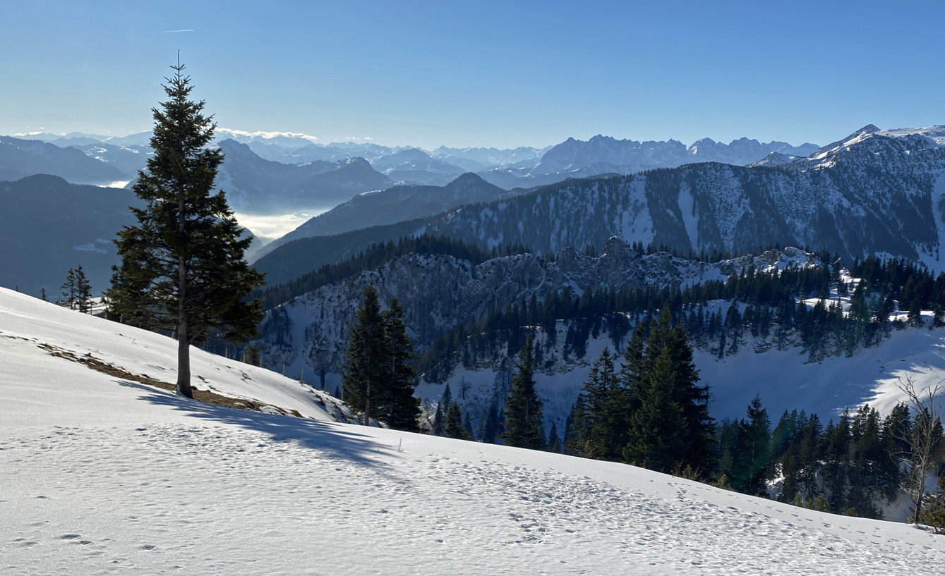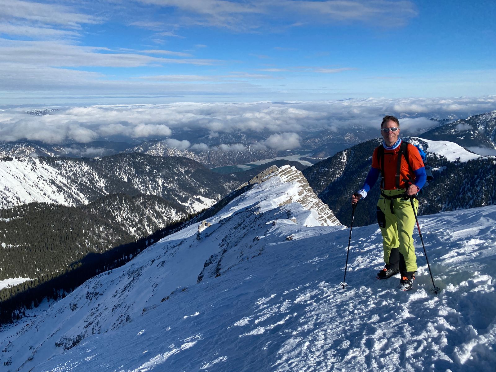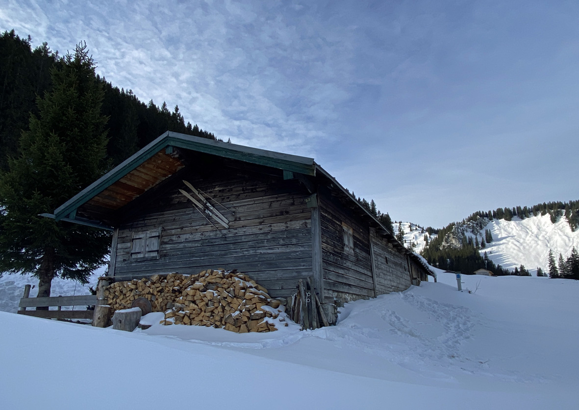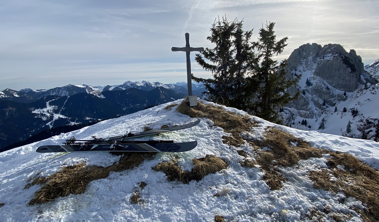 Also, Felle drauf und los. Ich drehte meine übliche Runde: über die Dreitannenroute in den Firstalmkessel und von hinten auf den Stümpfling, dann die erste Abfahrt - den herrlich pulvrigen Osthang hinunter, weiter auf der unten unangenehm harschigen Stümpflingabfahrt Richtung Valepp bis Höhe Albert-Link-Hütte, dann der zweite Aufstieg über die Grünseeroute, bei der richtiges Skitouren-Ambiente herrscht (keine Liftanlagen und Schneekanonen). An den Almen beim Grünsee habe ich mal die Schneehöhe gemessen, 60 cm.