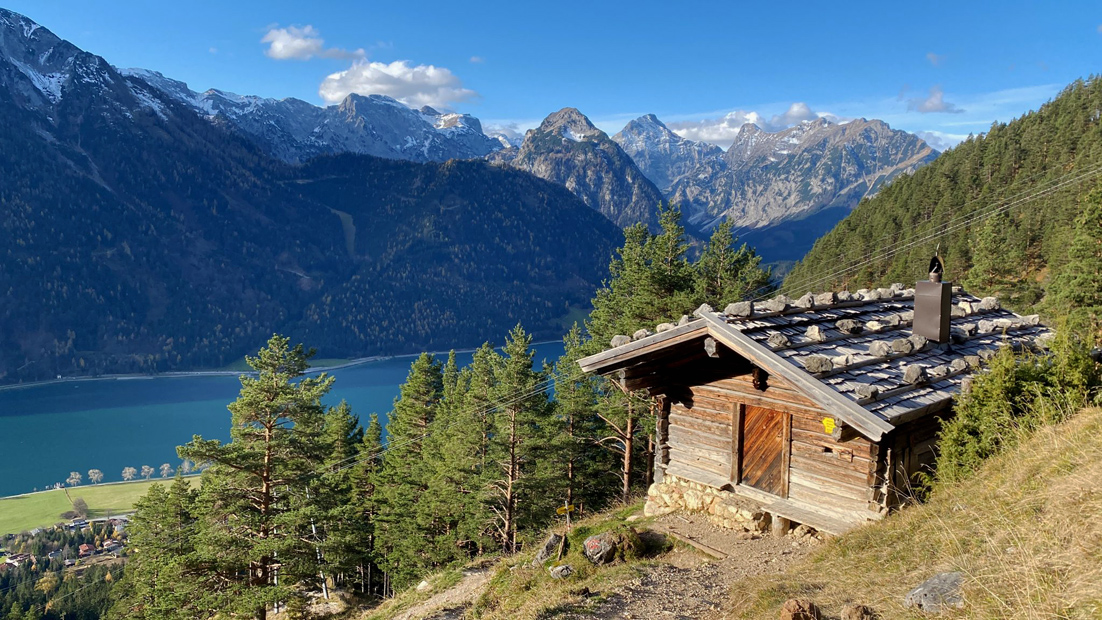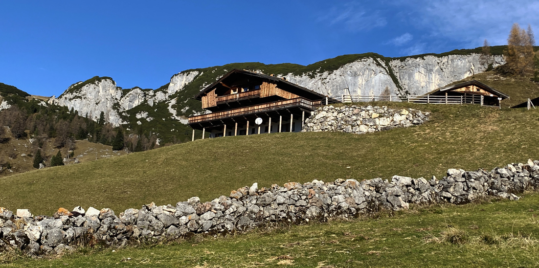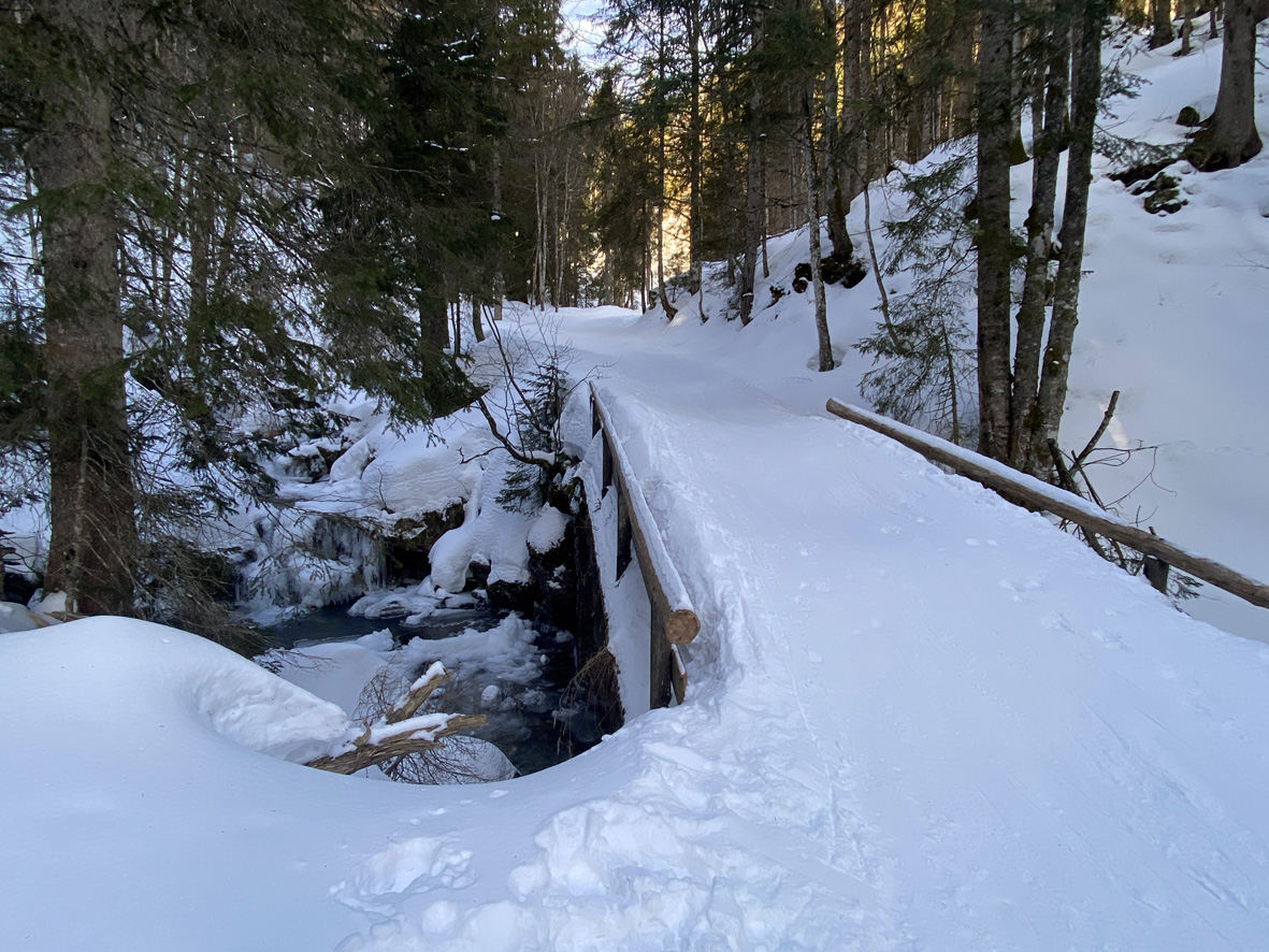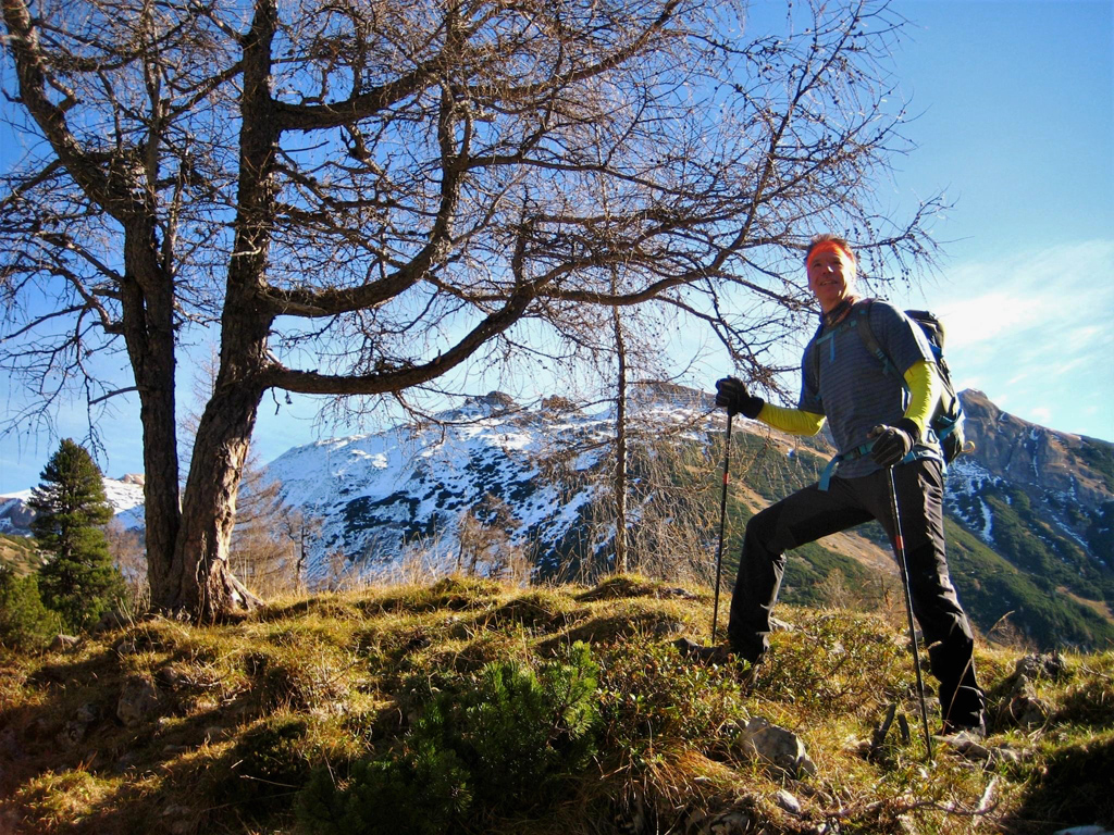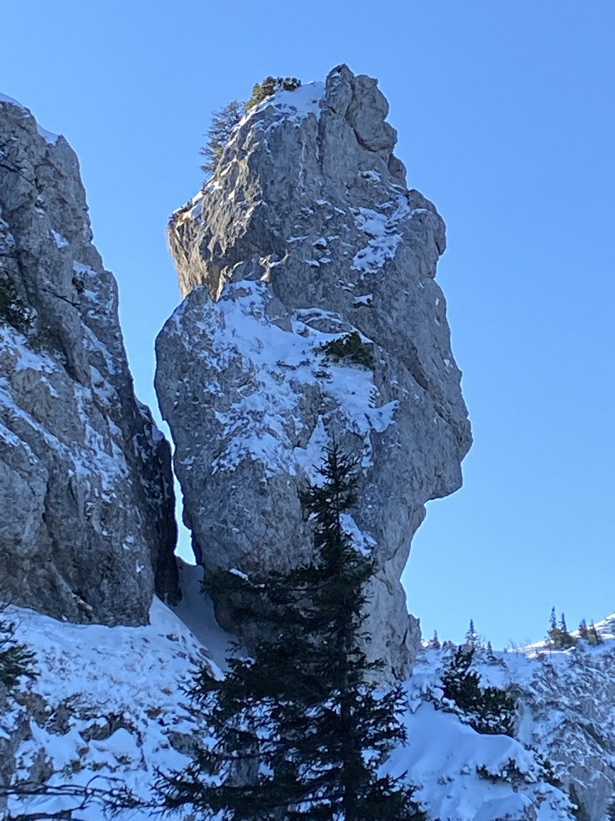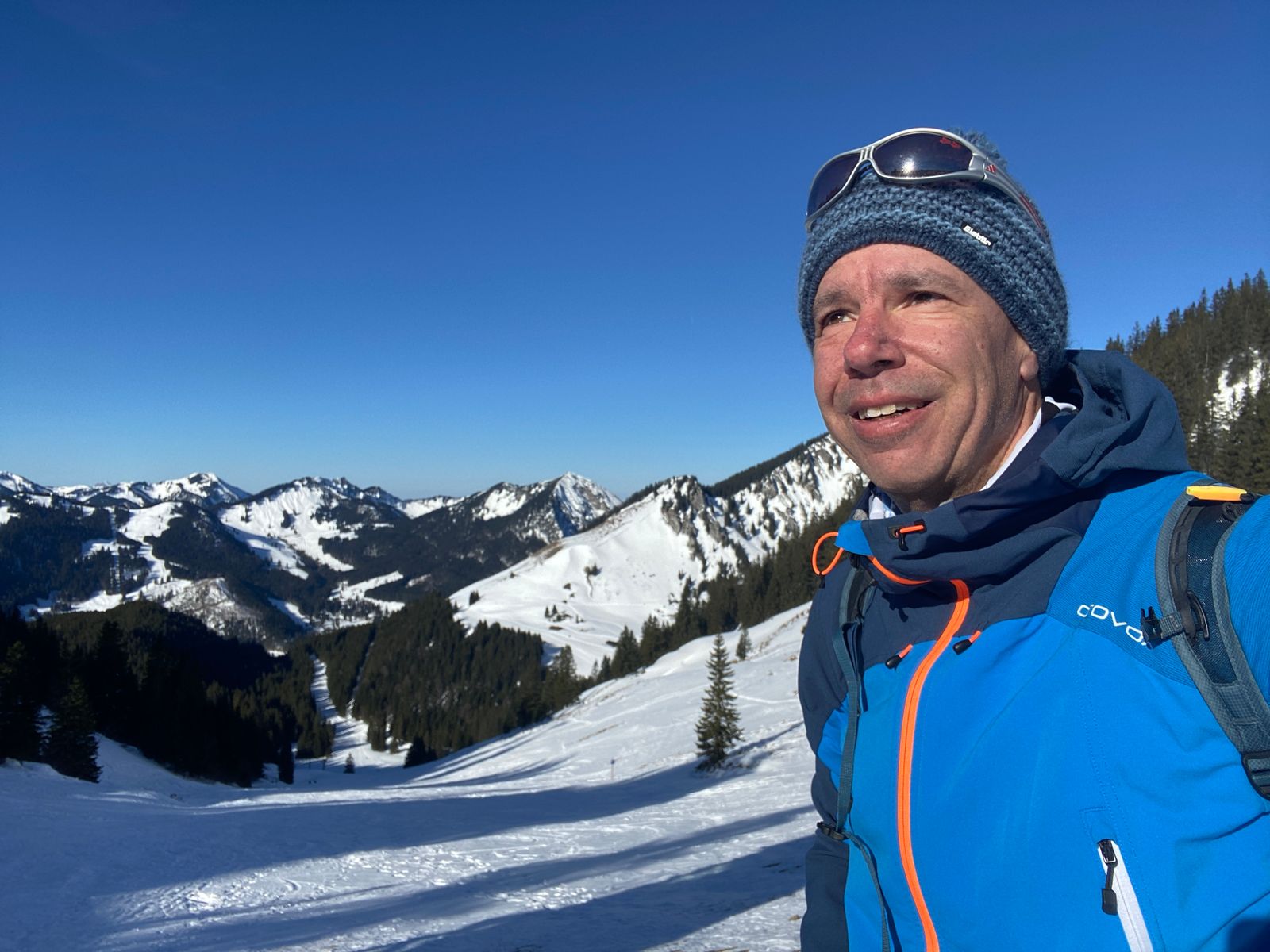 Also, Felle drauf und los. Ich drehte meine übliche Runde: über die Dreitannenroute in den Firstalmkessel und von hinten auf den Stümpfling, dann die erste Abfahrt - den herrlich pulvrigen Osthang hinunter, weiter auf der unten unangenehm harschigen Stümpflingabfahrt Richtung Valepp bis Höhe Albert-Link-Hütte, dann der zweite Aufstieg über die Grünseeroute, bei der richtiges Skitouren-Ambiente herrscht (keine Liftanlagen und Schneekanonen). An den Almen beim Grünsee habe ich mal die Schneehöhe gemessen, 60 cm.