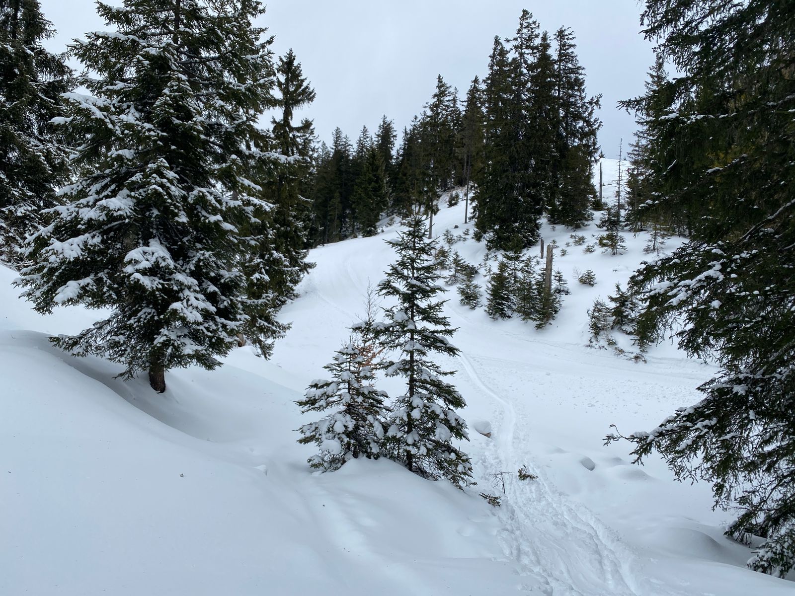 Fazit: Es ging unerwartet gut, bis auf die harschigen Passagen im unteren Teil der Abfahrten. Heute um die 50 Leute unterwegs, Winterwunderlandatmosphäre. Kein nennenswerter Steinkontakt. Wenn es nochmal draufschneit, wird es richtig gut. Jenseits der steinarmen Pisten ist die Schneedecke aber meist noch nicht skitourentauglich.