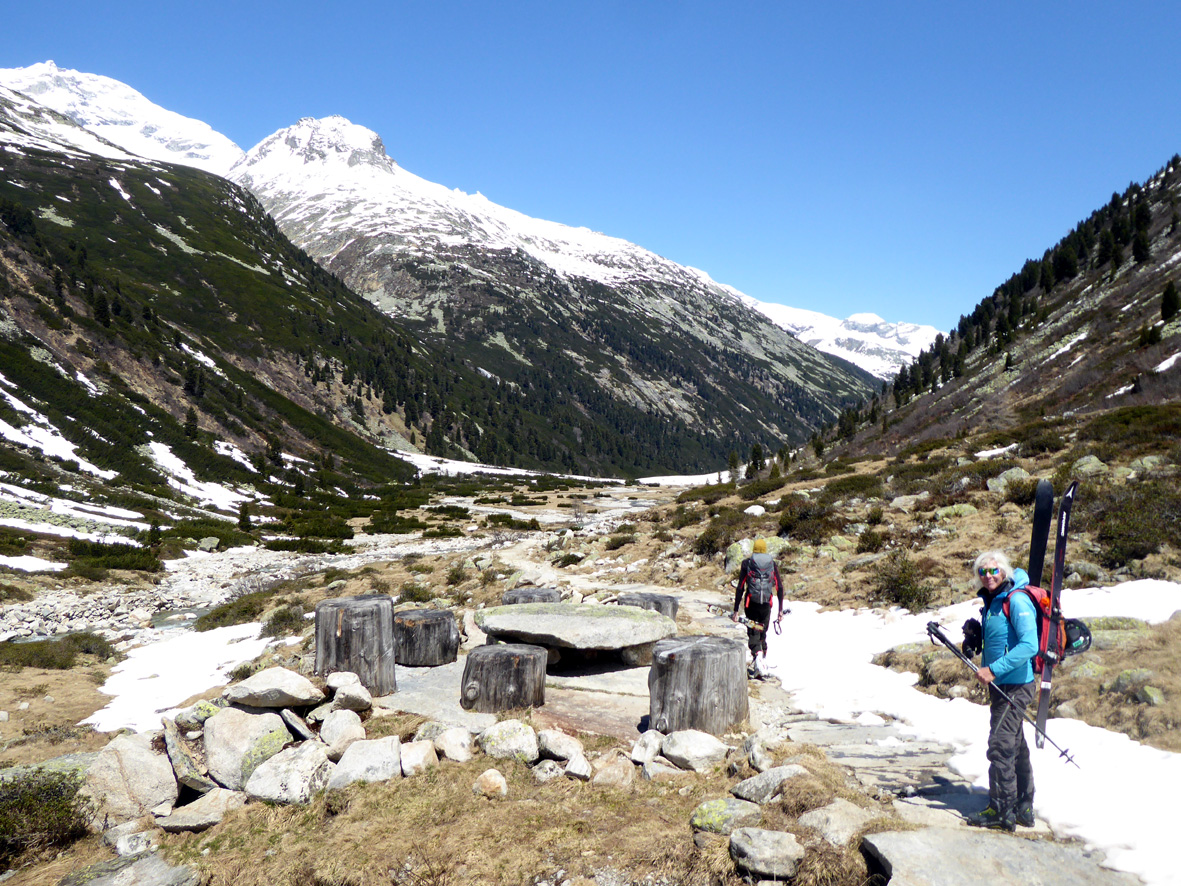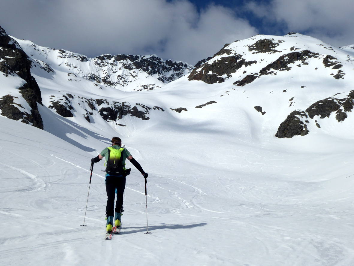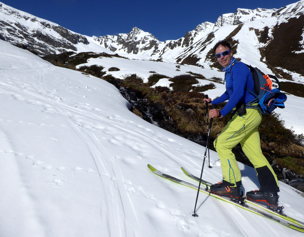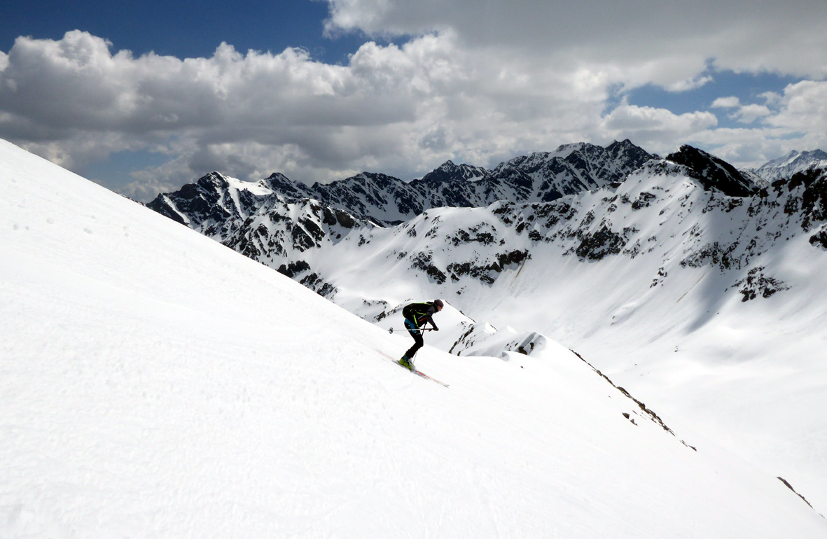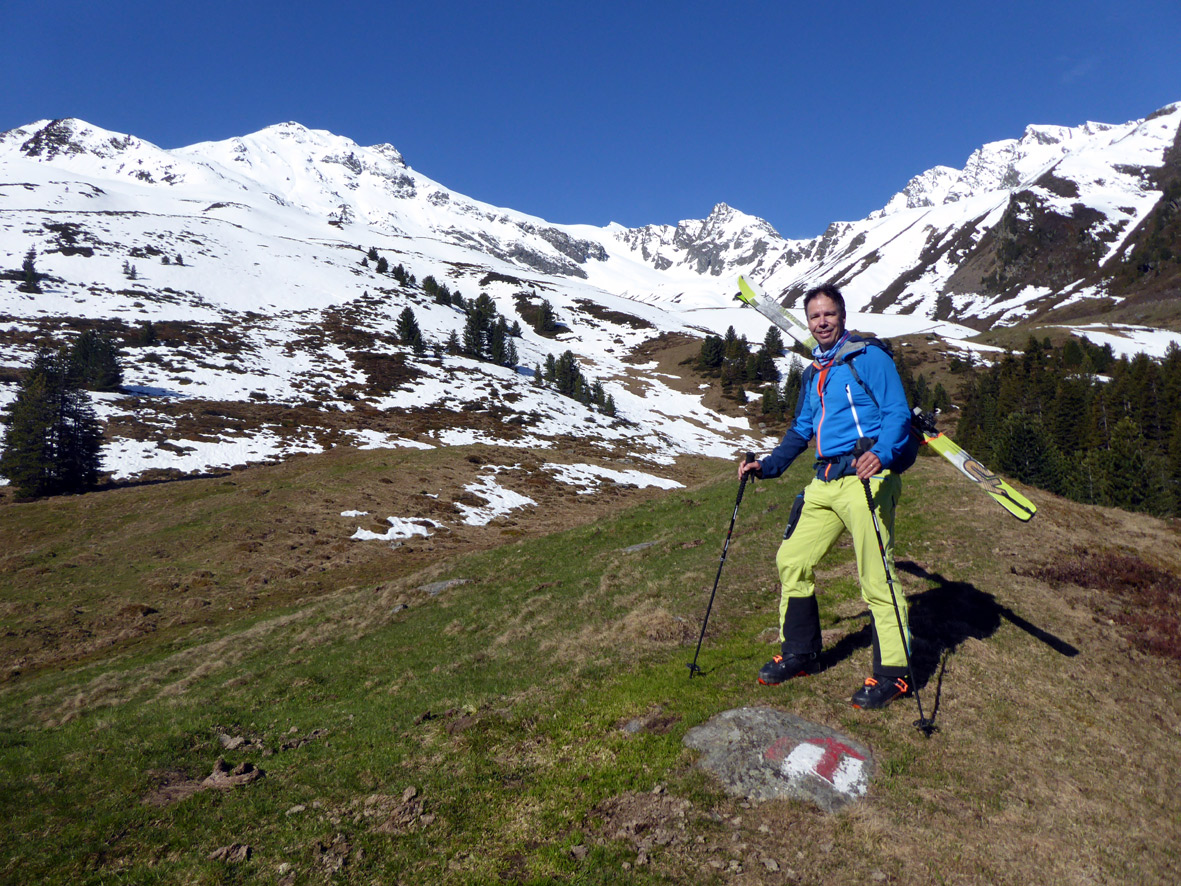 Vom Parkplatz am Alpengasthof Praxmar (hat geöffnet fürs Apres-Weißbier) muss man die Ski nur die erste "grüne Stufe" hinauftragen, etwa 20 Minuten. Ab dann durchgehende Schneedecke mit sehr guten Verhältnissen: oben windverpresster Pulver, unten herrlicher Firn. Und kein Buckelpisten-Massenandrang mehr wie im Hochwinter: Heute waren insgesamt sieben Skitourengeher unterwegs.
