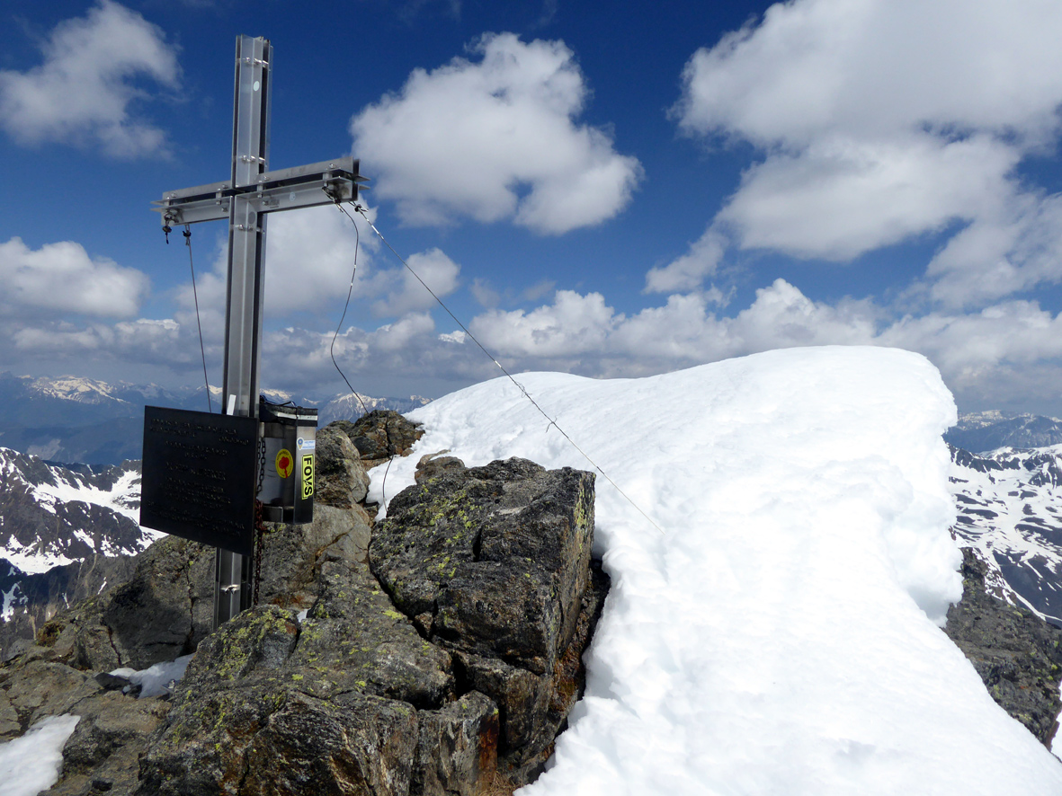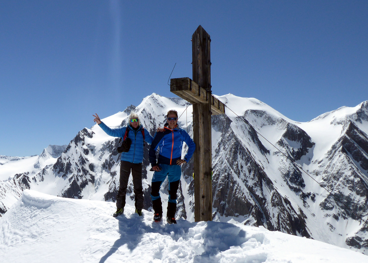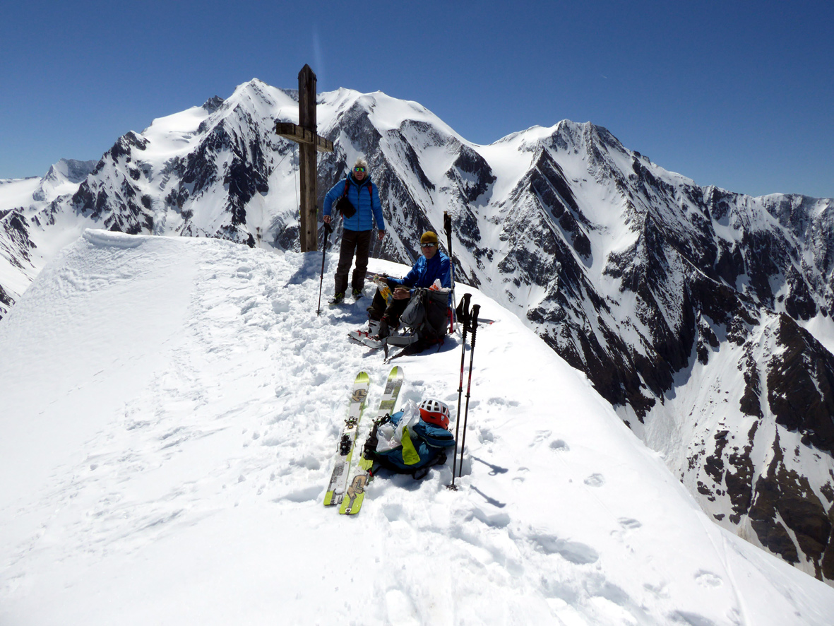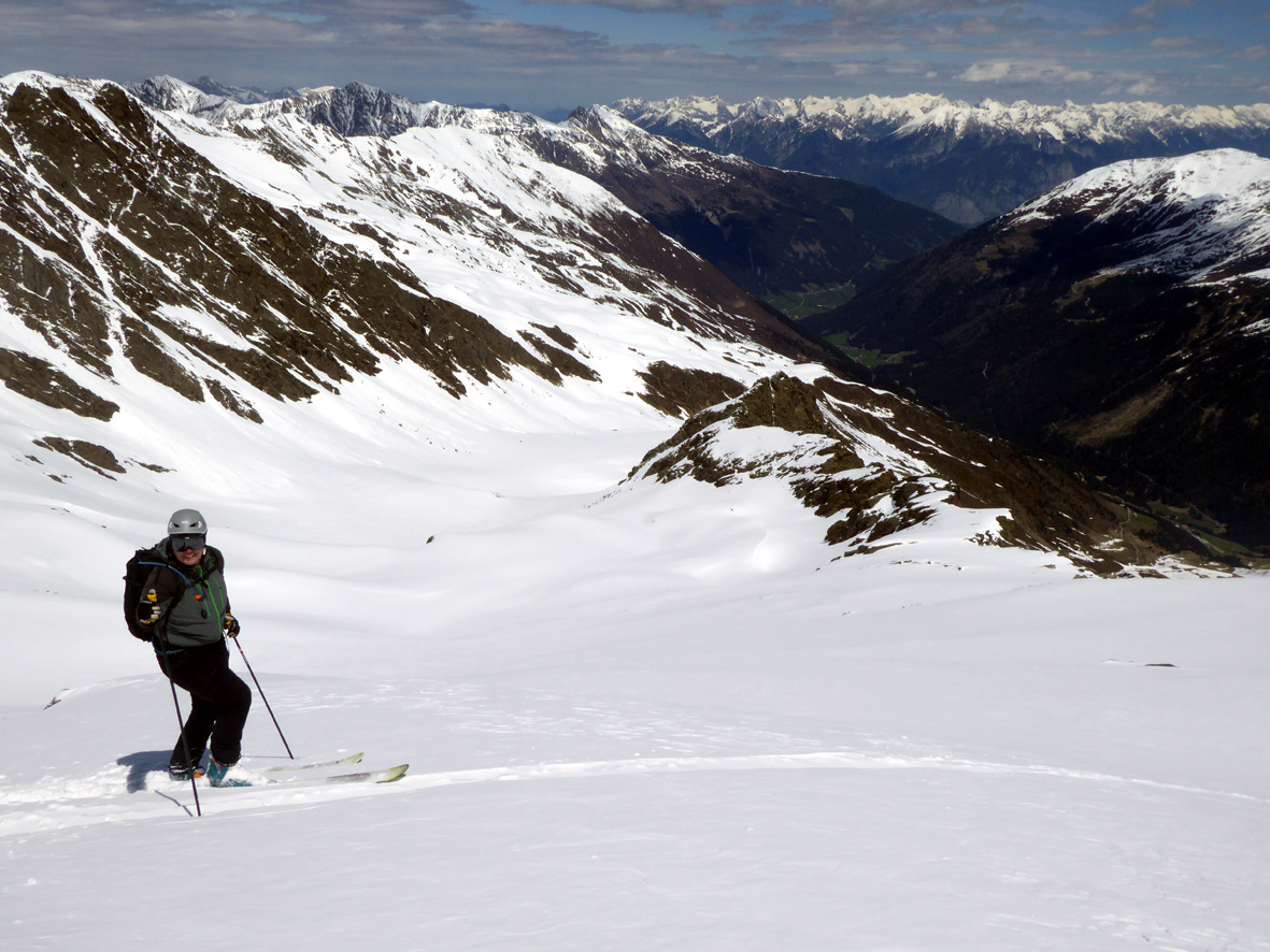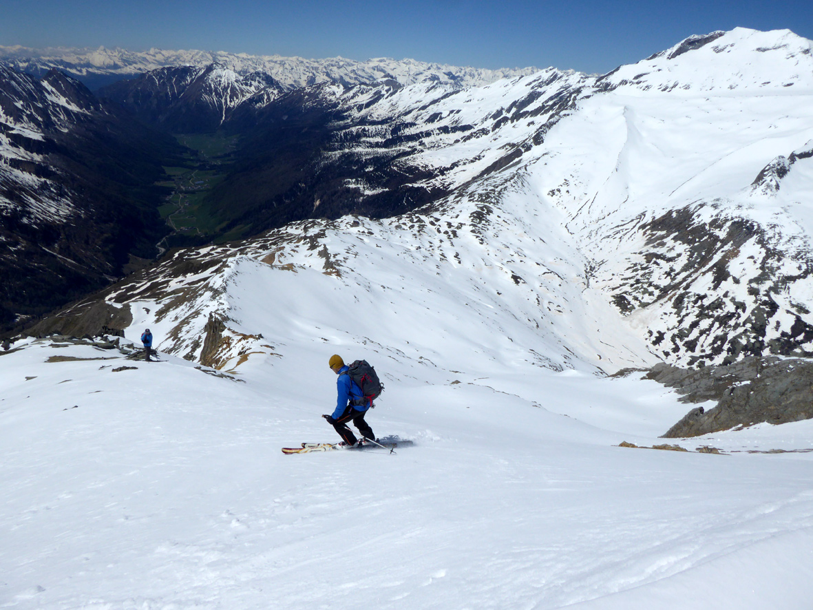 Vom Zamsgatterl am Schlegeis knapp 3 km Fußmarsch, ab dann mit Skiern durchgehend Schnee bis zum Gipfel. Die Westexposition blieb im Aufstieg recht hart, Harscheisen waren kein Luxus im ewa 35 Grad steilen Gipfelhang. Sehr konzentriertes Steigen nötig, mit Skiern bis zum aussichtsreichen Gipfel auf der Grenze zwischen Österreich und Italien. Abfahrt um 12 Uhr - oben noch hart, ab etwa 2700 m perfekter Firn. Geringes Lawinenrisiko heute, eher die Gefahr des Abrutschens im Aufstieg.