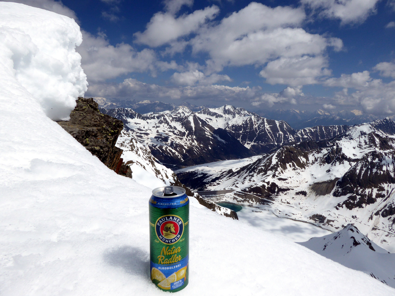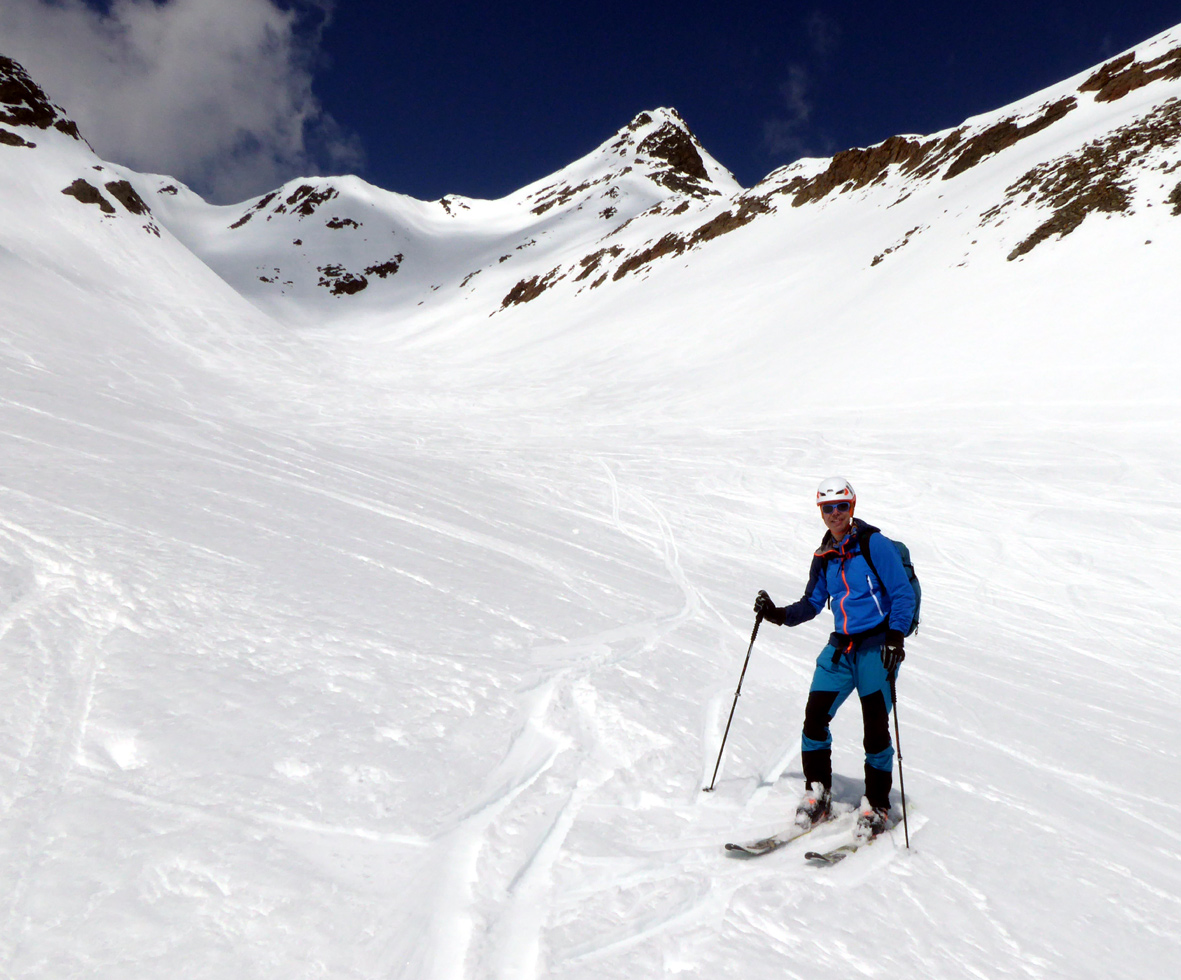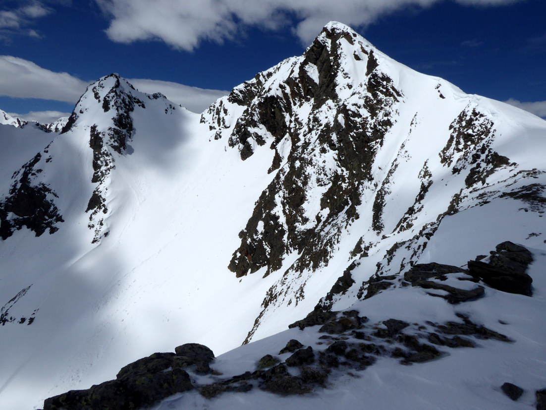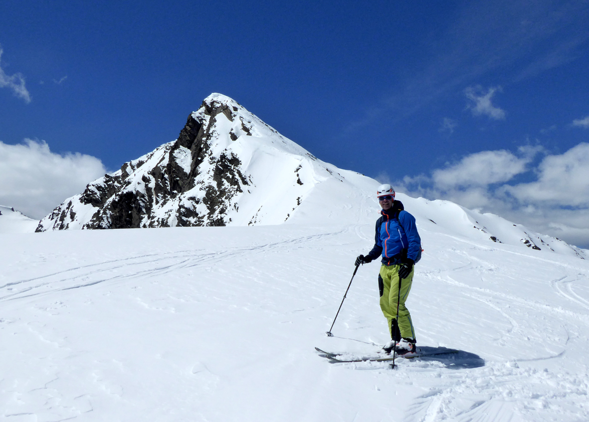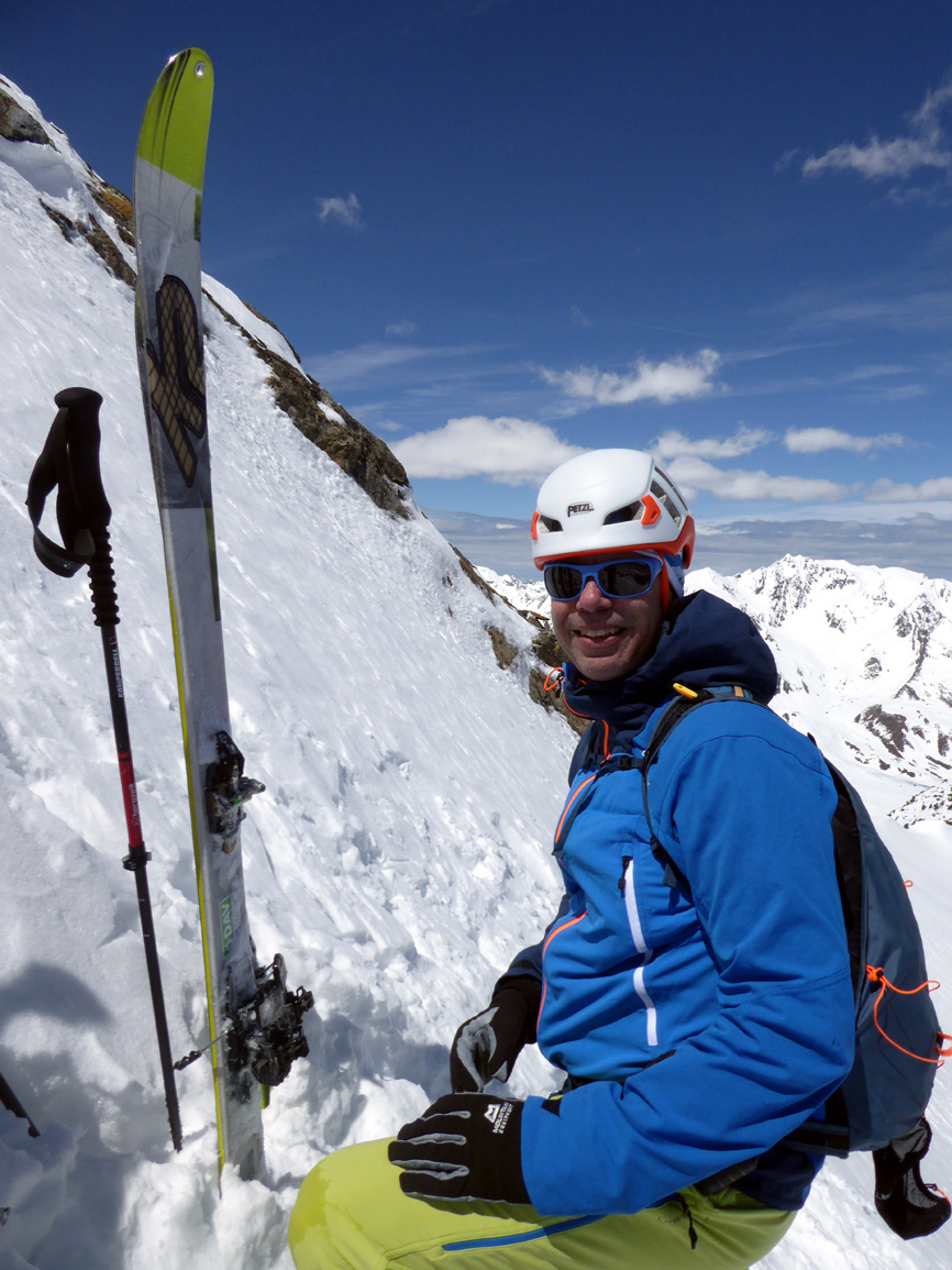 Vom Zamsgatterl am Schlegeis knapp 3 km Fußmarsch, ab dann mit Skiern durchgehend Schnee bis zum Gipfel. Die Westexposition blieb im Aufstieg recht hart, Harscheisen waren kein Luxus im ewa 35 Grad steilen Gipfelhang. Sehr konzentriertes Steigen nötig, mit Skiern bis zum aussichtsreichen Gipfel auf der Grenze zwischen Österreich und Italien. Abfahrt um 12 Uhr - oben noch hart, ab etwa 2700 m perfekter Firn. Geringes Lawinenrisiko heute, eher die Gefahr des Abrutschens im Aufstieg.