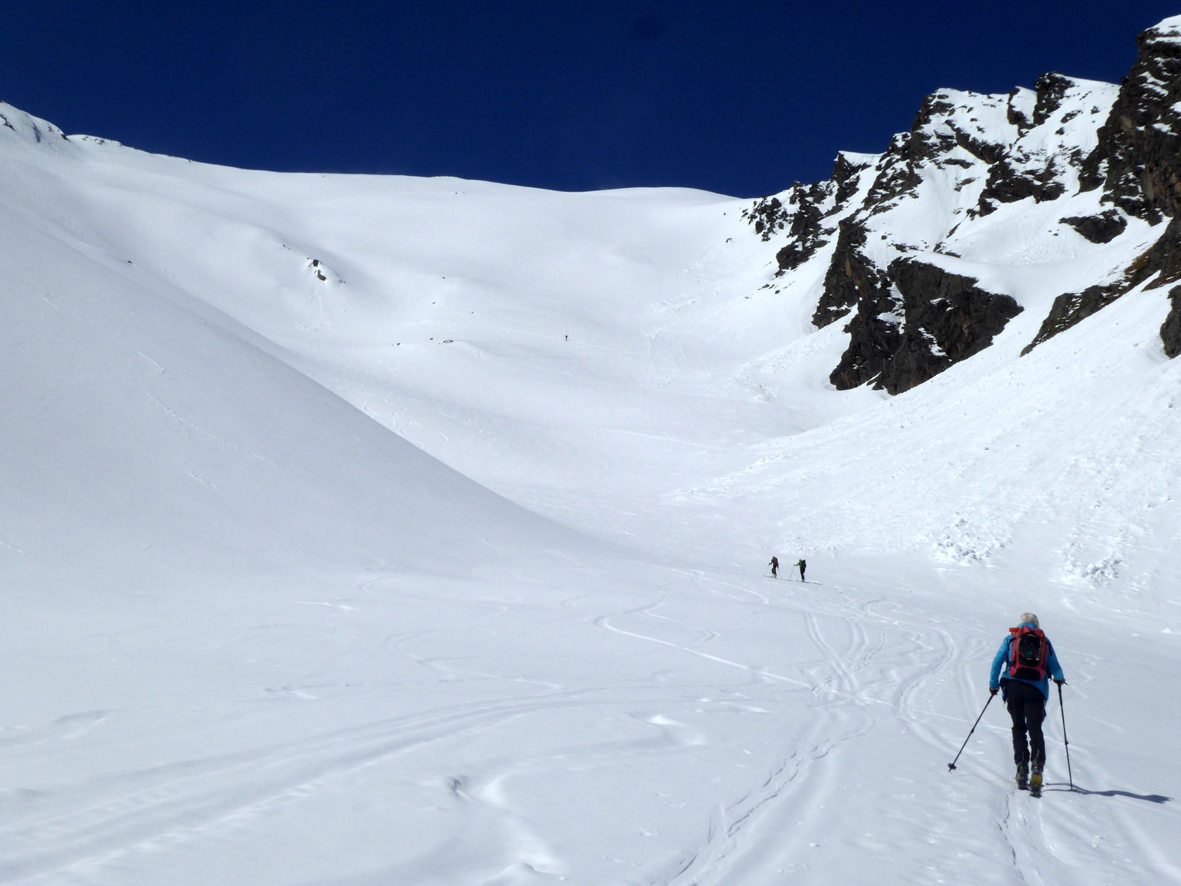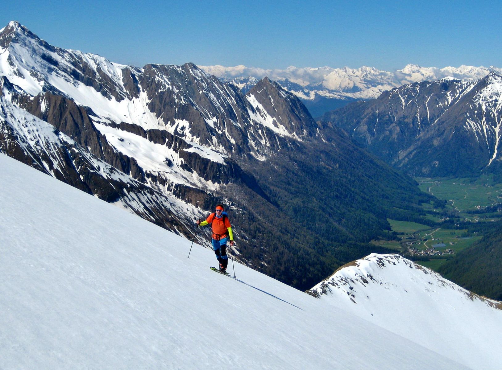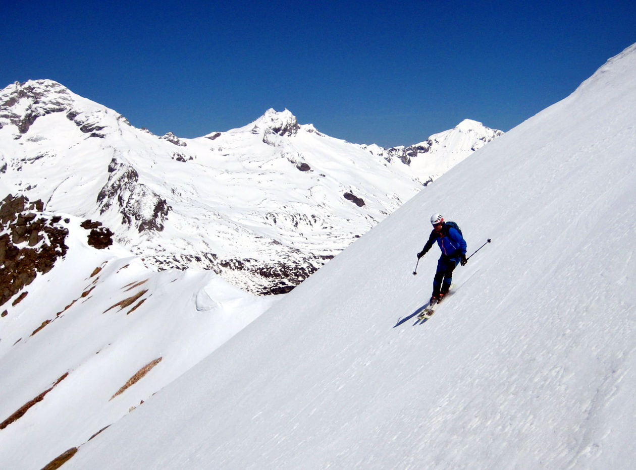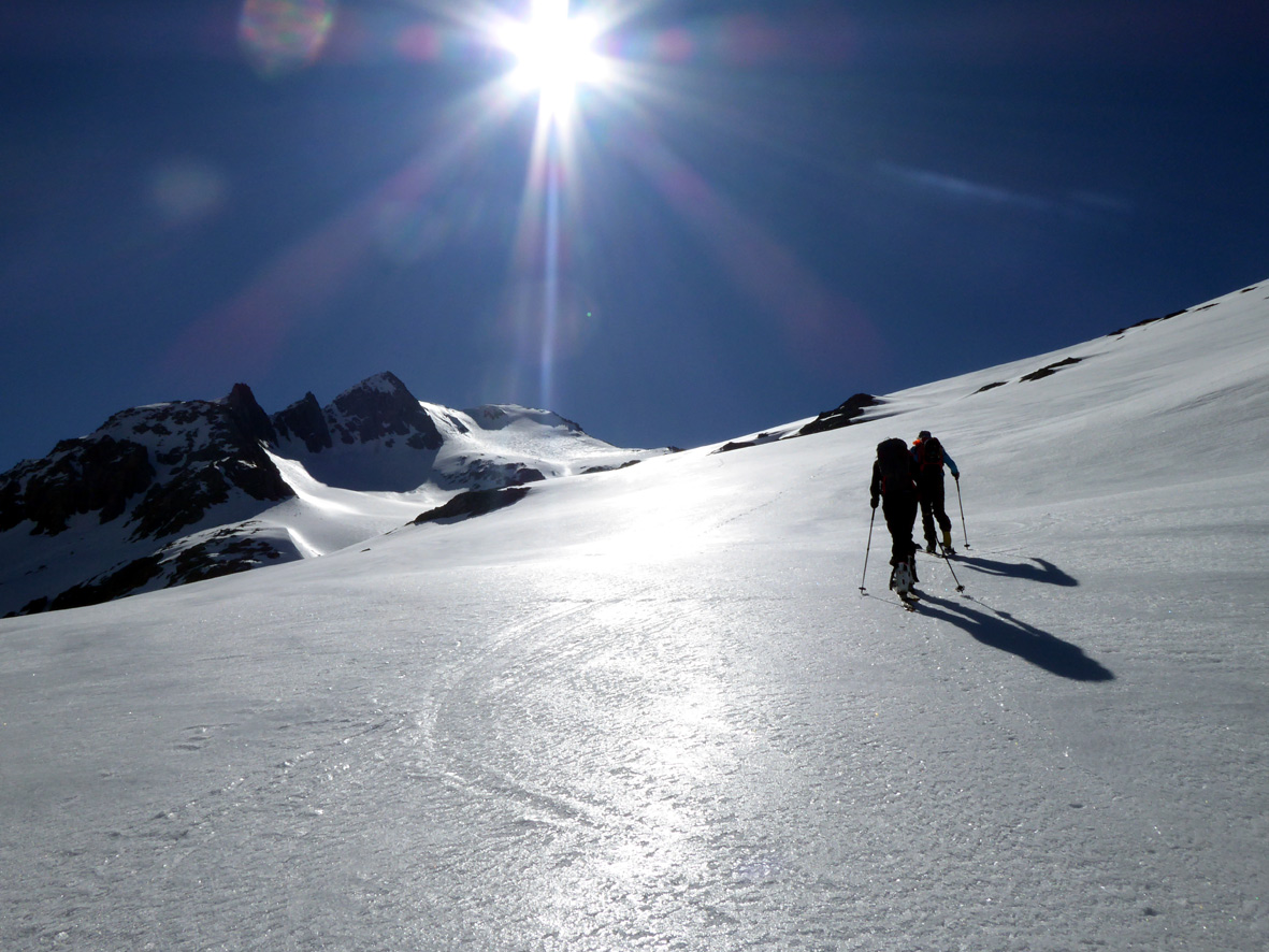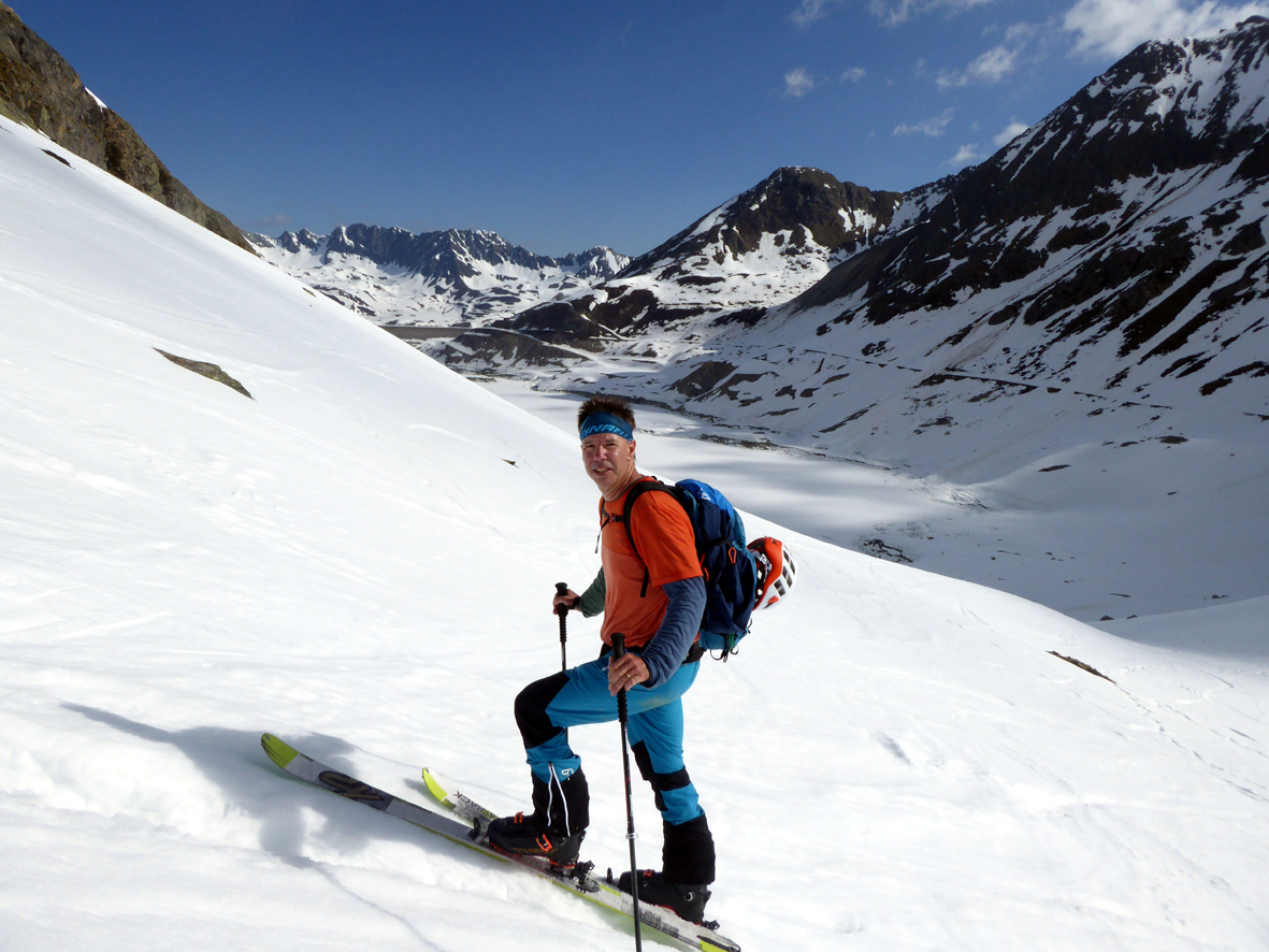 Vom Zamsgatterl am Schlegeis knapp 3 km Fußmarsch, ab dann mit Skiern durchgehend Schnee bis zum Gipfel. Die Westexposition blieb im Aufstieg recht hart, Harscheisen waren kein Luxus im ewa 35 Grad steilen Gipfelhang. Sehr konzentriertes Steigen nötig, mit Skiern bis zum aussichtsreichen Gipfel auf der Grenze zwischen Österreich und Italien. Abfahrt um 12 Uhr - oben noch hart, ab etwa 2700 m perfekter Firn. Geringes Lawinenrisiko heute, eher die Gefahr des Abrutschens im Aufstieg.