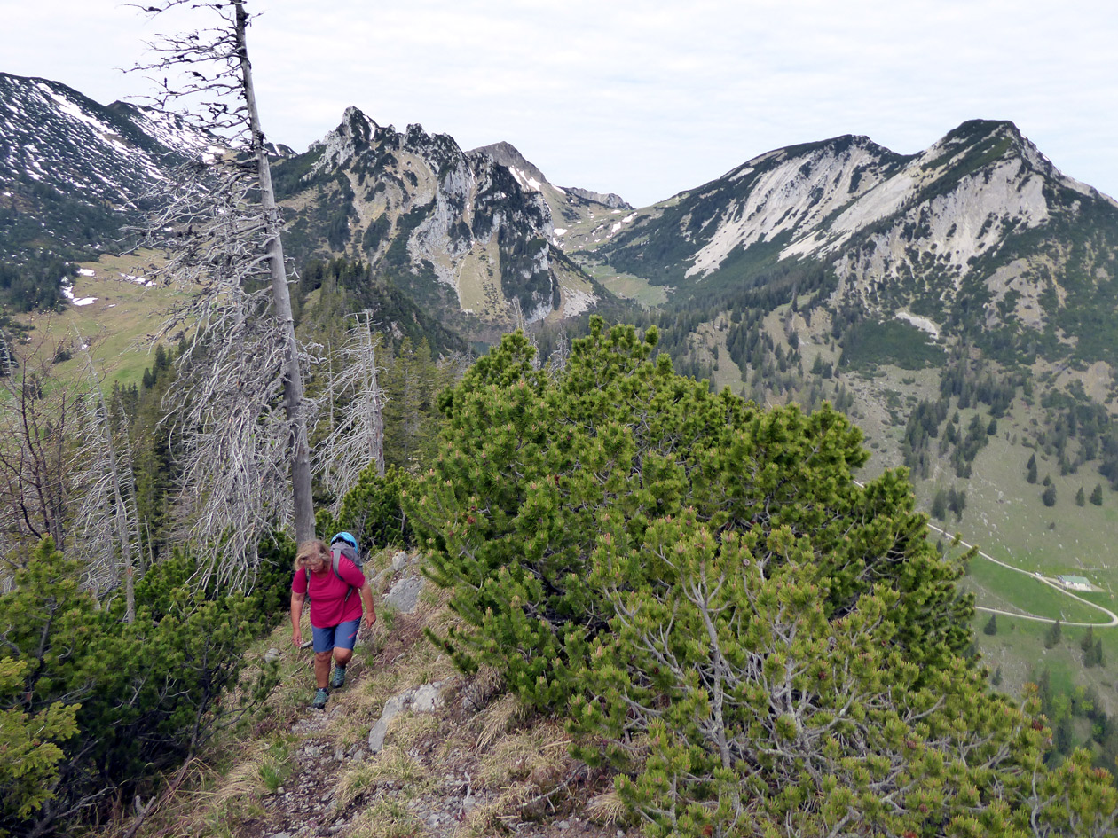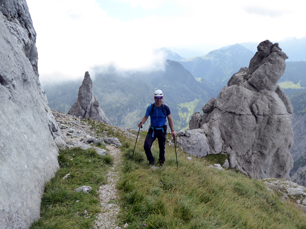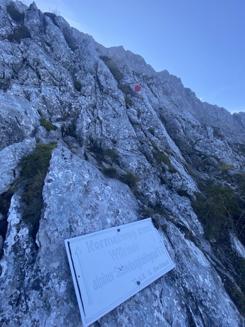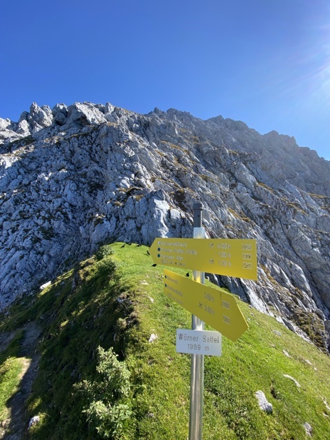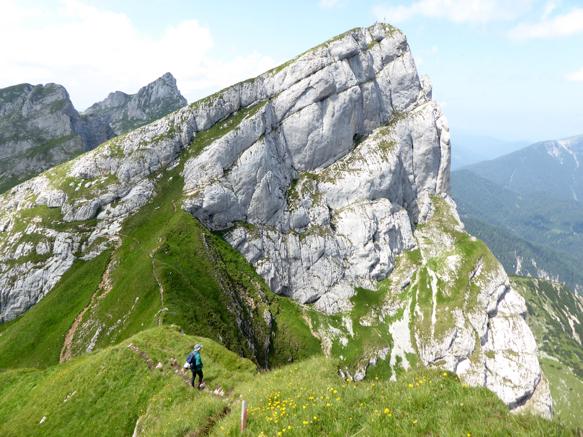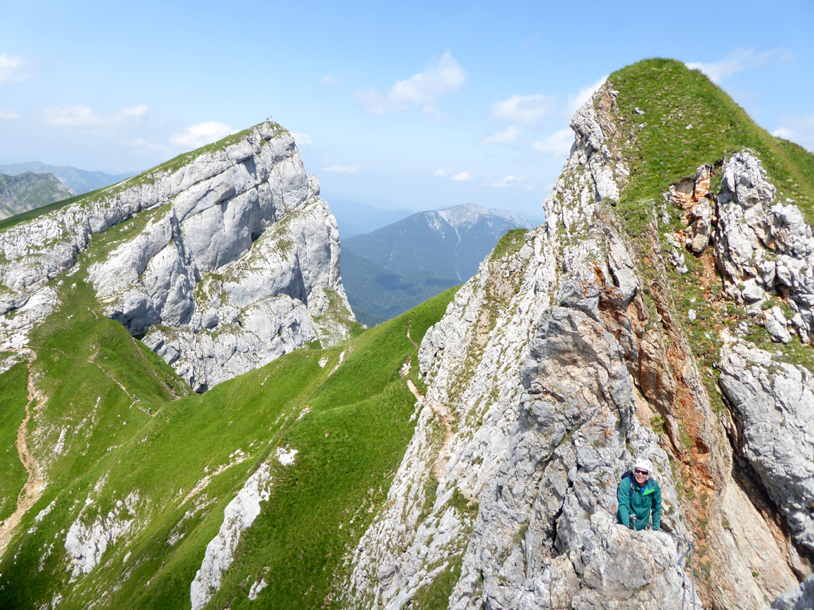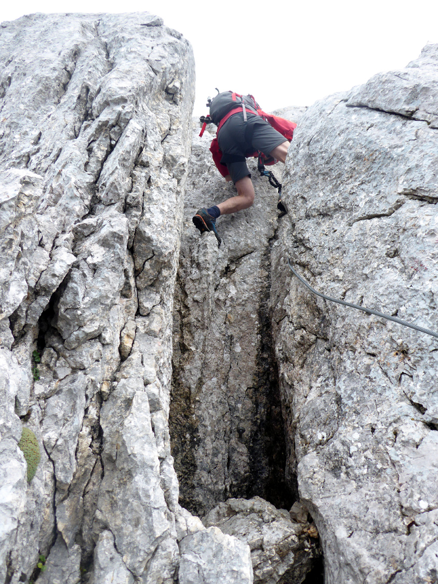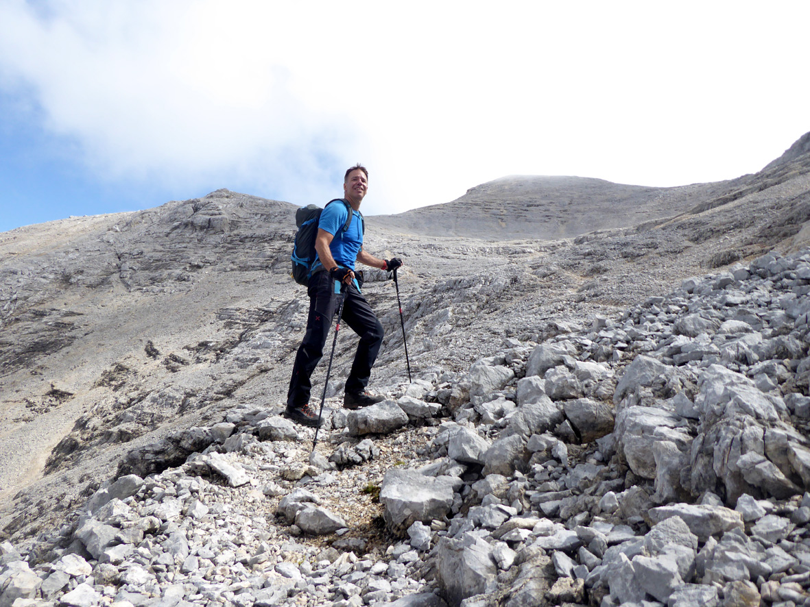 Das Pedelec ist nützlich für die ersten 600 Hm, weiter zu Fuß zum Wörnersattel, nun Steinschlaghelm auf und 500 Hm durchaus anspruchsvoll hinauf; das Klettergelände ist nie schwieriger als II, verlangt aber permanent höchste Konzentration.
