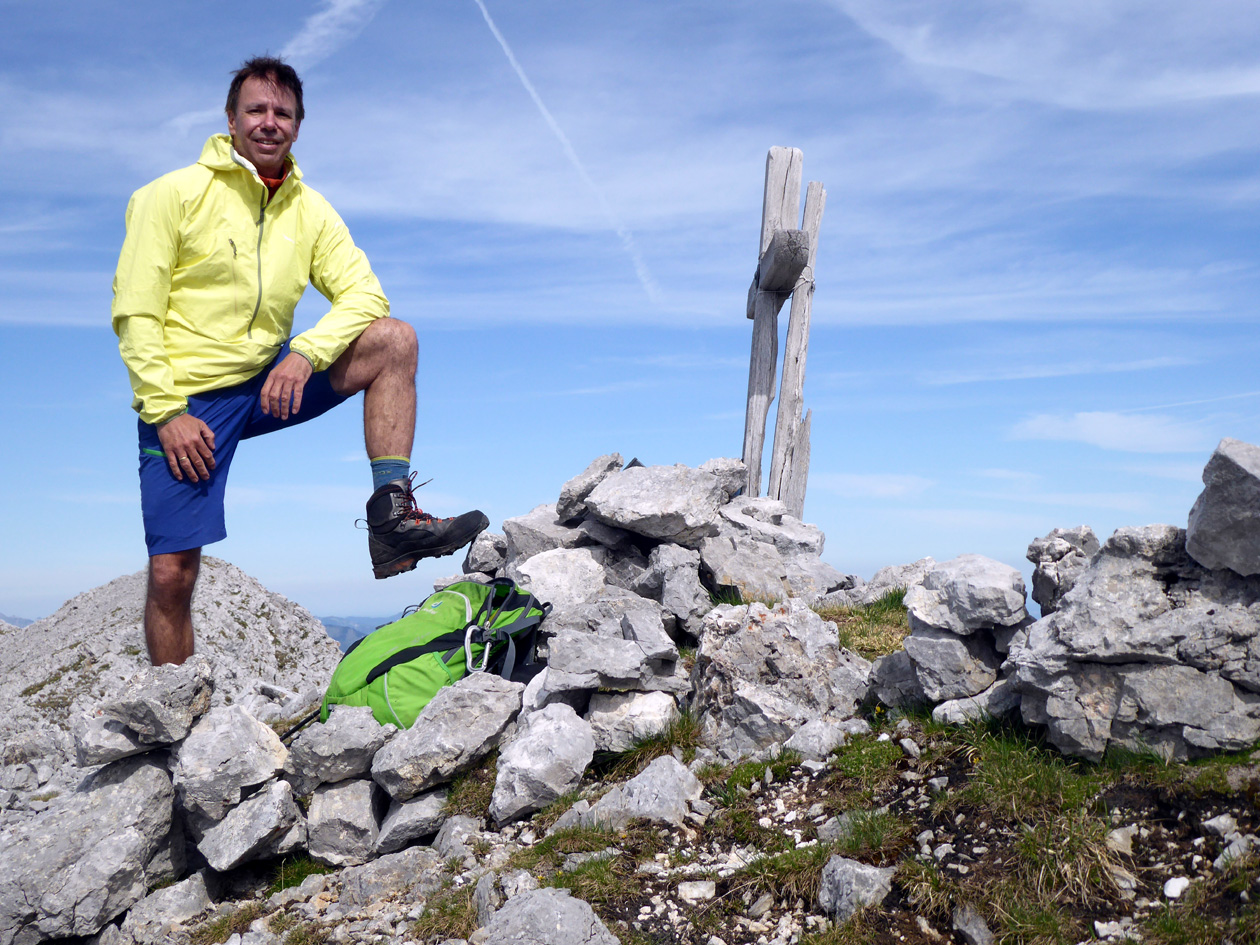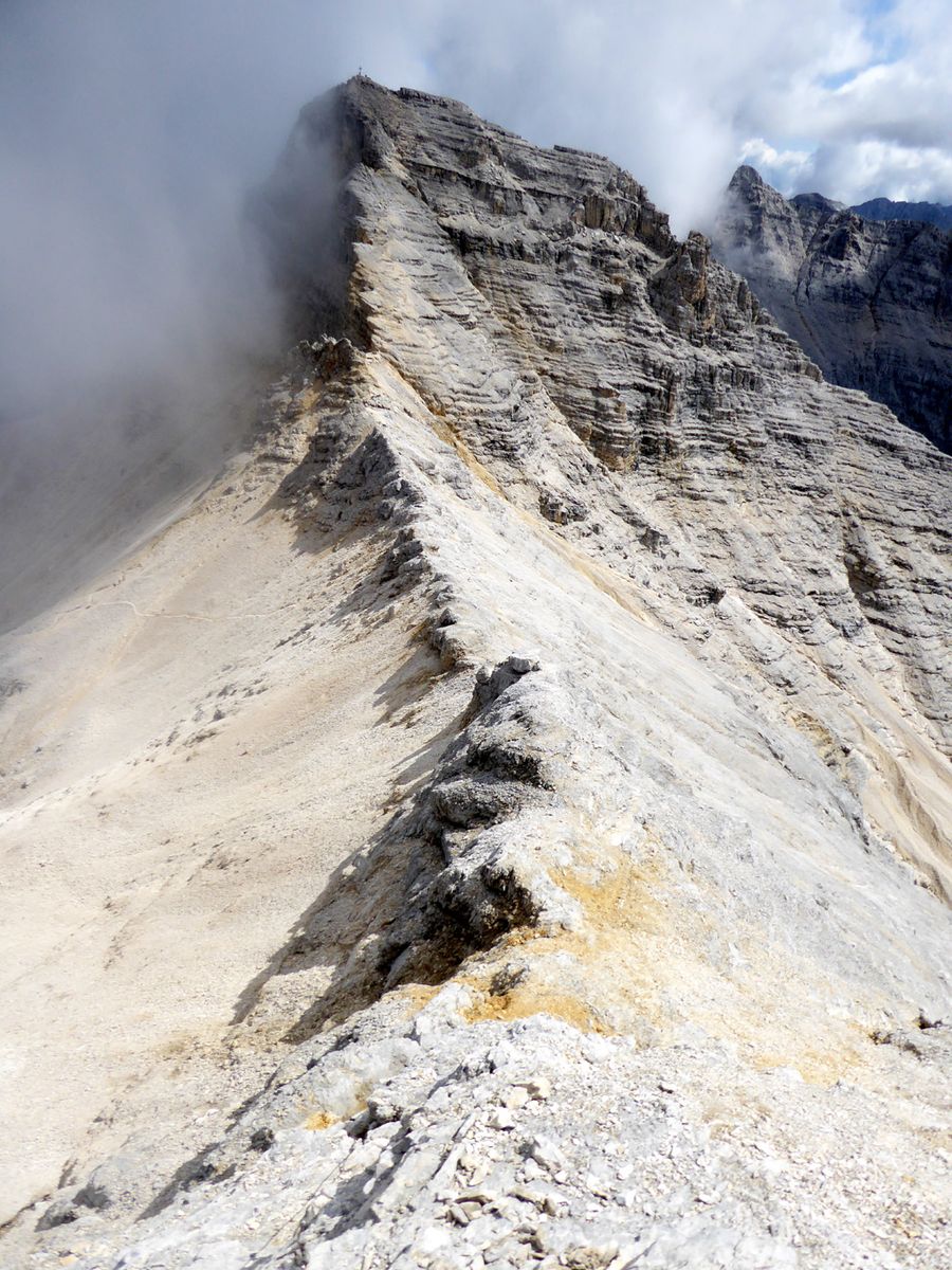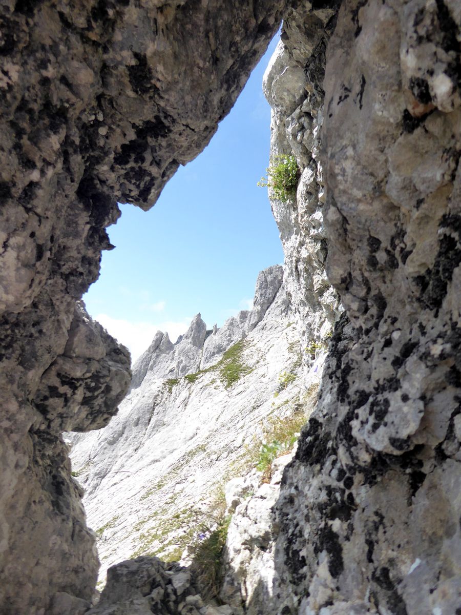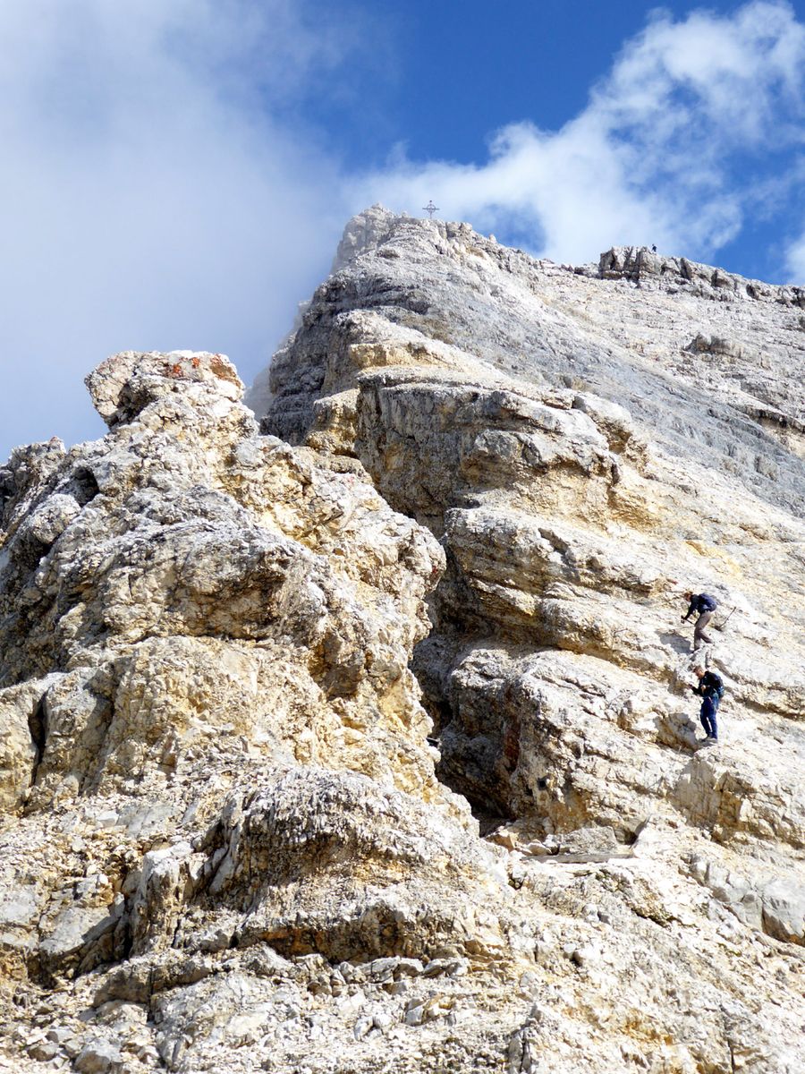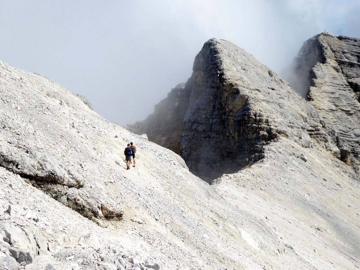 Das Pedelec ist nützlich für die ersten 600 Hm, weiter zu Fuß zum Wörnersattel, nun Steinschlaghelm auf und 500 Hm durchaus anspruchsvoll hinauf; das Klettergelände ist nie schwieriger als II, verlangt aber permanent höchste Konzentration.