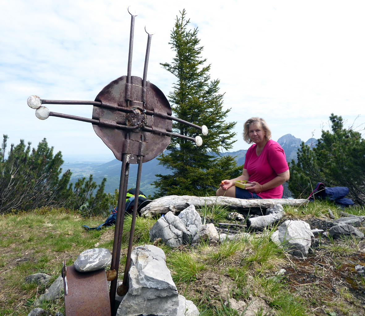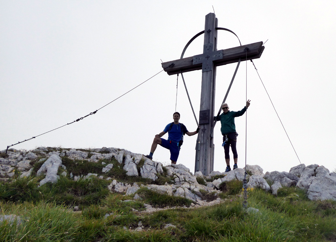 Die Tour an sich: prima: Über den alten Normalweg auf die Haidachstellwand, im Abstieg über den ersten Teil des Fünf-Finger-Klettersteigs hinunter zum Krahnsattel (B/C), dort erste Brotzeitpause. Dann rüber zum Roßkopf und den steilen Klettersteih mit senkrechten bis abdrängenden Passagen (C/D) hinauf zum Gipfelkreuz, kurzer Abstieg ins Wandergelände - die restlichen drei Klettersteiggipfel haben wir uns fürs nächste Mal aufgehoben und lieber ein flüssiges Brot aus der Dose genossen.