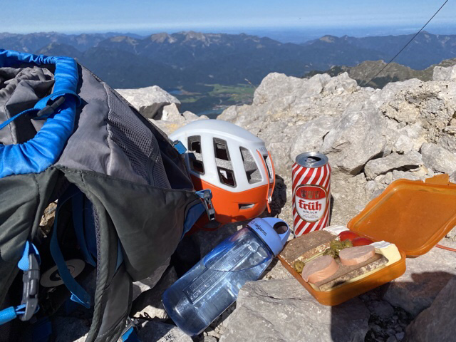 Und so gut wie heute (natürlich auch in den nächsten Tagen) sind die Verhältnisse nicht immer. Man kann sie getrost als optimal bezeichnen. Nach er erfrischenden Klamm um 7.45 Uhr ein Frühstücksradler (5,20 Euro) in der neuen Höllentalangerhütte, weiter zu Leiter un Brett (wo der Stau sich vor uns wie von Geisterhand aufgelöst hatte). Über den grünen Buckel zum Gletscher, der früh beginnt und eine gute, teils etwas steil angelete Stapfspur hat. Ich bin alles ohne Steigeisen/PIckel gegangen - wer sich unsicher fühlt, sollte nicht so spartanisch unterwegs sein. Die Randkluft: am oberen (linken) Einstieg perfekt einfach, die beiden Varianten rechts davon nicht erreichbar. 8 Minuten Stau an der Randkluft das war für solch einen Schönwettersamstag okay. Danach, im Klettersteig, gab es einige Bremser; u.a. einen Holländer, der zusätzlich zum Klettersteigset eine Steigklemme ins Drahtseil einhängte und eeeewig brauchte. Da half nur beherztes und ungesichertes Überholen - nach sechseinhalb Stunden Aufstieg war der Gipfel erreicht, ohne die Stockungen wäre es schneller gegangen.