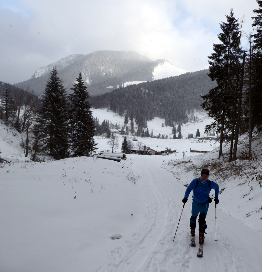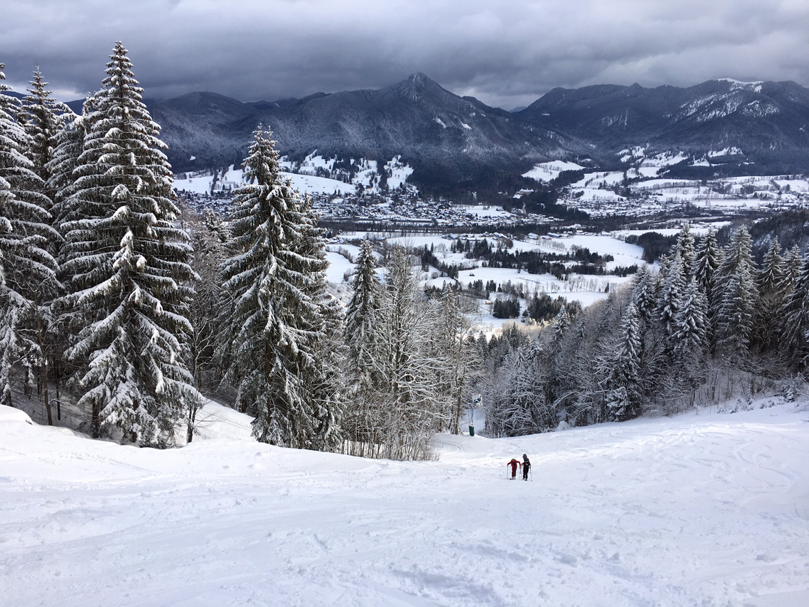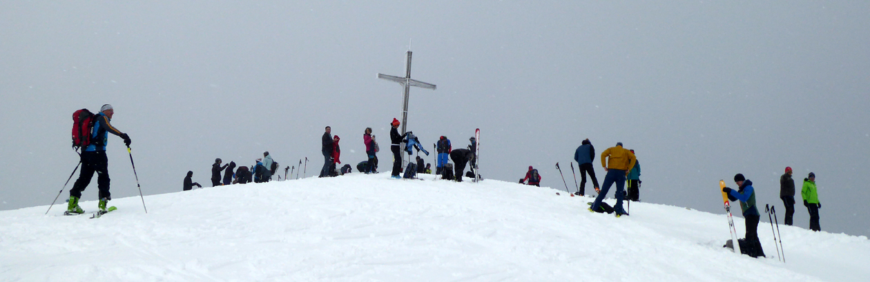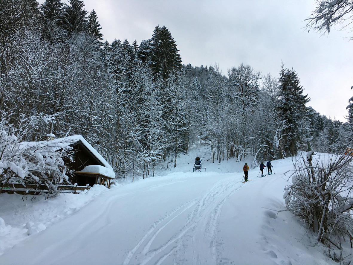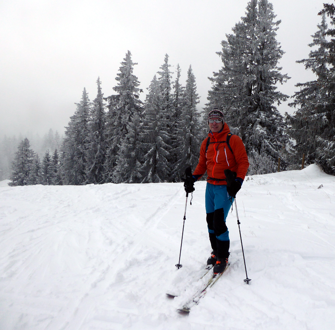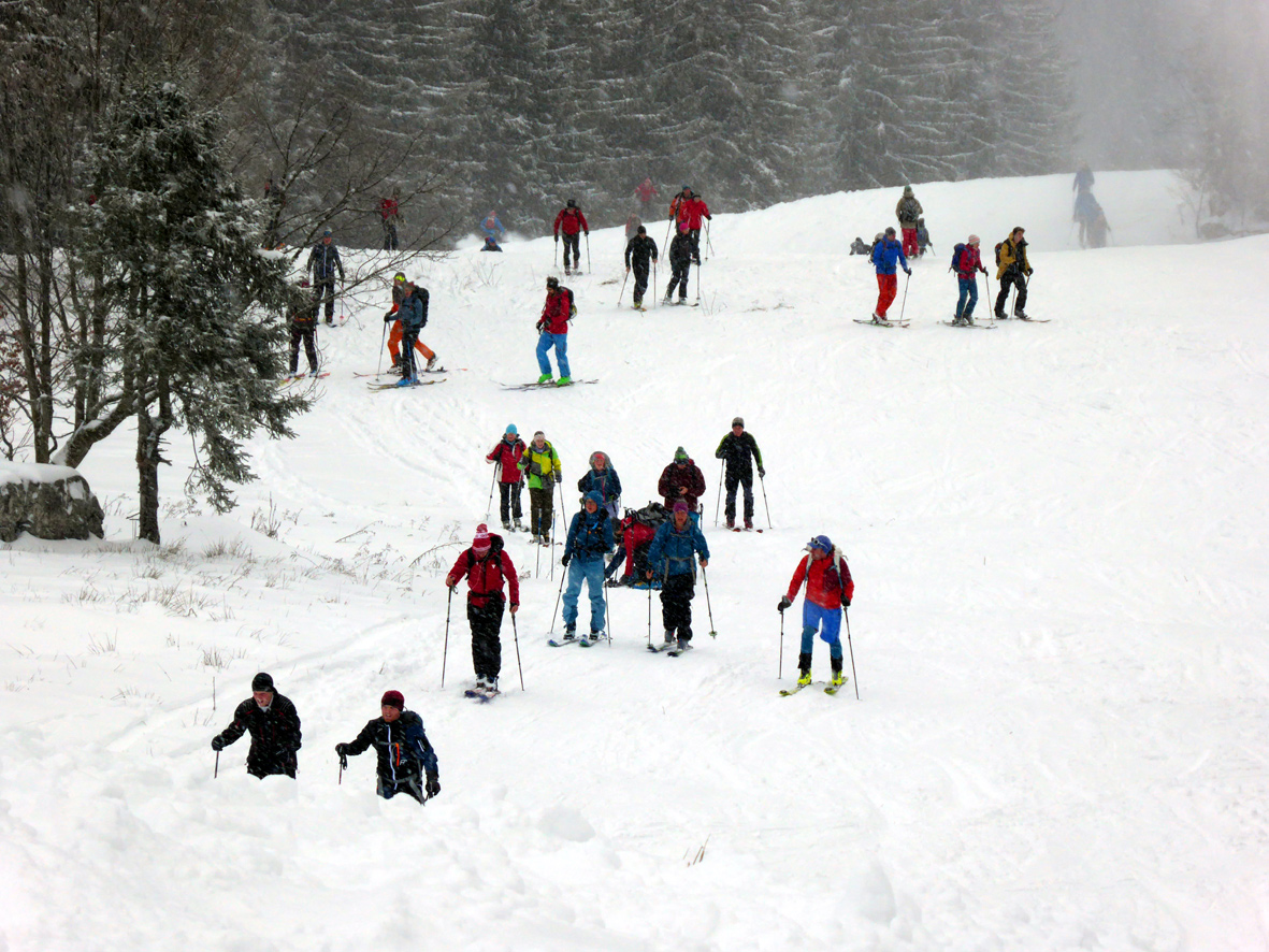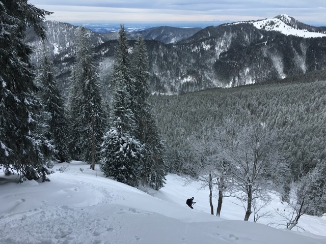 Tourenverhältnisse: Es gibt ja schon zwei aktuelle Posts zum Spitzingsee (vom Fasangartner und vom Bernhard), also fasse ich mich kurz. Wir haben heute versucht, uns jenseits der Massen zu bewegen (gefühlt waren sicher 2500 Leute unterwegs) - Start schon um 8.30 Uhr am Parkplatz Kurvenlift, der zu diese Zeit noch relativ frei war. Aufstieg über die Dreitannenroute (oberhalb vom Firstalmkessel) zum Stümpfling, erste Abfahrt bis auf Höhe Albert-Link-Hütte, Felle wieder rauf und dann zunächst links Richtung Stolzenberg zur Unteren Haushamer Alm, dort Querung zur Grünseealm und (nun linkshaltend) am Grünsee oberhalb vorbei auf den Roßkopf. Abfahrt über Nordhang und Stümpflingpiste zum Kurvenlift, insgesamt gut 900 Höhenmeter. Bei unseren Aufstiegsvarianten war es vergleichsweise einsam (gegenüber dem Bandwurm auf der Stümpflingpiste). Bis zu 20 cm Neuschnee, der sich super fahren ließ. Schneekanonen laufen auch untertags, da muss man durch... Sonne ließ sich, entgegen der Prognose, kaum blicken - dafür hatten wir durch den zeitigen Start teils noch halbwegs unverspurte Pulverhänge. Bei der Heimfahrt um 12.20 Uhr fahren alle Parkplätze rappelvoll und der Bergaufstau der Langschläfer reichte die halbe Spitzingseestraße hinunter.