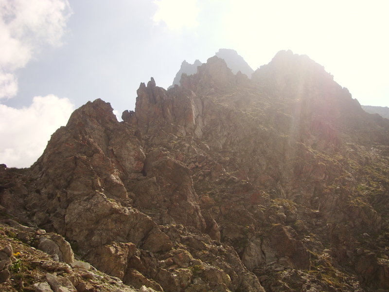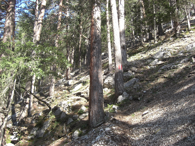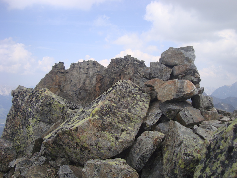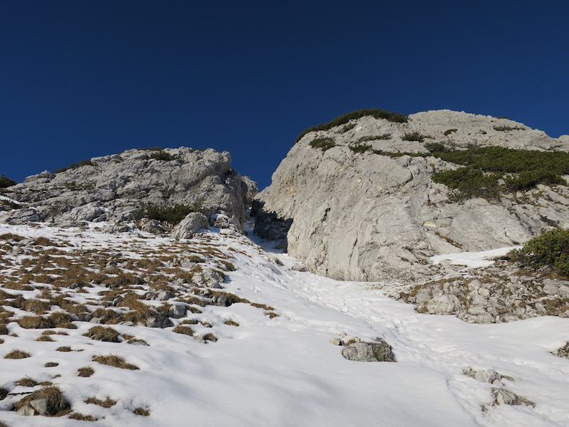 In Nordwestlicher Verlängerung der Hütte beginnt die Gipfelrinne, welcher der Normalweg zum Schluss quert. Diese bin ich von unten gegangen. Obwohl die Rinne schattig war, war der Schnee, bis auf wenige Stellen, weich. Trotz alledem gangbar, wenn auch sehr beschwerlich. Pickel auf jeden Fall empfehlenswert. Übergang zum Signalgipfel habe ich nicht gemacht. Nordseitig wird der Schnee sofort pulvrig.