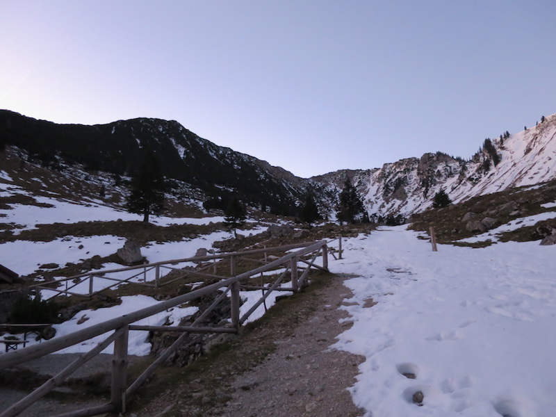 Tourenverhältnisse: durchwachsen. Schnee ab 1500 Metern, geschlossene Schneedecke ab ca. 1650 Meter. Der Aufstieg über die Achterköpfe ist, wie auch der Normalweg auf den Gipfel, südöstlich ausgerichtet. Dem entsprechend liegt sehr wenig Schnee, teils keiner. Die Schneedecke, war trotz wolkenloser Nacht nicht tragend. Gespurt bis Abzweig Arnspitz-Payramide. Abstieg durch den Haselrinner ebenfalls gespurt. Die alten Pfadspuren sind noch gut erkennbar.