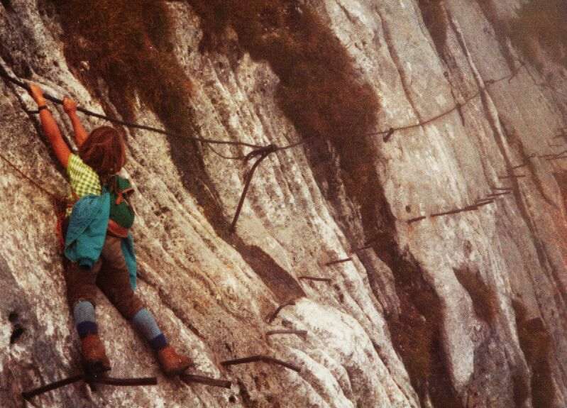 - Kind hat zusätzlich Klettersteigkarabiner am Brustgeschirr angehängt, zur Selbstsicherung, Benutzung üben