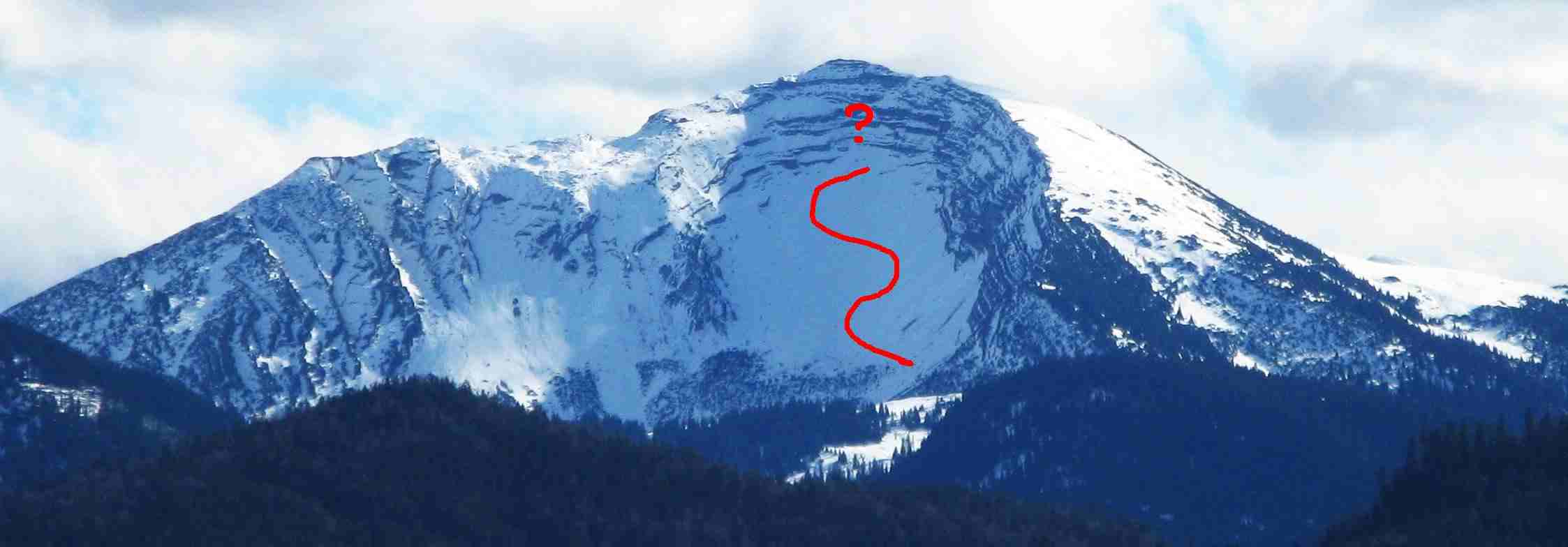 Ein paar Jahre vorher um die selbe Zeit, Schneelage dürftig (ein wenig geschneit hatte es am Vortag), bin ich auch so runtergefahren, und zwar - wie 2 Tage vorher 2 Burschen aus der Gegend, die mir in der Hütte den Tip gegeben haben - gleich von dem flachen Stück aus, wo auf dem Bild die Spuren sind (wir sahen damals keine mehr) ; meine Begleiterin hat oben gewartet ("die Nummer ist: 112") . Vermutlich durch die Erschütterung löste sich etwas oben in den Gipfelfelsen (damals mit weniger Schnee als im Bild) und kam auf mich zu; nichts Gewaltiges, ein Rinnsal, 2-3 m breit, kaum fußhoch. Ich dachte (und dachte mir dabei nichts): da fährst du ganz einfach durch. Ich wurde sofort umgeschmissen und bis zu den Schultern zugeschüttet. Ein paar Meter weiter kam der Rutsch zum Stehen. Weil Pulver, konnte ich mich selber rauswursteln und ersparte so meiner Gefährtin die Mühe, mich auszugraben (nebenbei: die Lawinenschaufel hatte ich).