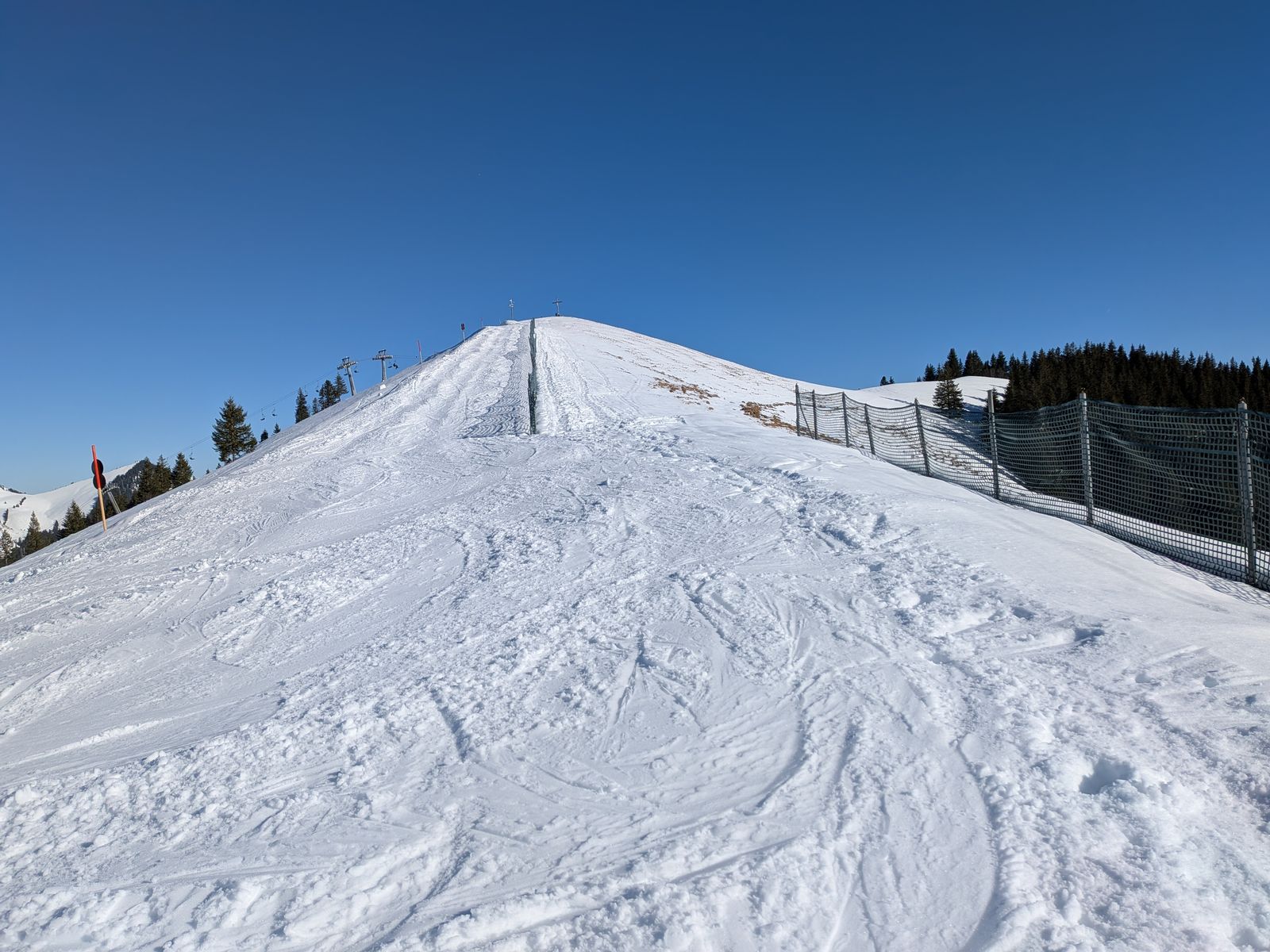 Auf den Wiesen bis zum Waldrand noch dick Schnee, dann auf der Forststraße durch den Wald ca. 10 Minuten Ski tragen (zwischen 1070m und 1130m), anschließend noch zwei oder drei kürzere apere Stücke, über die man auch mit Fellen laufen kann, ab 1170m Höhe durchgehend Schnee. Über die Forststraße zur Vorderüntschenalpe (1759m) und weiter über steile Südhänge zum Häfnerjoch (1979m) und meist auf, ein Stück lang auch in der obersten Südflanke, dem langen Gratrücken zum Gipfel der Üntschenspitze. Eine etwa zehn Meter lange Stelle am Grat ist sehr schmal und aper und kann auch nicht in der Flanke umgangen werden. Den Grat entlang viele sehr große Wechten!