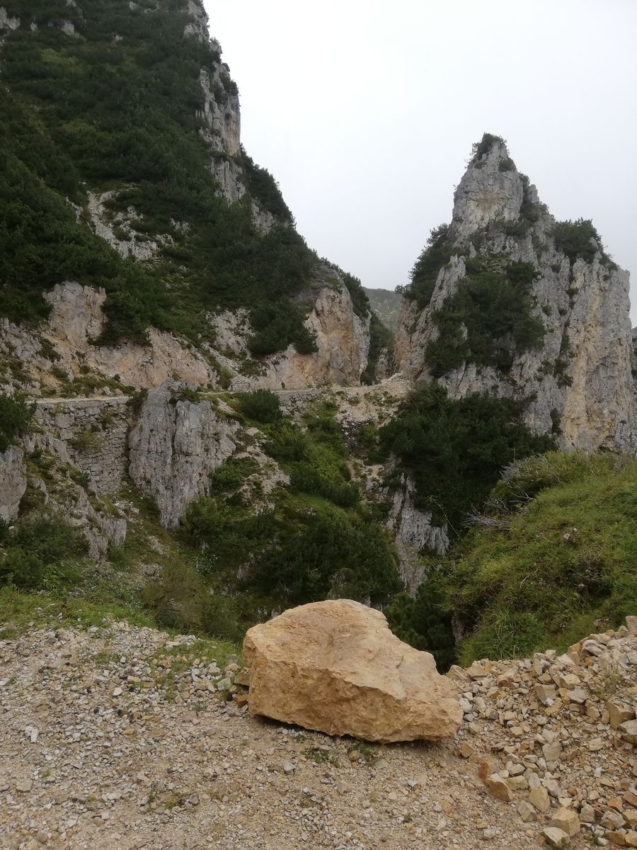 Von nun an geht es zwar ganz überwiegend bergab, aber es ist noch elend weit und der Steig führt stets auf oder knapp neben dem Gratrücken durch grobes Blockwerk. Einen Steig gibt es hier nicht, nur Markierungen. Nennenswert bergauf geht es noch auf den Gschrappkogel, die anderen Erhebungen sind kaum der Rede wert. Irgendwann kommt man in einen weiten Sattel (Nördliches Pollesjoch) und es teilt sich der Weg. Die längere Variante ("Retenbach", soll etwa eine Stunde länger dauern als der nach unten abzweigende, wohl erst in den 2000er Jahren neu angelegte Steig) führt nochmals nach oben (und ins Gletscherskigebiet), die kürzere (= Franz-Auer-Steig) bergab. Dieser Steig ist aber auch nur eine Steigspur und führt nochmals rund 120Hm bergab und dann wieder hoch, zunächst durch Schutt, dann - ziemlich unerwartet - ein Stück annähernd senkrecht am Stahlseil, die Füße in einer kleinen Schuttrinne... Ob das zwingend so sein muss oder die Erbauer hier zwanghaft eine Klettersteigstelle einbauen wollten - ich weiß es nicht. Wegen des Schutts muss man Deckung suchen, bis ein etwaiger Vorgänger die etwa 10-20m hohe Stelle passiert hat. Obwohl also der Steig jetzt nicht so toll ist, er ist ca eine Stunde kürzer und das ist ungemein hilfreich. Nach der Klettersteigeinlage führt der Steig auf den Grat hoch und von dort - nun als sehr guter Steig - zur nahen Braunschweiger Hütte, wo man einen "Kulturschock" erleiden kann, denn man taucht aus der Einsamkeit des Höhenwegs ein in den Massenbetrieb der E5-Begeher, welche die große Hütte füllen.