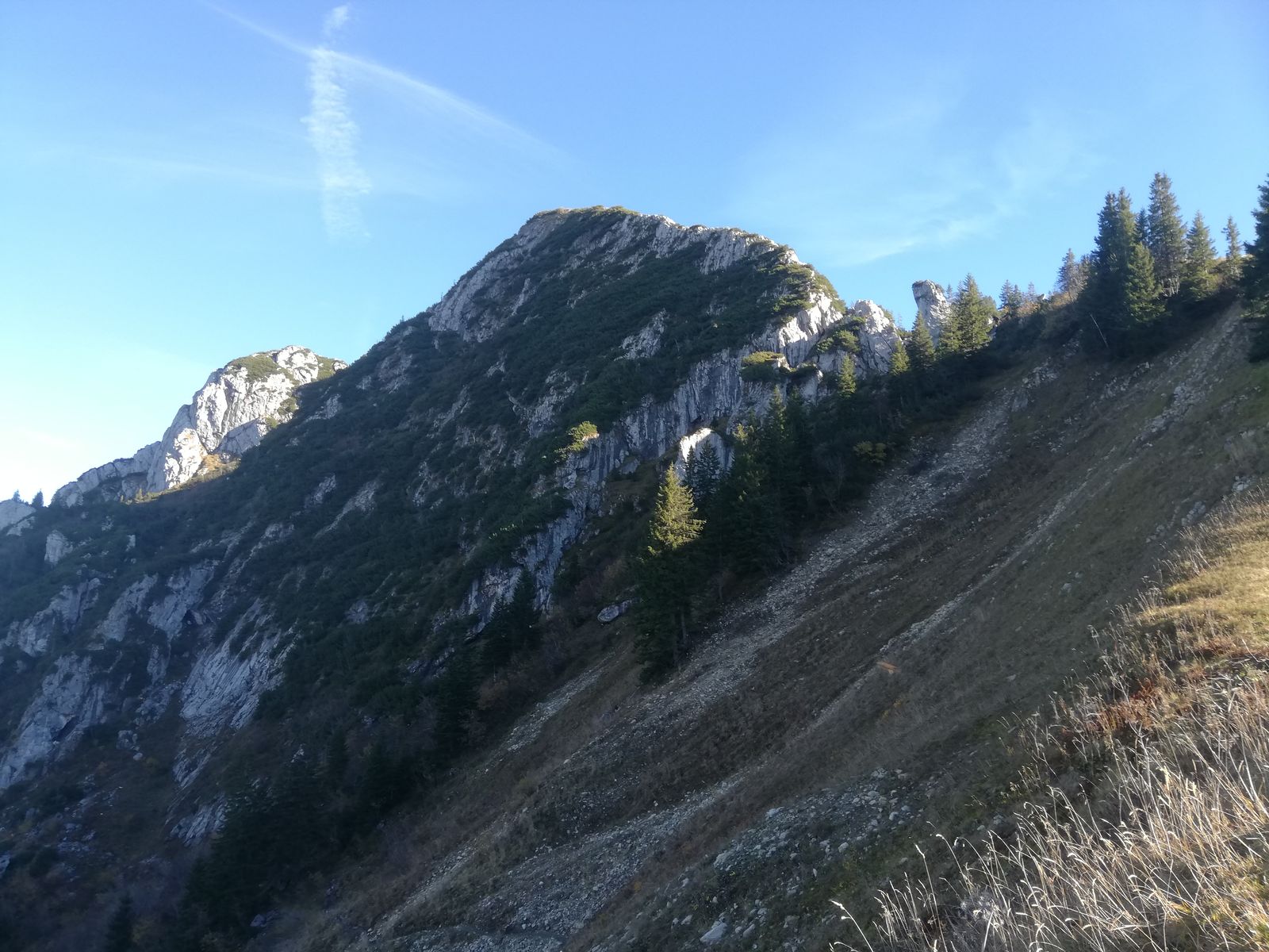 Hier beginnt der zunächst steile, später fast waagrechte Ostgrat des Ostgipfels der Bacherspitze. Am besten direkt an der Gratkante in meist ziemlich festem Fels steil und ausgesetzt hoch (II). Sobald der Grat flacher wird, sind die Schwierigkeiten vorbei, der Grat bleibt aber schmal, kurzzeitig auch scharf.