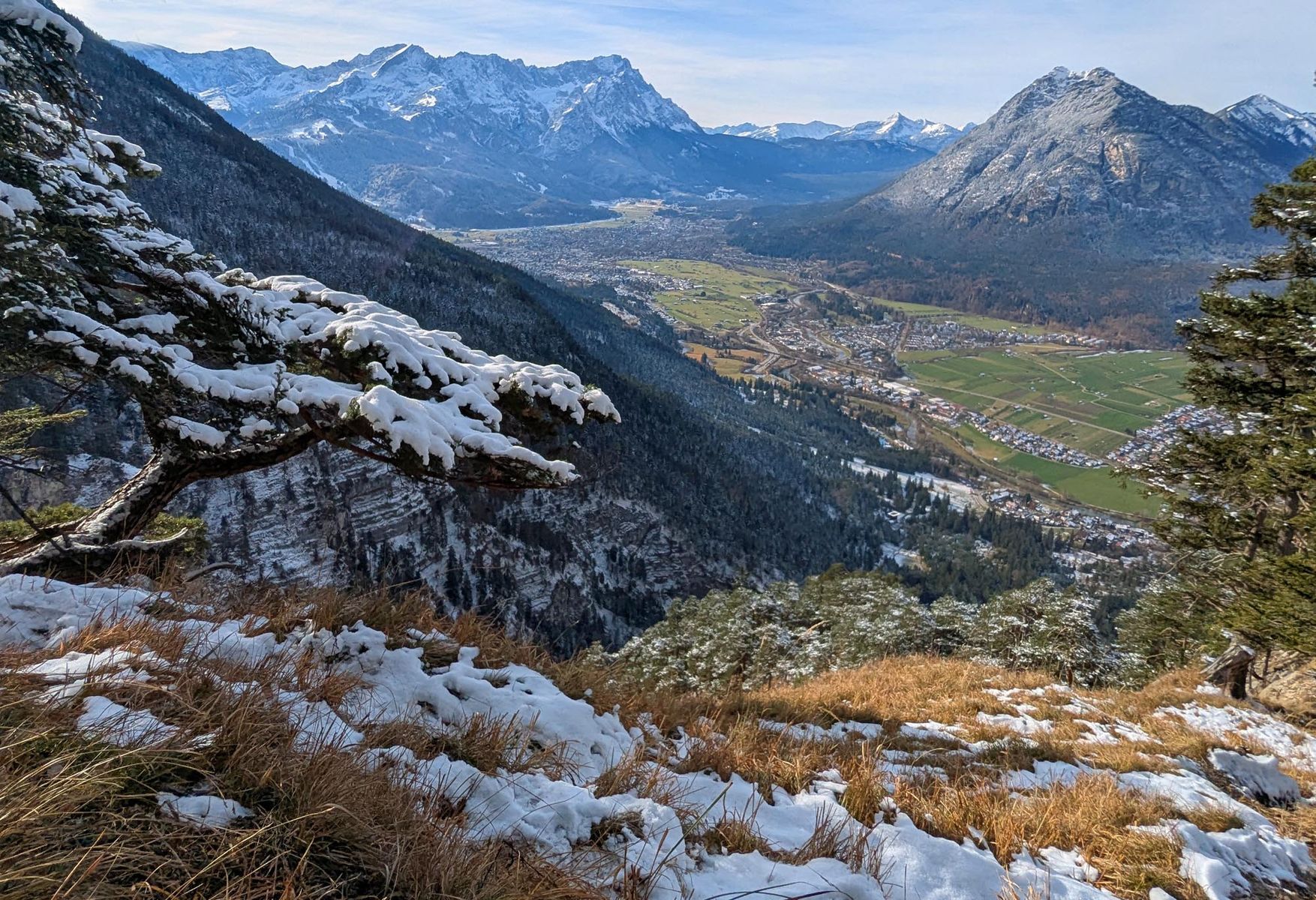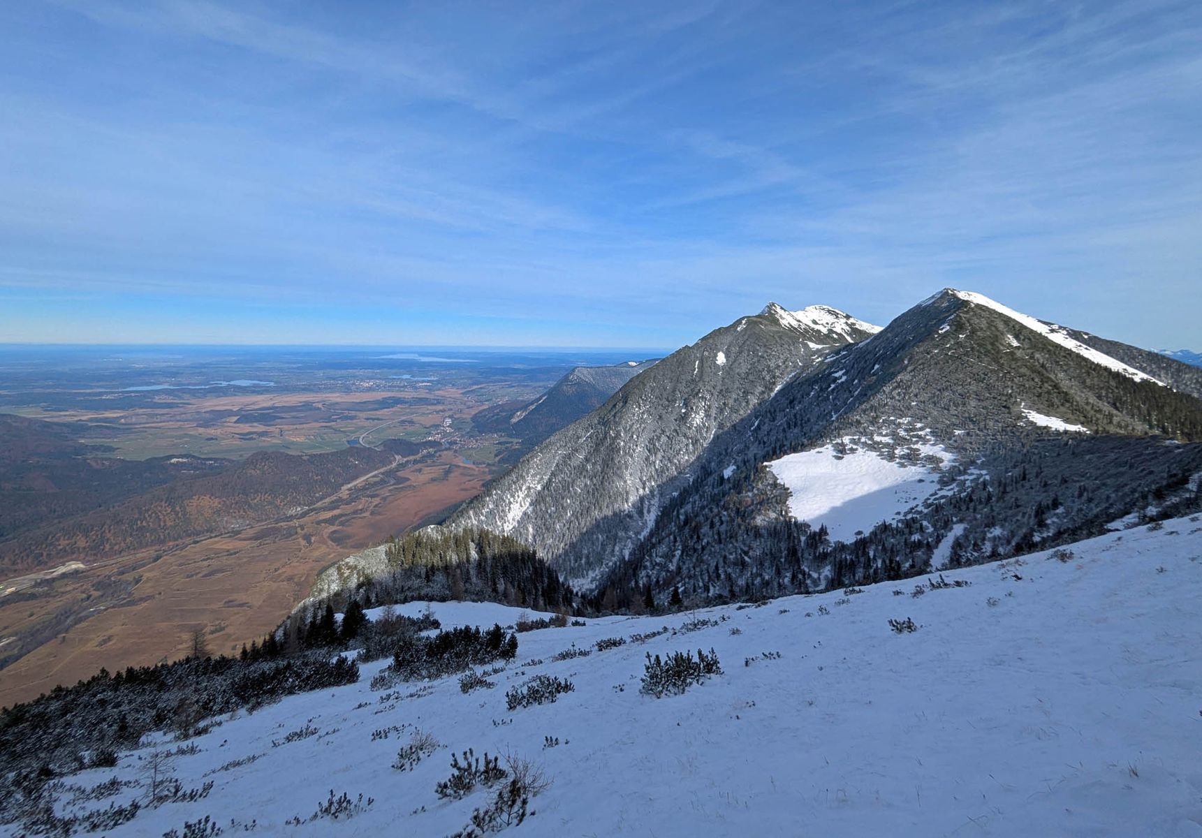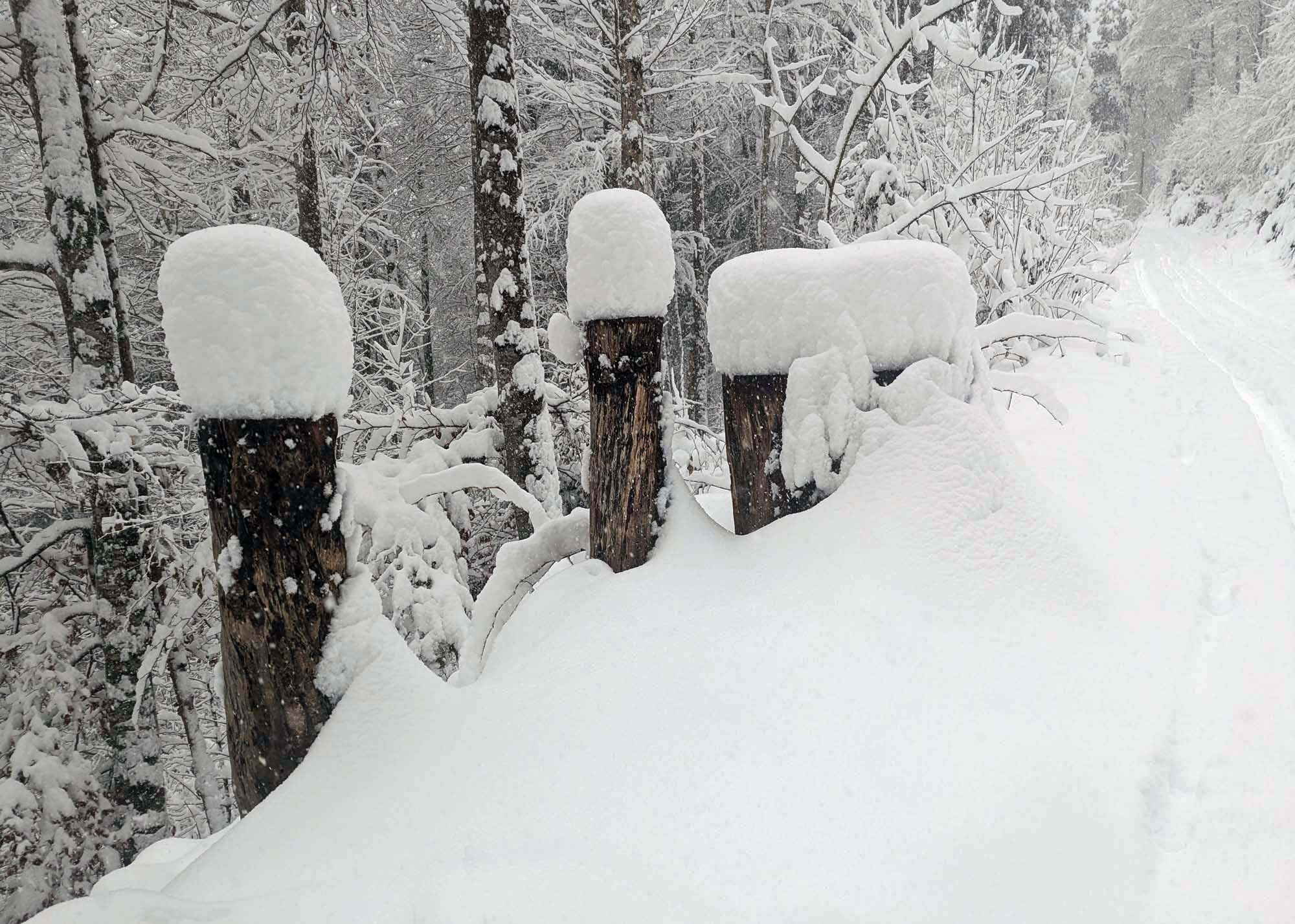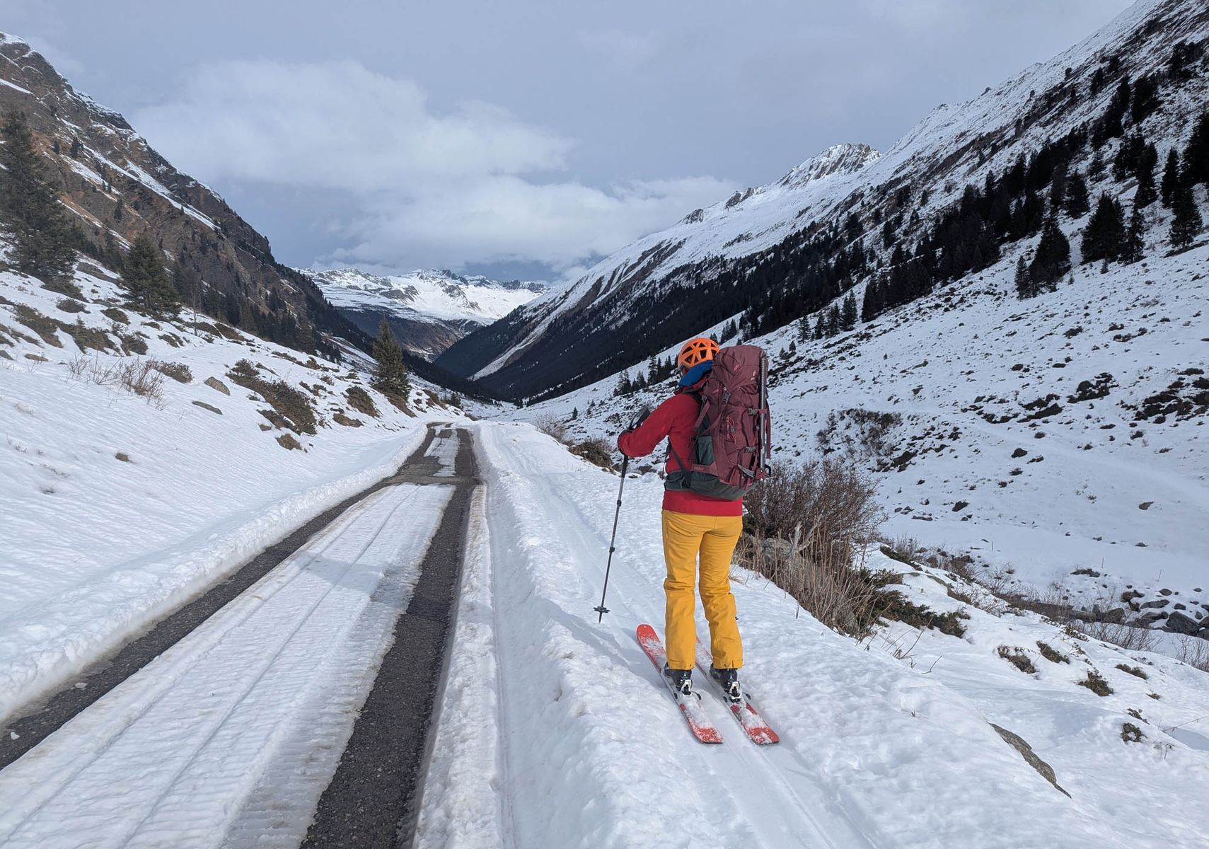 Tag 2: Beim Aufstieg zum Geisljoch wählten wir sicherheitshalber den Weg über die Almstraße auf westseitigen Hänge des Tales, da uns der (vom Routenverlauf her elegantere) Anstieg über die Osthänge des Hobarjoch zu heikel vorkam. Im oberen Teil sieht man dort auch zwei große Schneebretter, aber auch etwa vier Abfahrtsspuren.