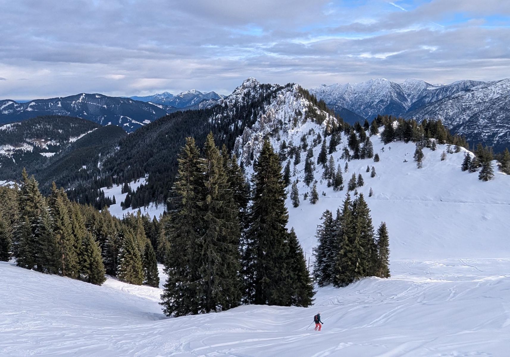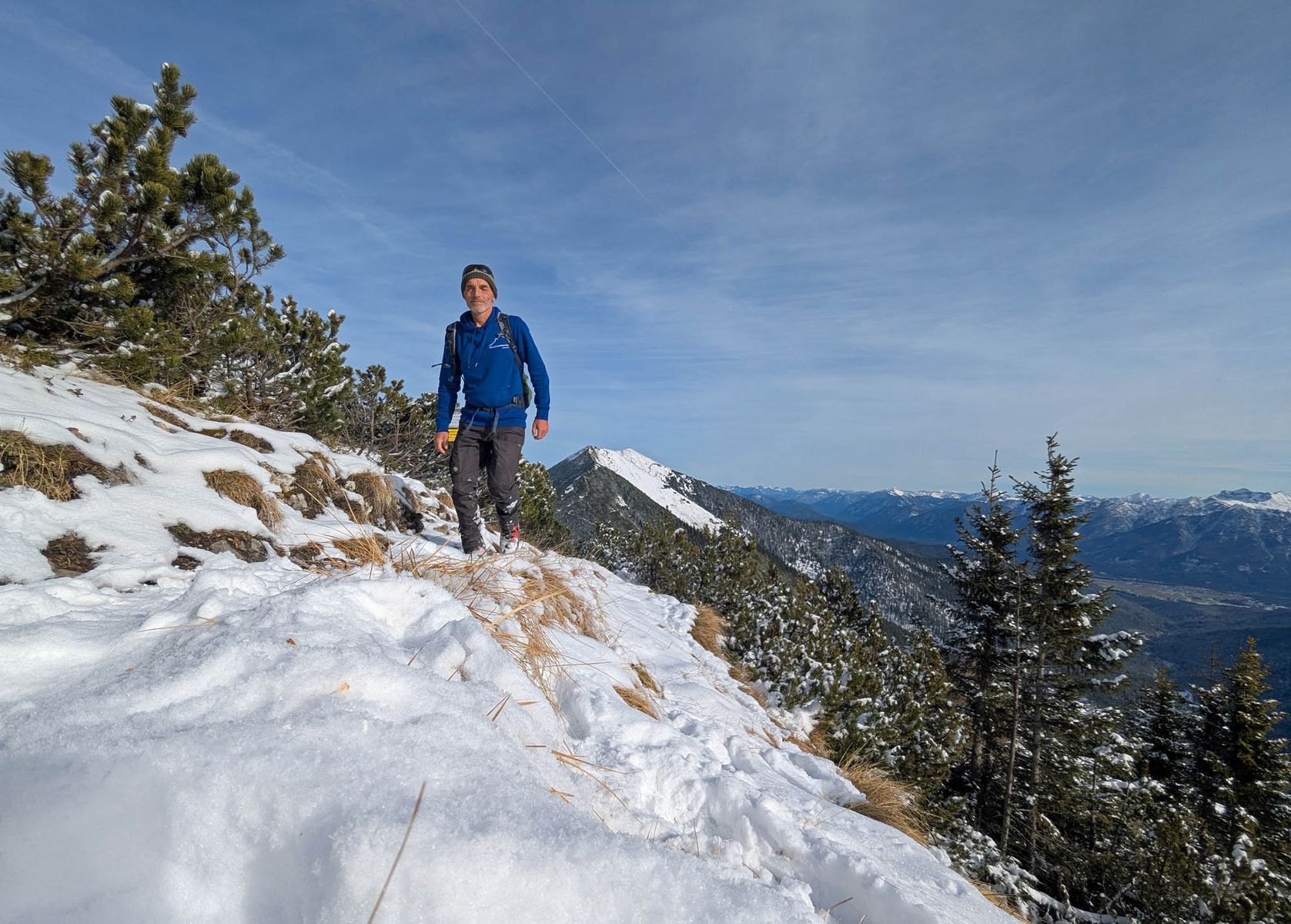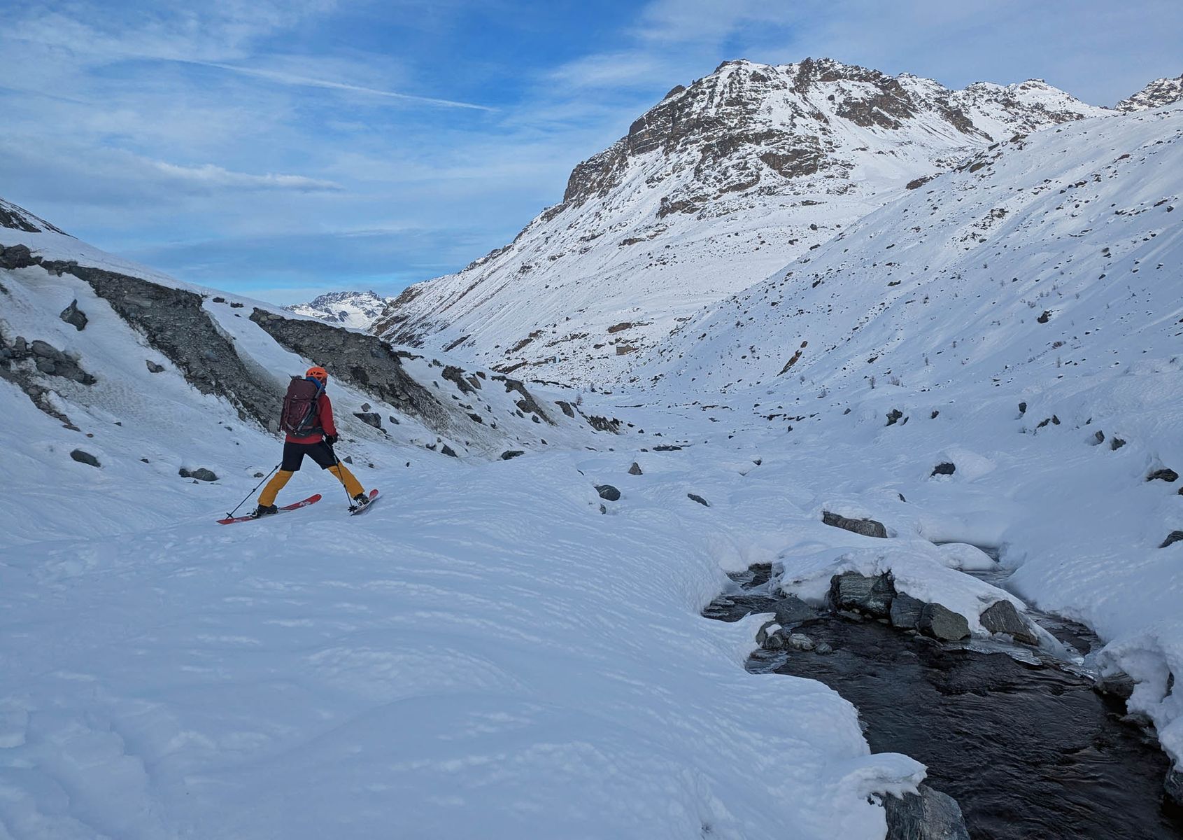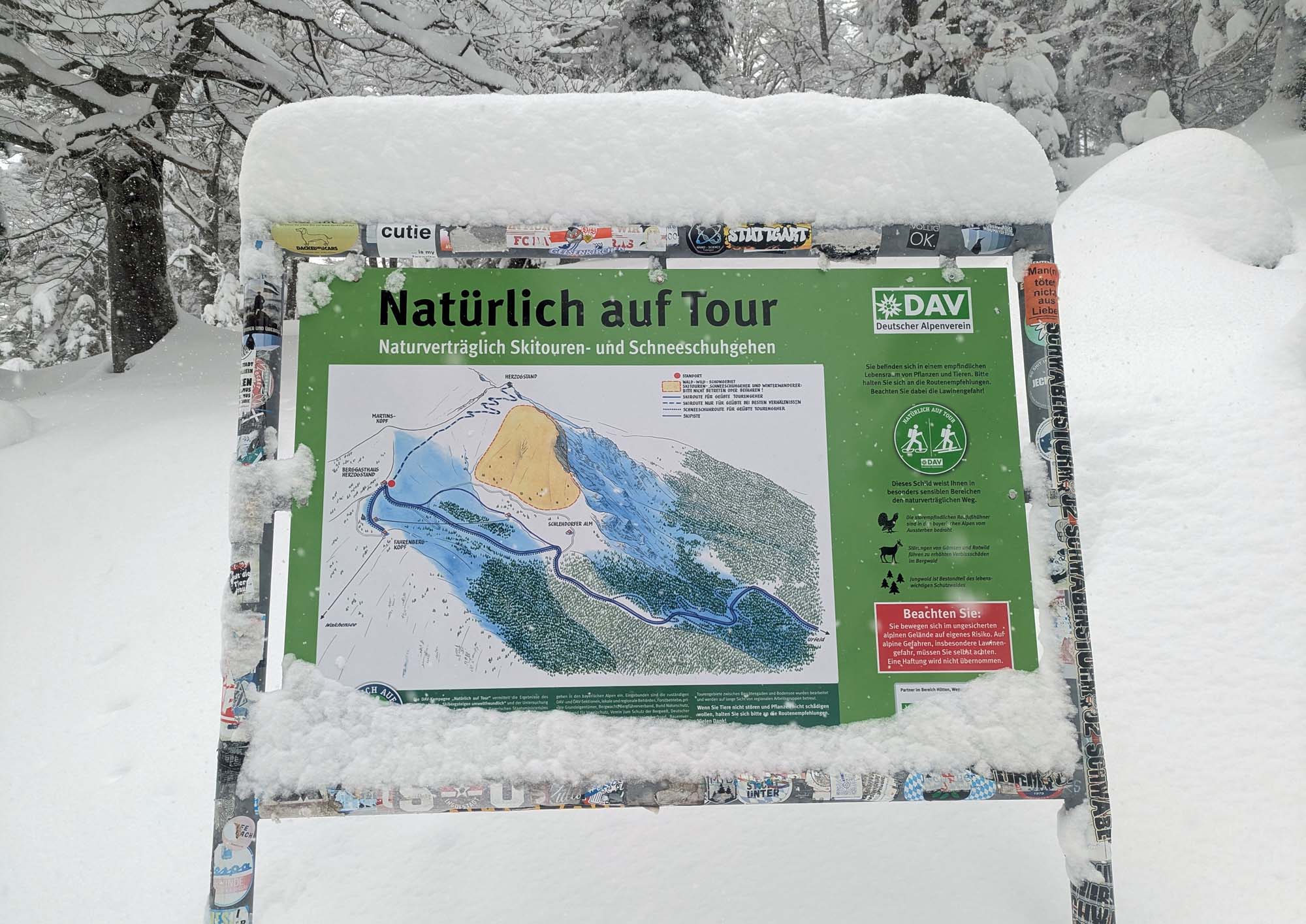 Auf der Querung unterhalb des Hoberjochs nach Westen (den Gipfel haben wir ausgelassen, da uns ein ausreichender Zeitpuffer wichtig war) gab es in so gut wie jeder Mulde starke Setzungsgeräusche. An Rücken und nicht konkav gewölbten Hängen hörte ich hingegen keine. Die südseitigen Hänge hinab zur Vallruckalm waren von der Schneelage fahrbar, haben aber wie die gesamte Region unterdurchschnittlich viel Schnee. Sie sind recht flach und wiesen keinerlei Lawinengefahr auf. Im Gegensatz zum anschließenden Anstieg zur Torspitze. Auf der Pause überlegten wir uns sehr gut, ob da hineinsollten. Wir hatten das Glück, dass bereits vier Abfahrtsspuren in den nicht ganz flachen Nordost- und Osthängen zu sehen waren. Wir stiegen also genau entlang dieser Spuren mit weiten Abständen auf. Der Gipfelanstieg zur Torspitze (2663 m) verlief wie am Vortag auf, vom Wind geprägten Harsch. Die ersten 200 Hm Abfahrtshöhenmeter direkt zur Hütte waren auch eher hart, aber griffig. Unterhalb von ca. 2400 m gab es dann wieder schönen Powder. Allerdings muss man aufgrund des felsigeren Geländes sehr gut auf »sharks« achten, die von lockere Schnee überdeckt sind. Wir waren die ersten, die diesen Hüttenübergang nach den Neuschneefällen gemacht haben. Der nette Hüttwirt Tobias wies uns noch darauf hin, dass wir uns ab der Vallruckalm bis zum Gipfel in einem Bereich des Militärgebietes Lager befanden, den man eigentlich nicht betreten darf. Offiziell erlaubt ist der Übergang über das Krovenzjoch.