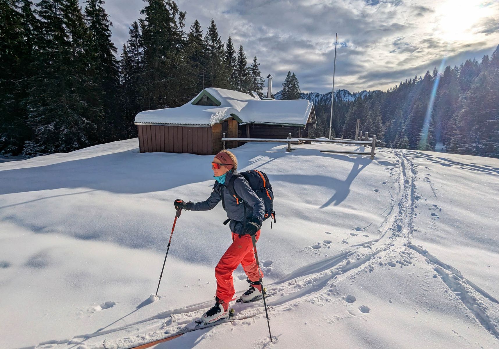 Wir sind über die Kuhalm hoch und über das August Schuster Haus abgefahren, da wir vermuteten, dass die Waldbereiche unterhalb der Steigalm Freiflächen noch zu wenig Schnee in Sachen liegende Baumstämme und Baumstümpfe haben.