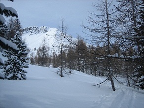 Abmarsch kurz nach 8 Uhr von der Hütte und bei Motti Rügiul über den Bach zum Poz da Rügiul und weiter eben nach S und dann durch steilen Bergwald hinauf zum flachen Kessel unter dem Motal. Hier nach W über schöne Hänge zum Gratrücken und über diesen in 2 ½ Std. zum Gipfel Nach einer Gipfelbrotzeit bei phantastischer Fernsicht Abfahrt bei 40 cm Pulverschnee durch lichten Lärchenwald, vorbei an der Almsiedlung Terzana zum Fahrweg und weiter nach Sfazu zum Parkplatz.