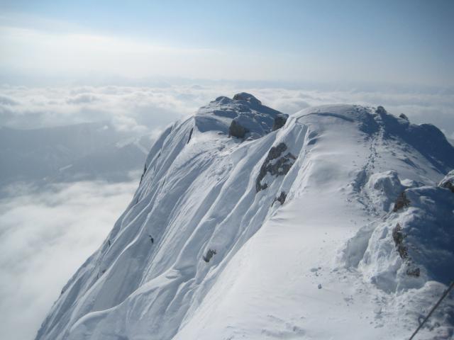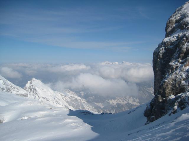 Tourenverhältnisse: ab dem Parkplatz genug Schnee, im Wald Pulver, in den freien Hängen ab 1800 m z.T. windgepreßt, z.T. Pulver, durchwegs sehr gut aufzusteigen und zu fahren, Aufstiegsweg vom Skidepot in der Kuchelnieder (2434 m) bis zum Gipfel problemlos zu gehen, kein Eis.
