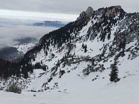 Von dort aus bei gerade so ausreichender Schneelage eine sehr schöne Pulverabfahrt mit genug Platz für eigene Spuren.