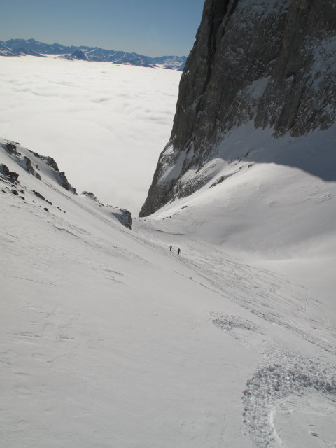 Tourenverhältnisse: vom Parkplatz weg bis etwas oberhalb der Gaudeamushütte Pulver, danach Haxenbrecherschnee und Nebel, oberhalb ca. 1800m recht gut