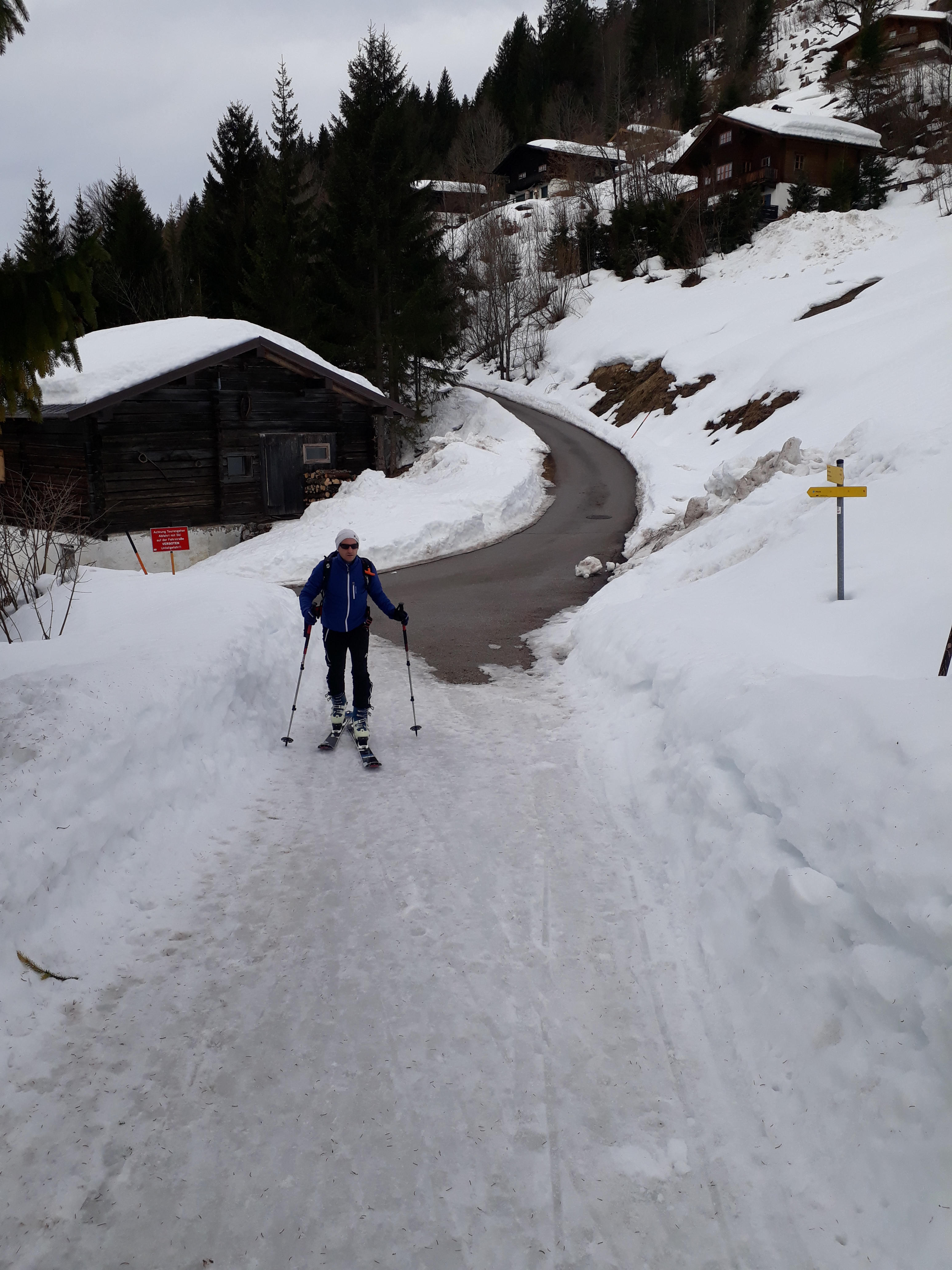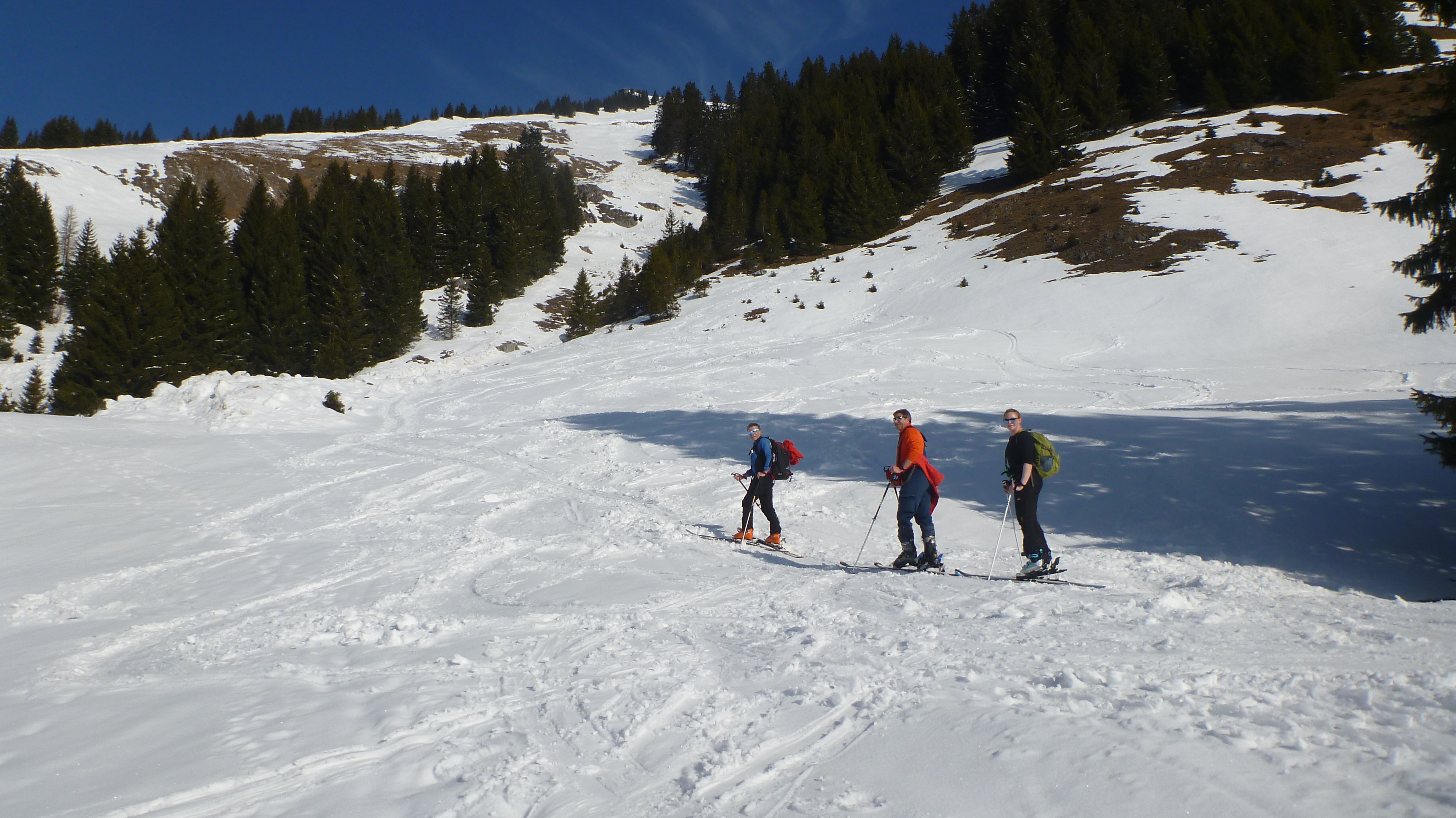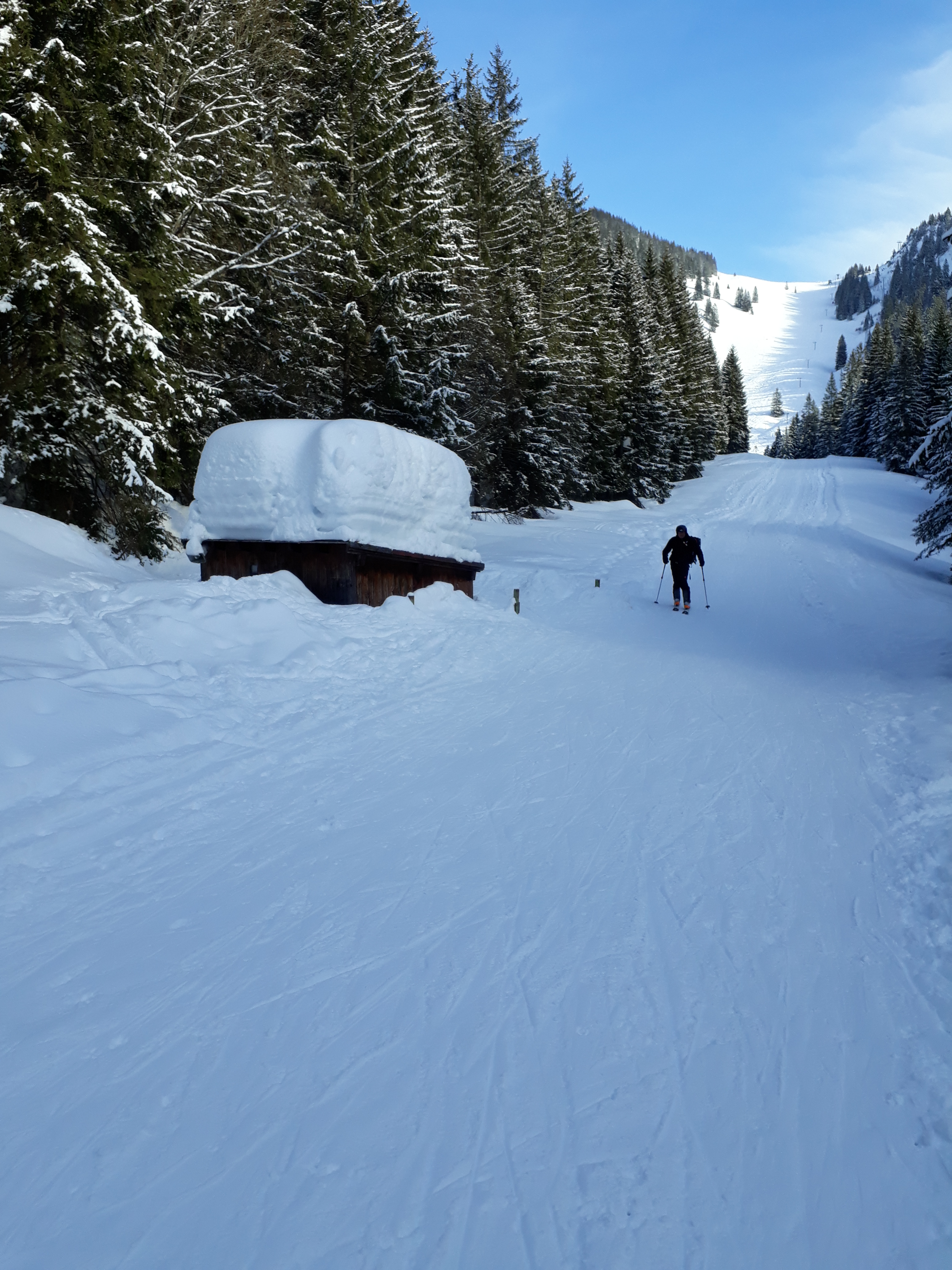 Tourenverhältnisse: geht noch, Weg zur Piste eine größere apere Stelle, Piste im Schatten sehr eisig, in der Sonne Sulz
