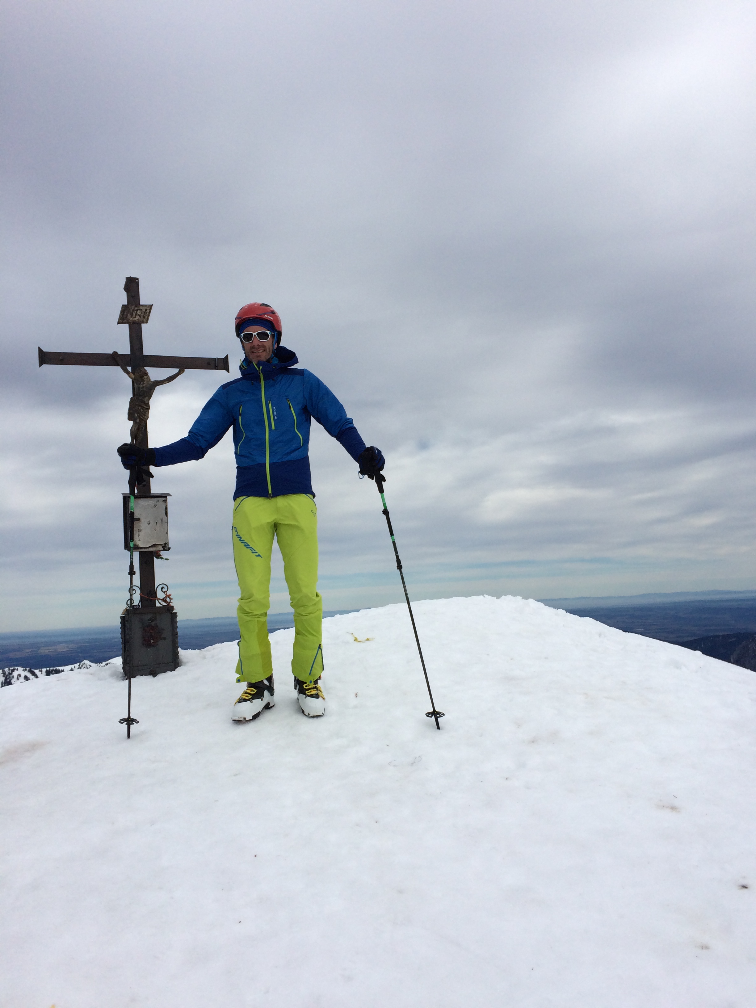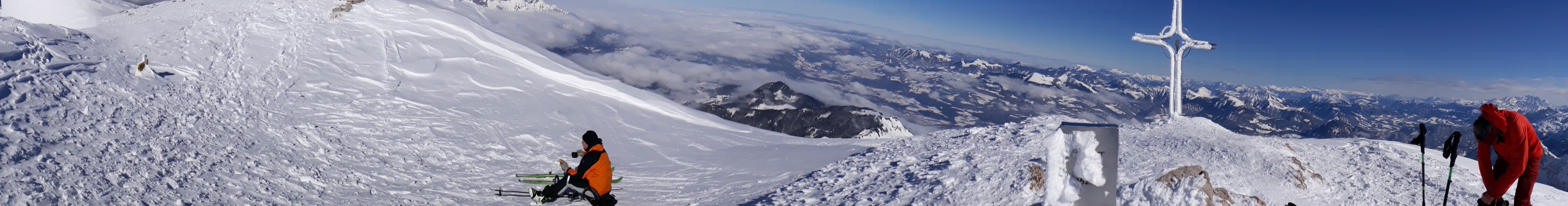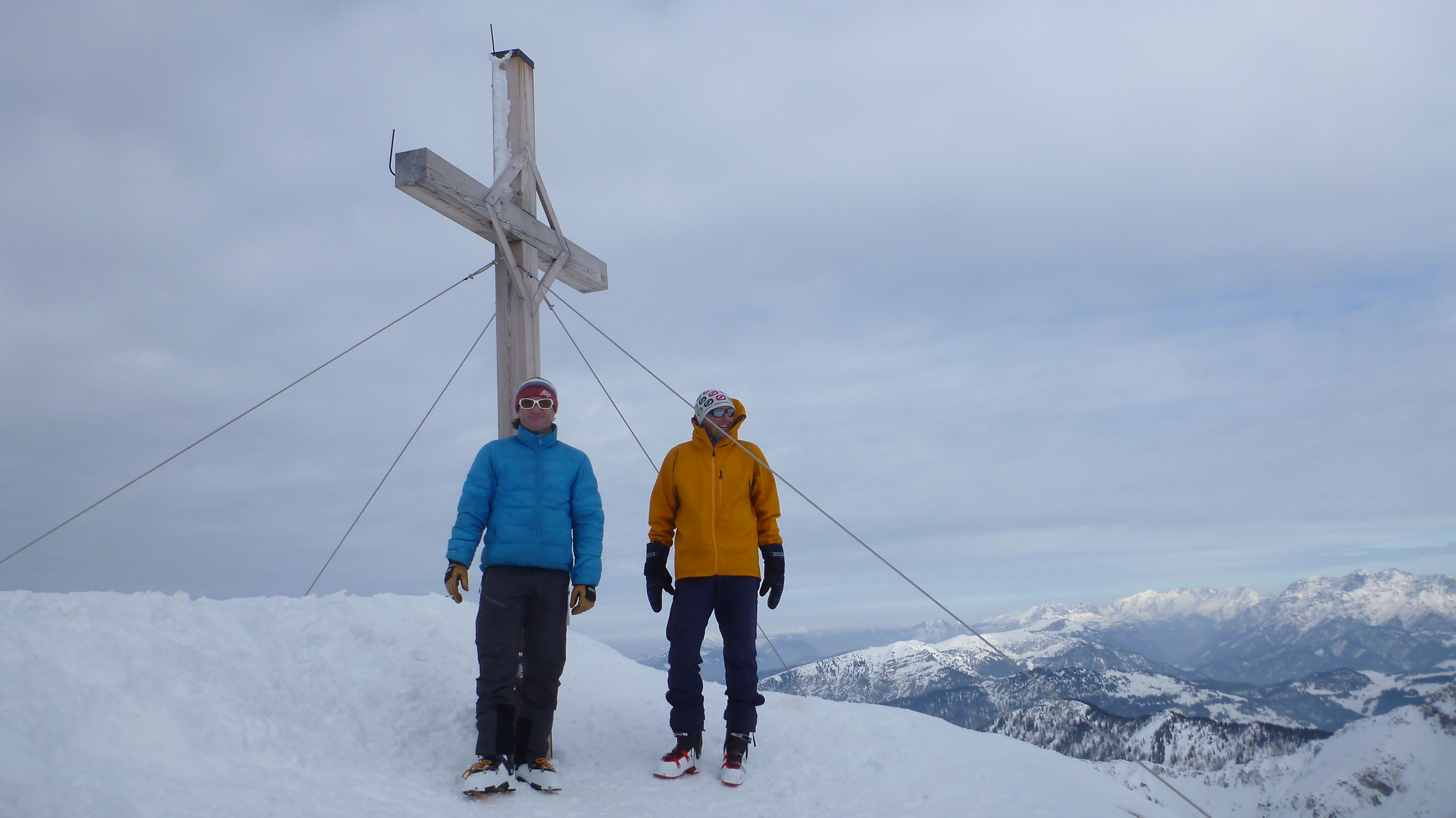 Sonstiges: Vom Parkplatz durch die Waldschneise aufwärts zum Felsriegel, diesen entlang der Drahtseilversicherungen mit Ski am Rücken gut zu gehen (keine Steigeisen nötig), danach weiter aufwärts im Alpeltal. Die zweite Felsstufe war zugeschneit, trotzdem leichter ohne Ski. Danach flacher bis zum wieder steilen Ausstieg des Alpeltals. Von dort durch das weite Kar über Mulden und Rücken, zuletzt wieder steiler zur Göllscharte. Weiter über den Rücken aufwärts zum erst spät zu sehenden Kuchelkreuz und weiter am Grat auf den sichtbaren Göllgipfel zu. Der letzte Aufschwung noch einmal steiler zum mit dem schönsten Gipfelkreuz der Ostalpen.