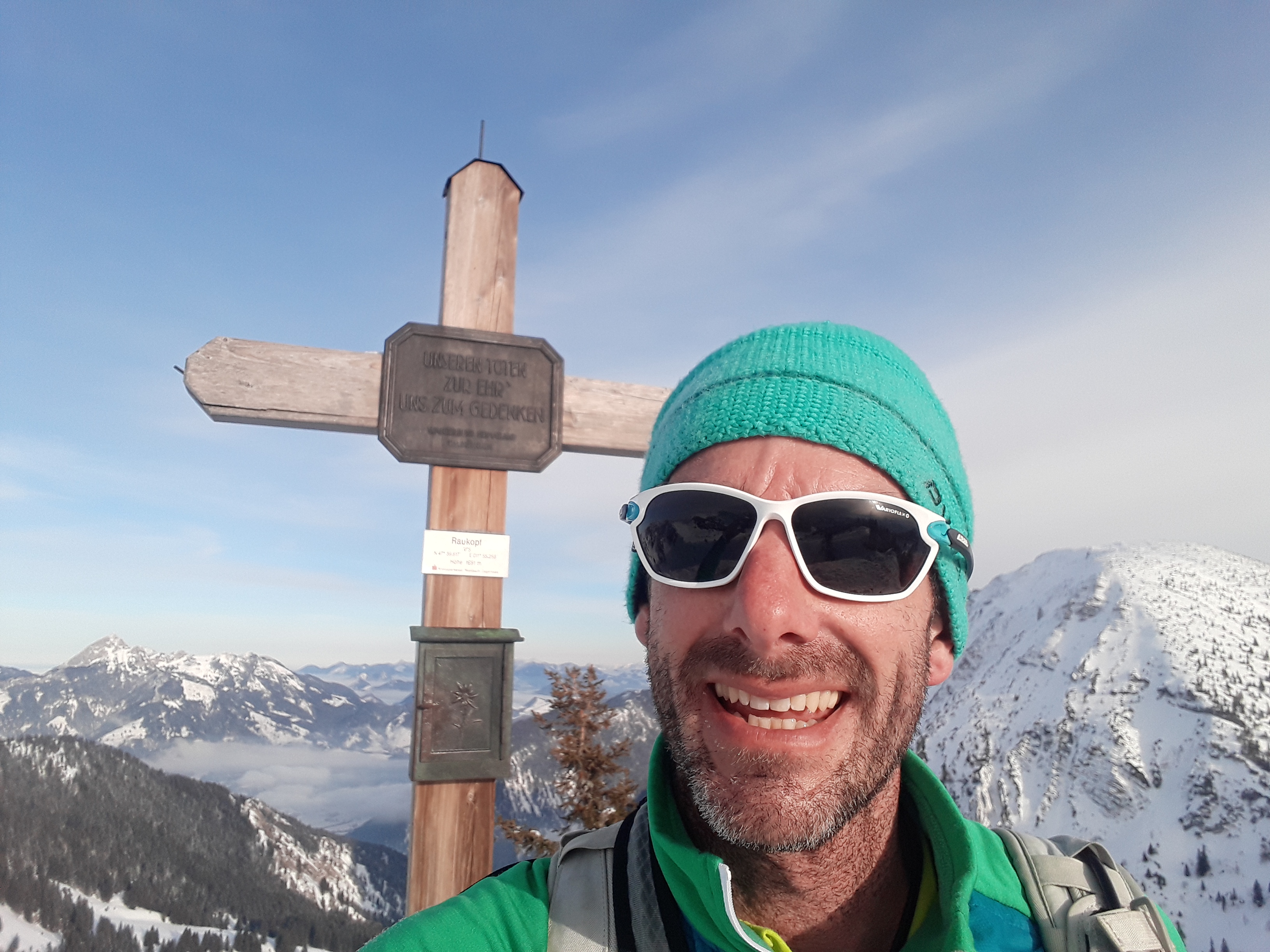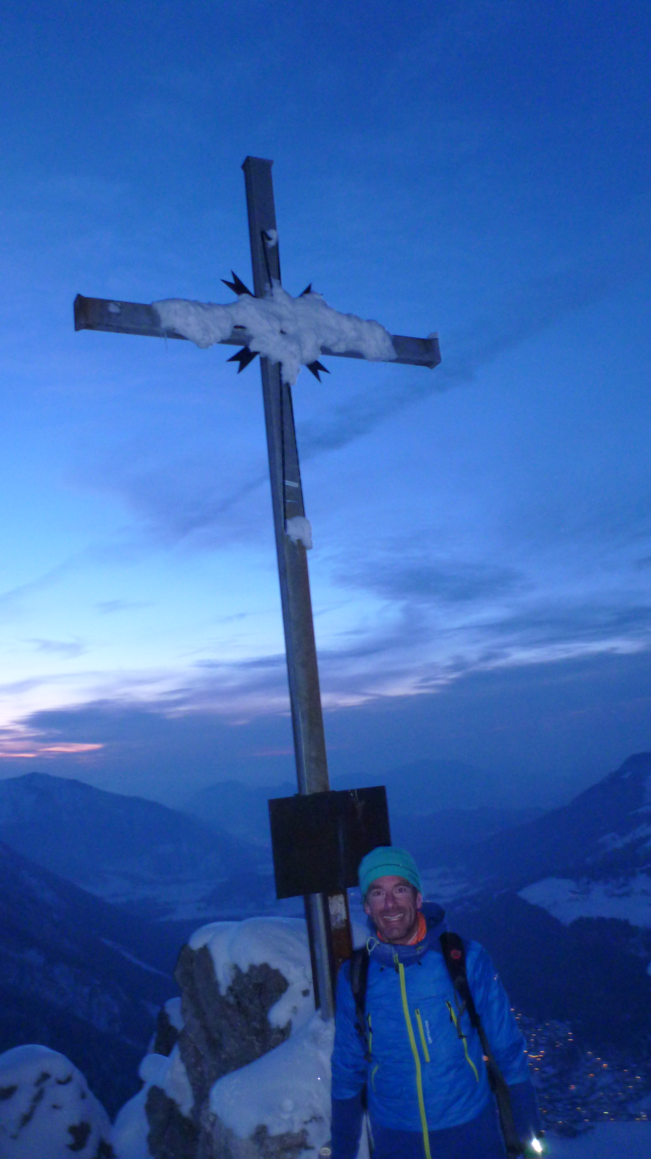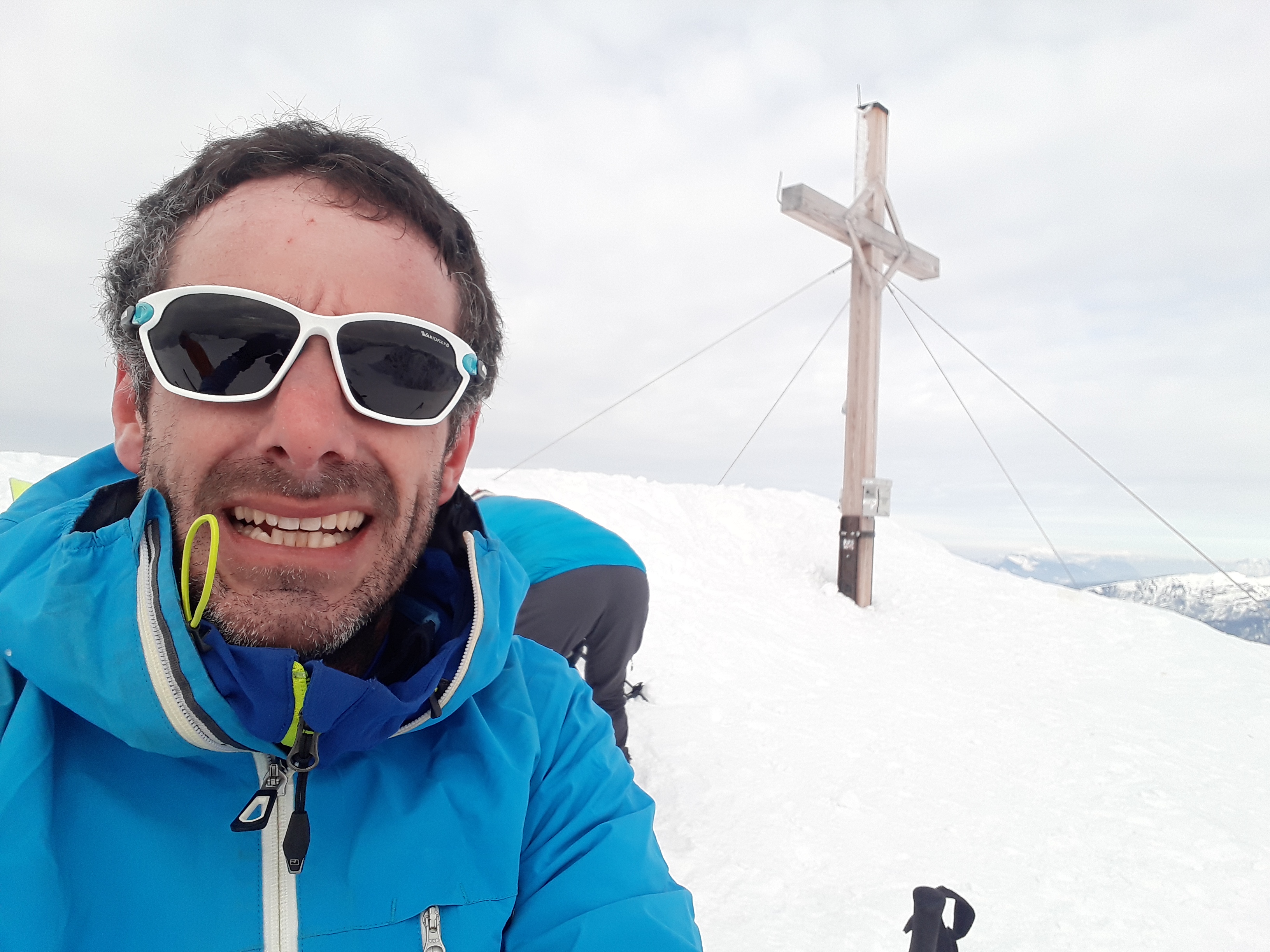 Sonstiges: Vom Parkplatz durch die Waldschneise aufwärts zum Felsriegel, diesen entlang der Drahtseilversicherungen mit Ski am Rücken gut zu gehen (keine Steigeisen nötig), danach weiter aufwärts im Alpeltal. Die zweite Felsstufe war zugeschneit, trotzdem leichter ohne Ski. Danach flacher bis zum wieder steilen Ausstieg des Alpeltals. Von dort durch das weite Kar über Mulden und Rücken, zuletzt wieder steiler zur Göllscharte. Weiter über den Rücken aufwärts zum erst spät zu sehenden Kuchelkreuz und weiter am Grat auf den sichtbaren Göllgipfel zu. Der letzte Aufschwung noch einmal steiler zum mit dem schönsten Gipfelkreuz der Ostalpen.