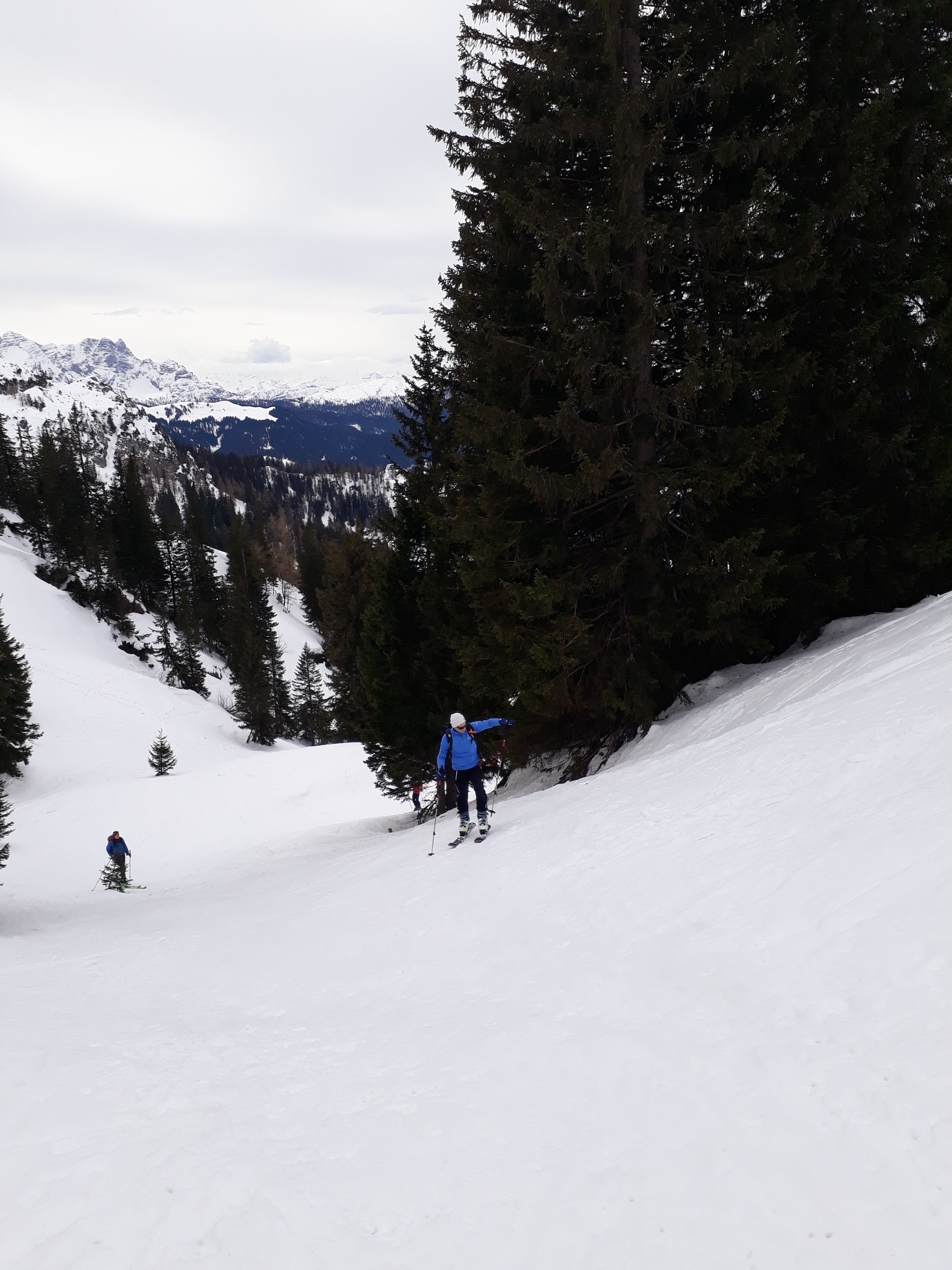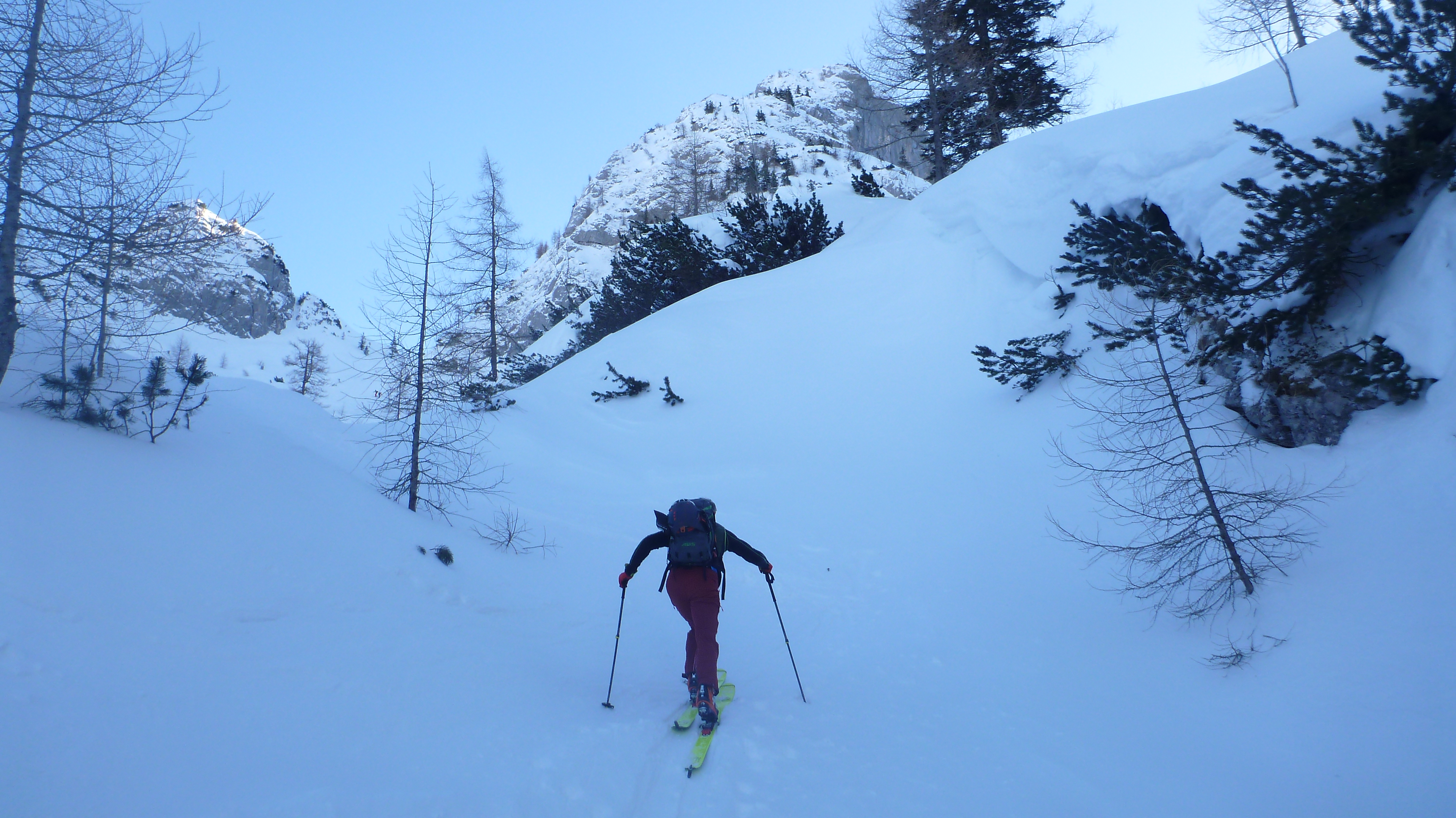 Tourenverhältnisse: gut, Forststraße eisig, Abfahrt im Wald unten Buckelpiste, oben Pulver, im Kar windgepresst