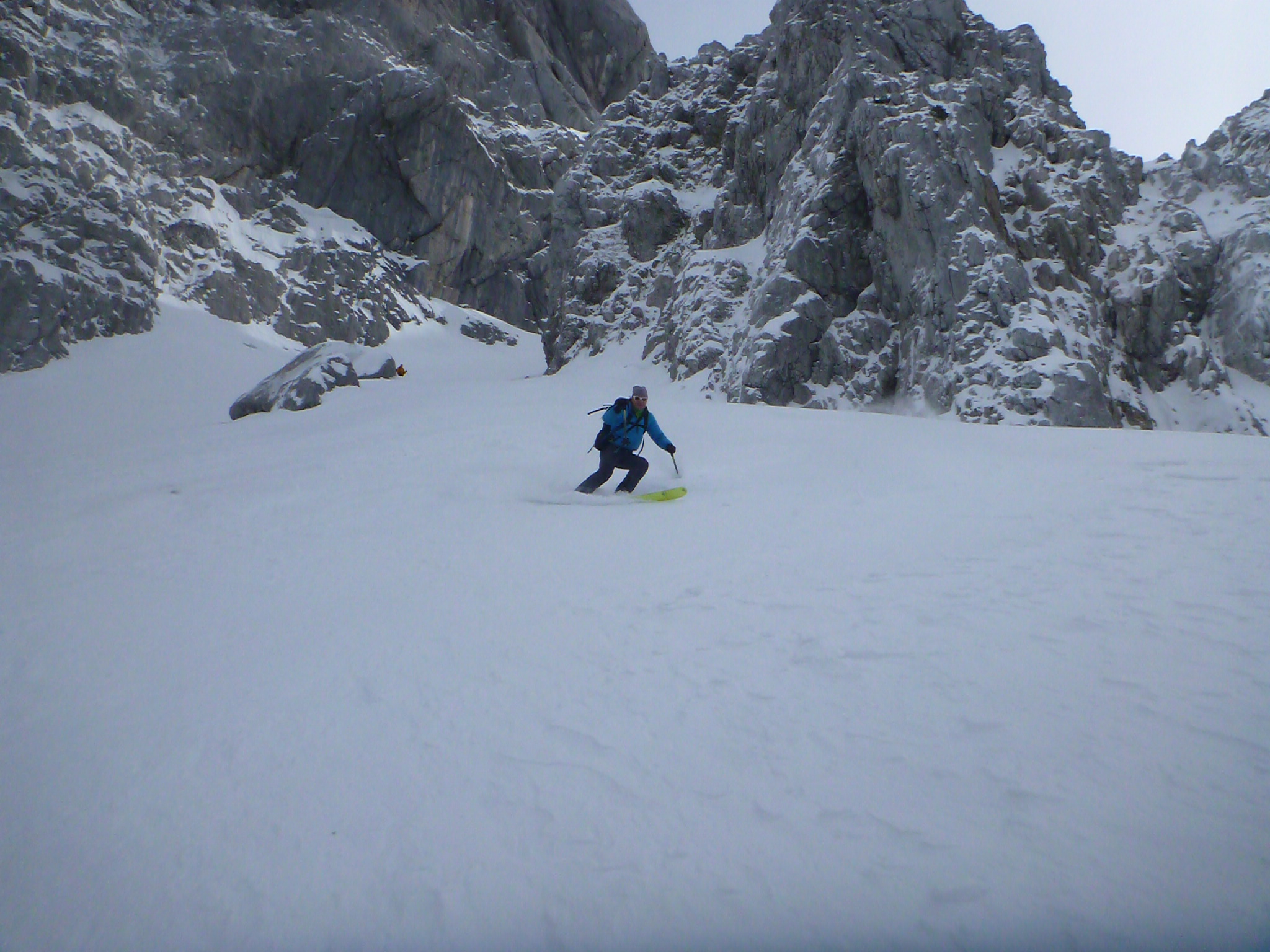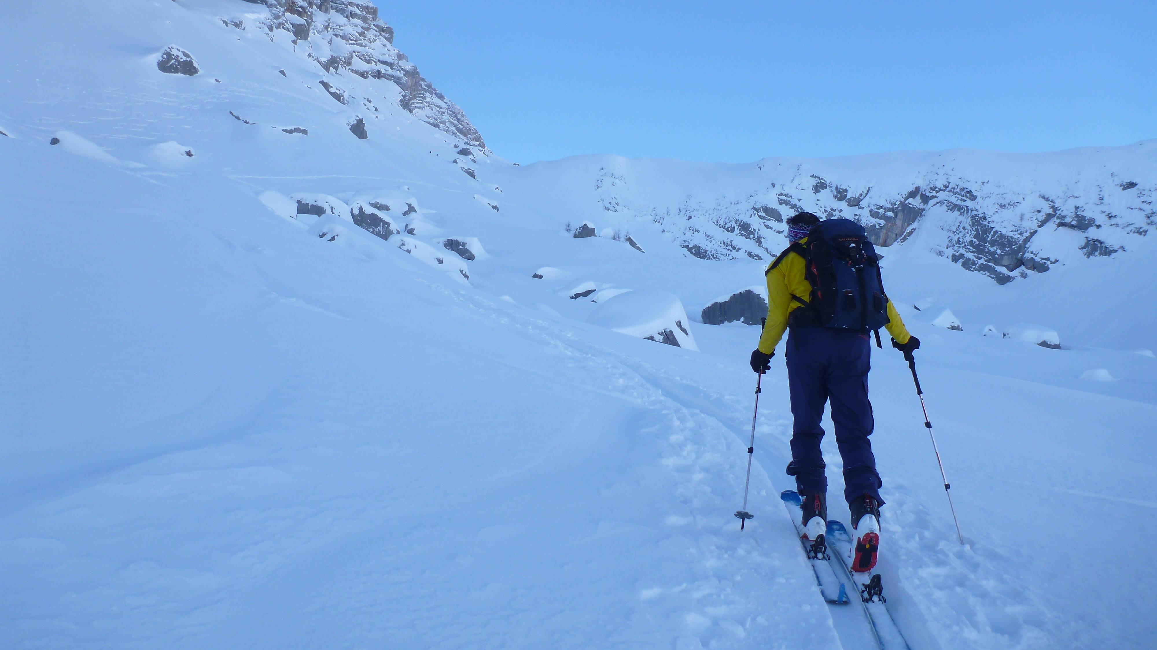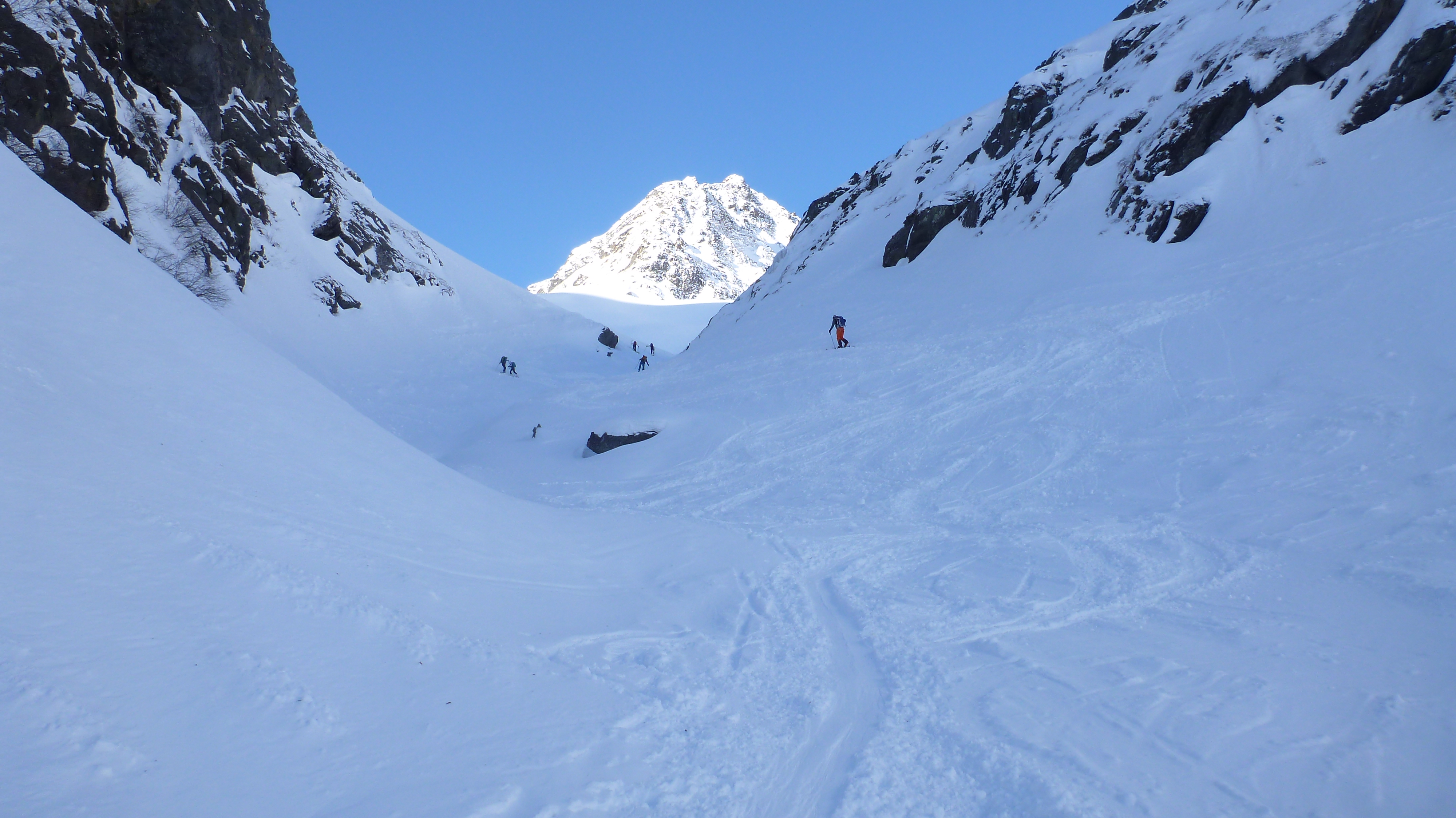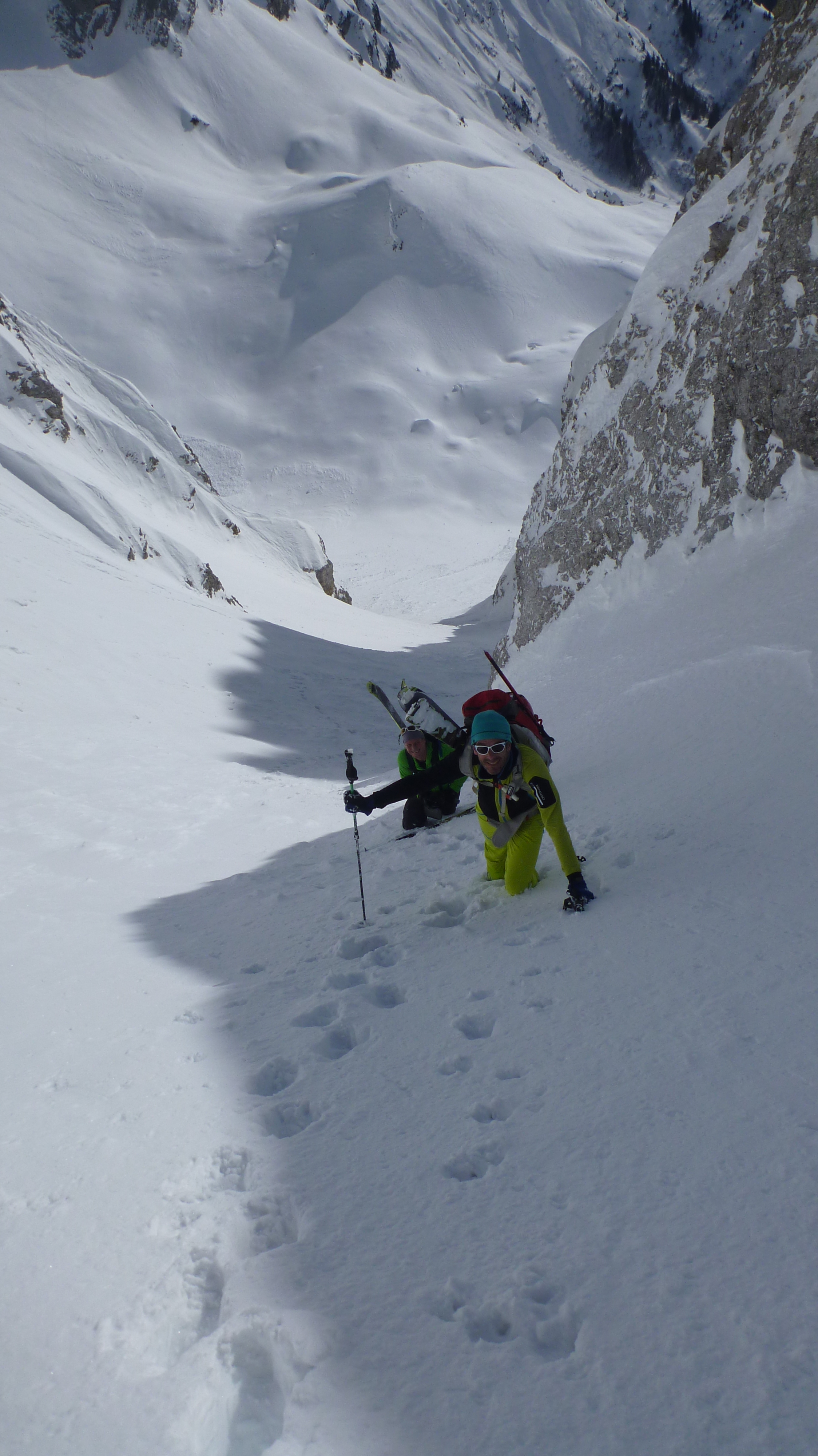 Tourenverhältnisse: insgesamt sehr gute Verhältnisse, nach oben hin zunehmender Traumpulver. Im Bereich des Schluchtausstiegs sehr harte und nicht ideal angelegte Spur...