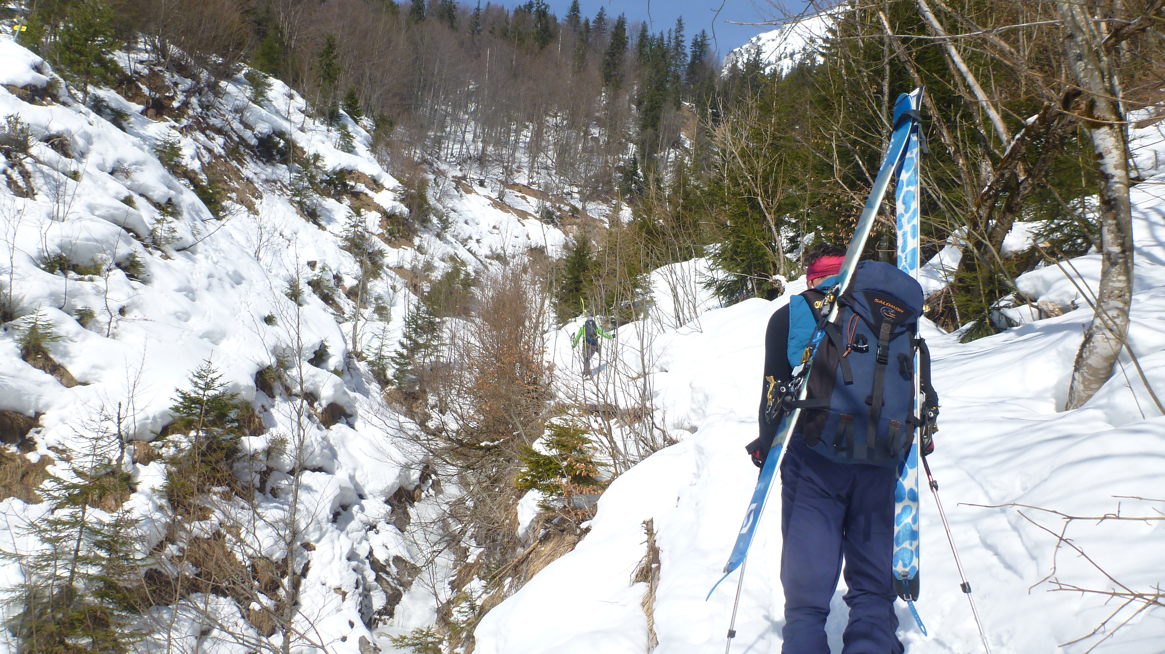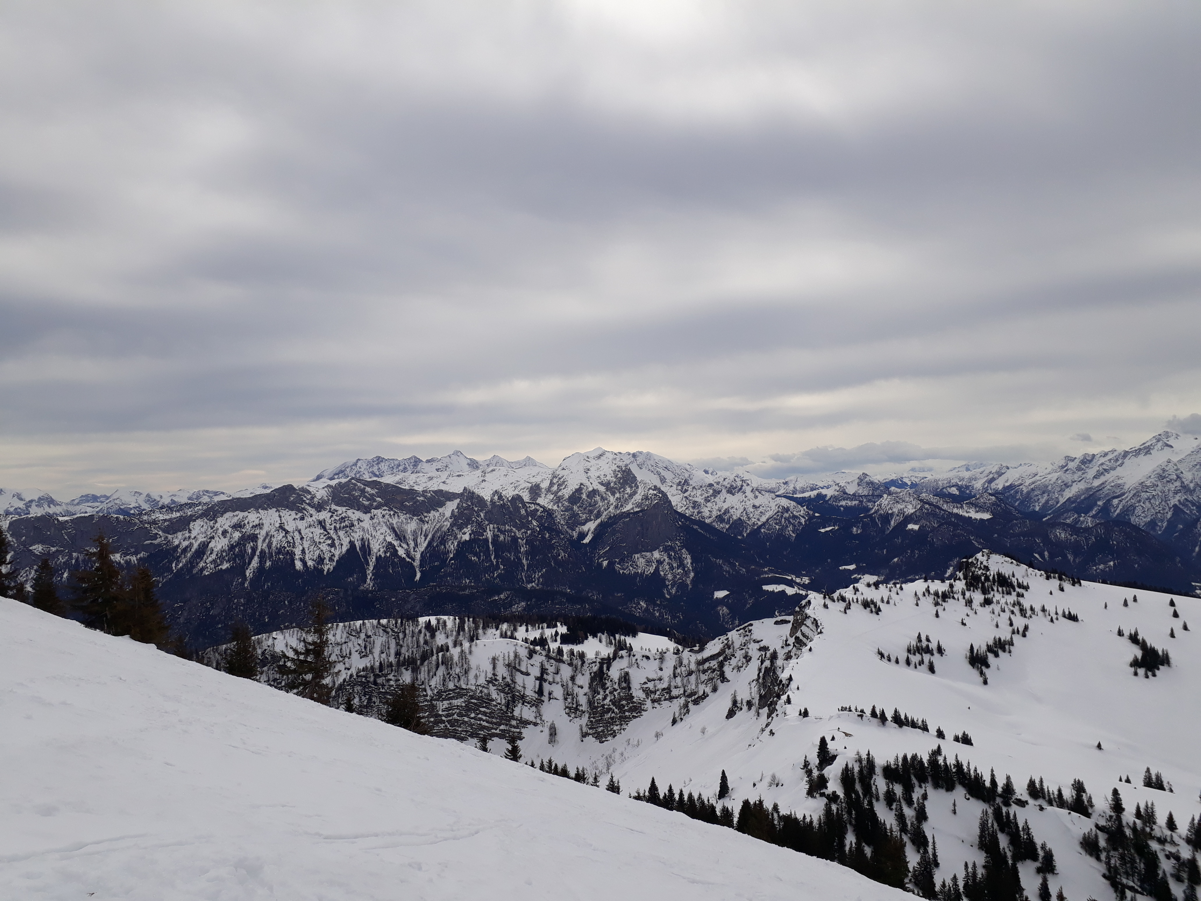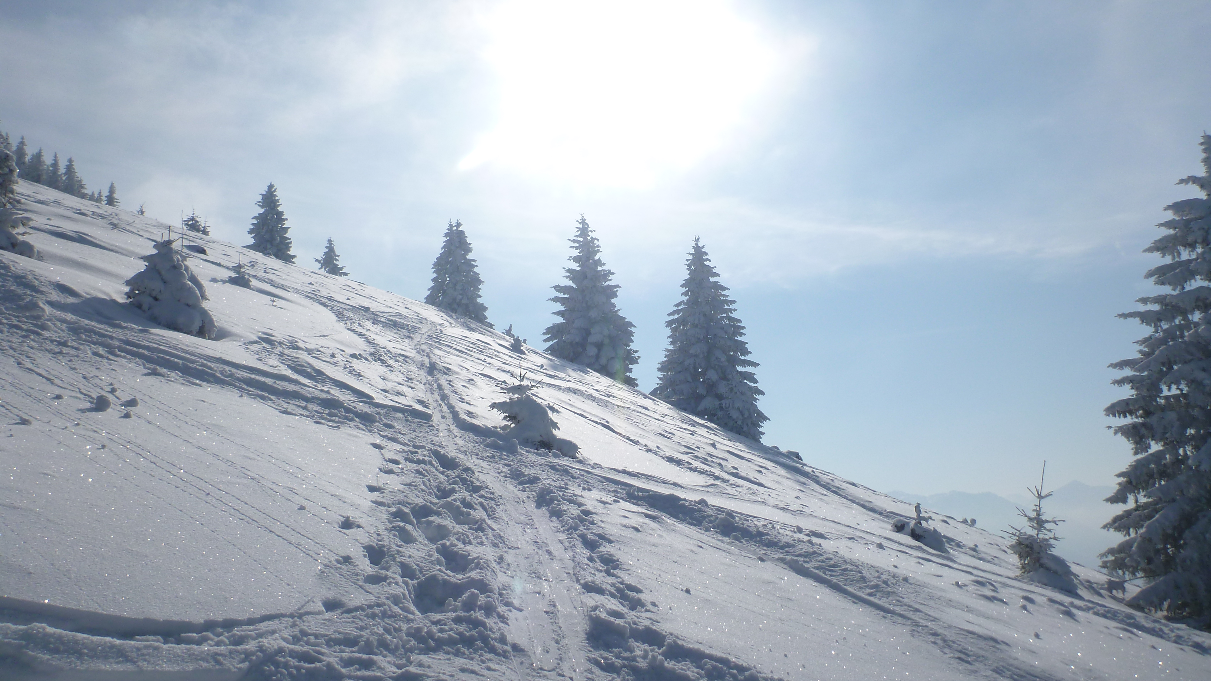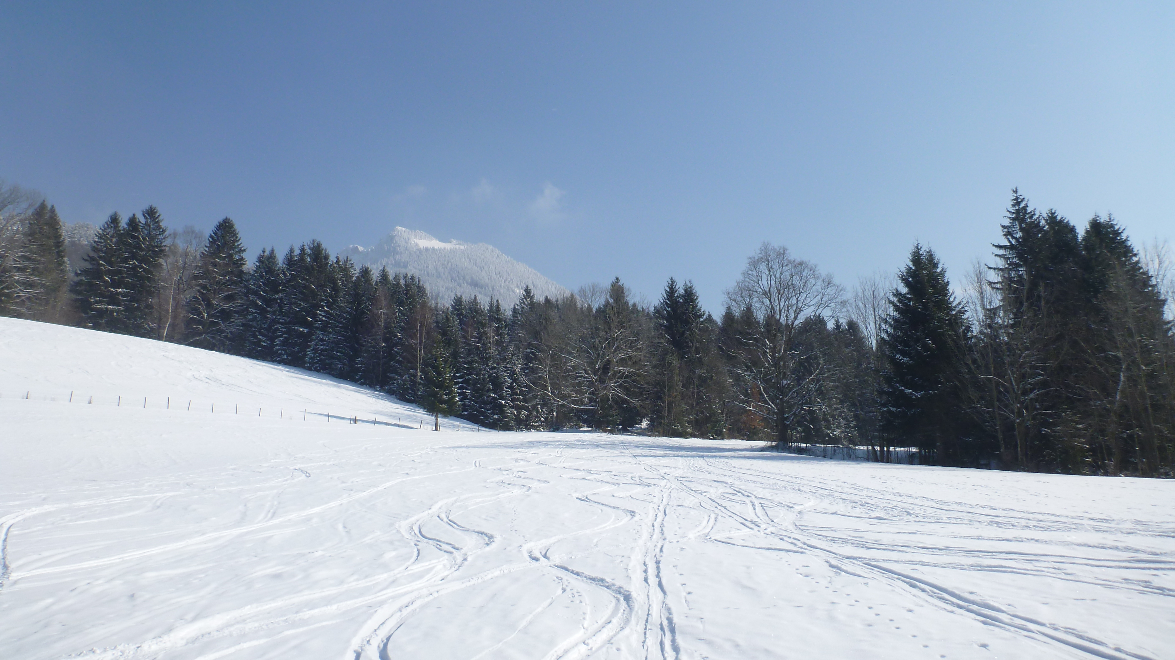 Insgesamt wenig, aber ausreichend Schnee für ein paar schöne Schwünge im Gelände. Forststraße bis zur Bergwachthütte komplett geräumt und gesalzen.
