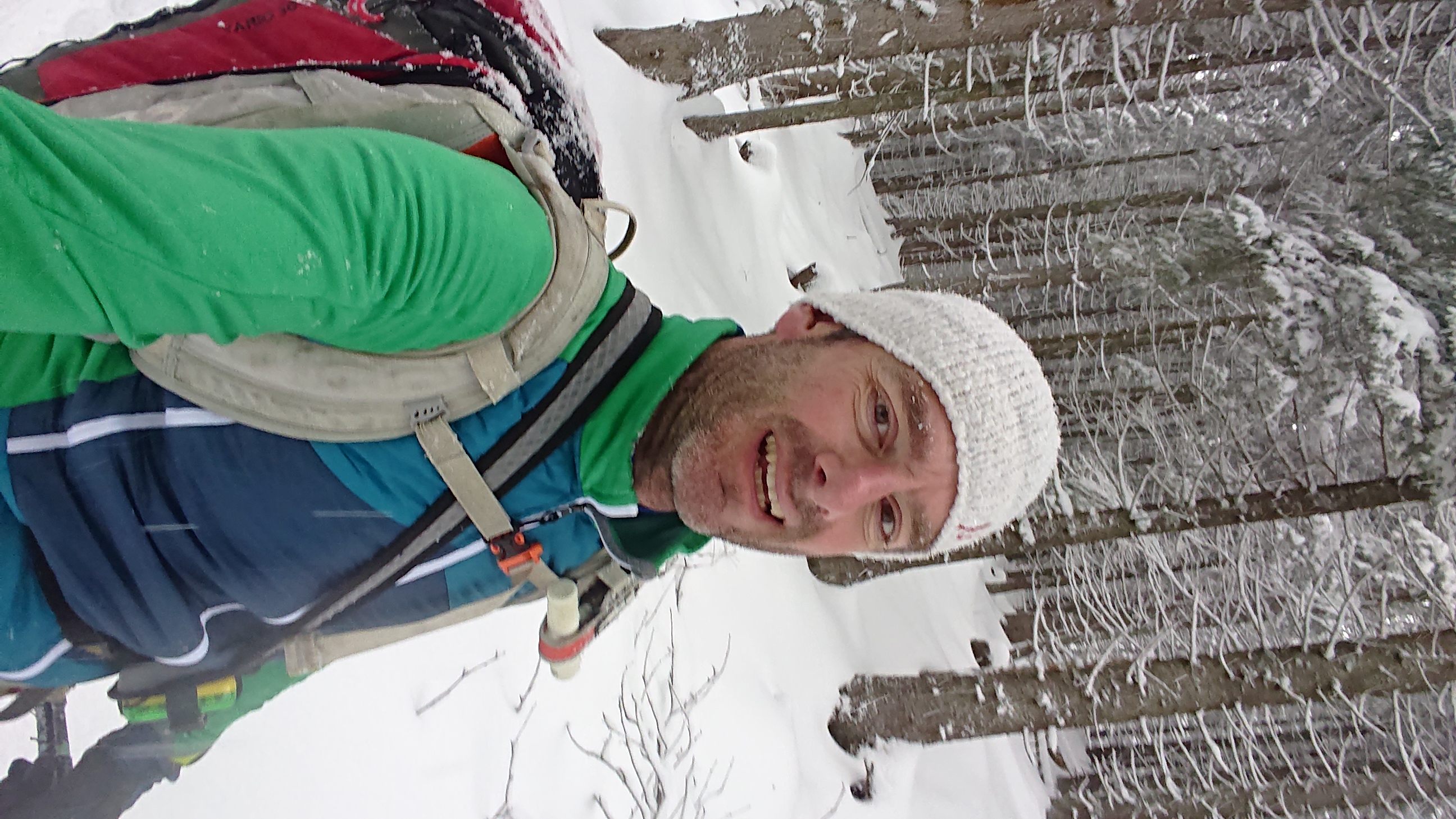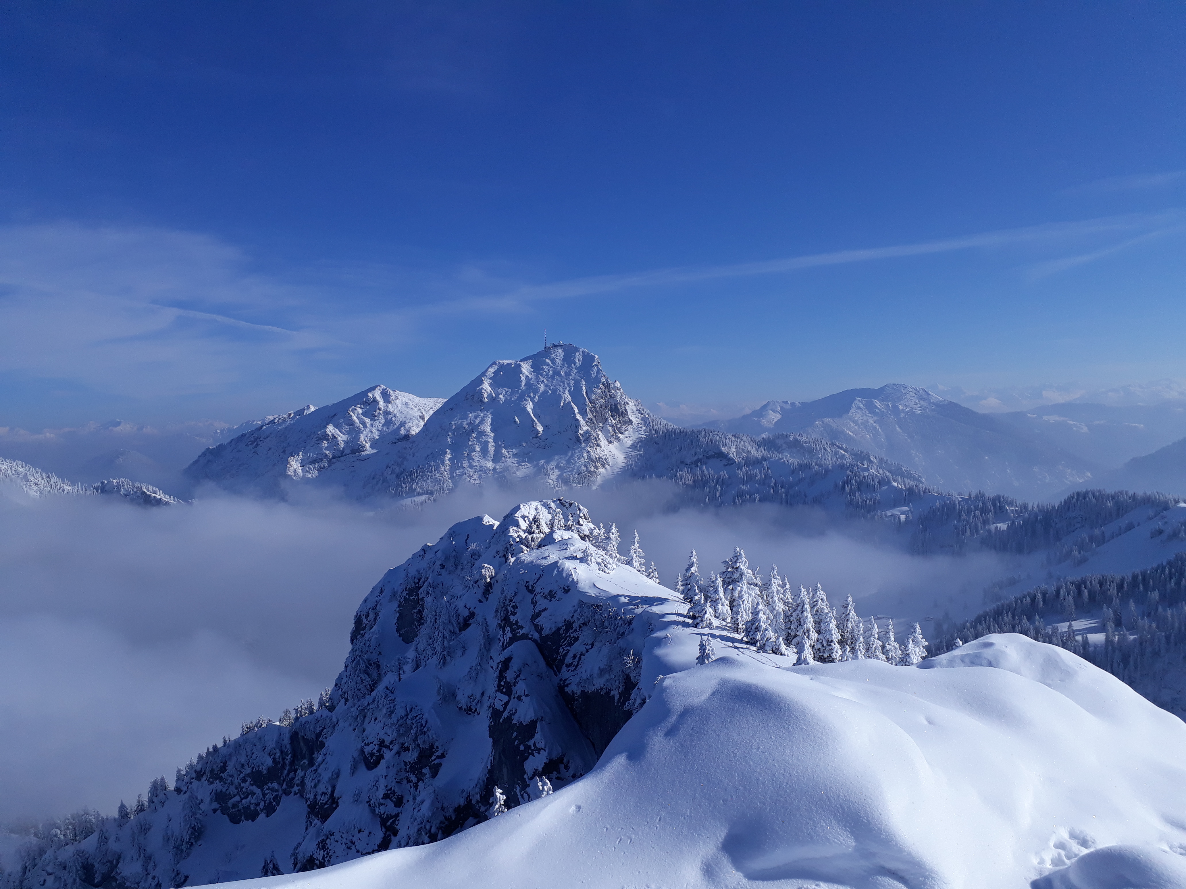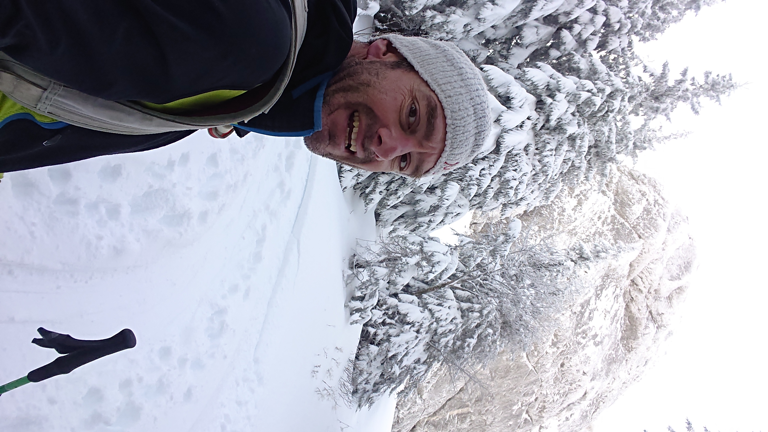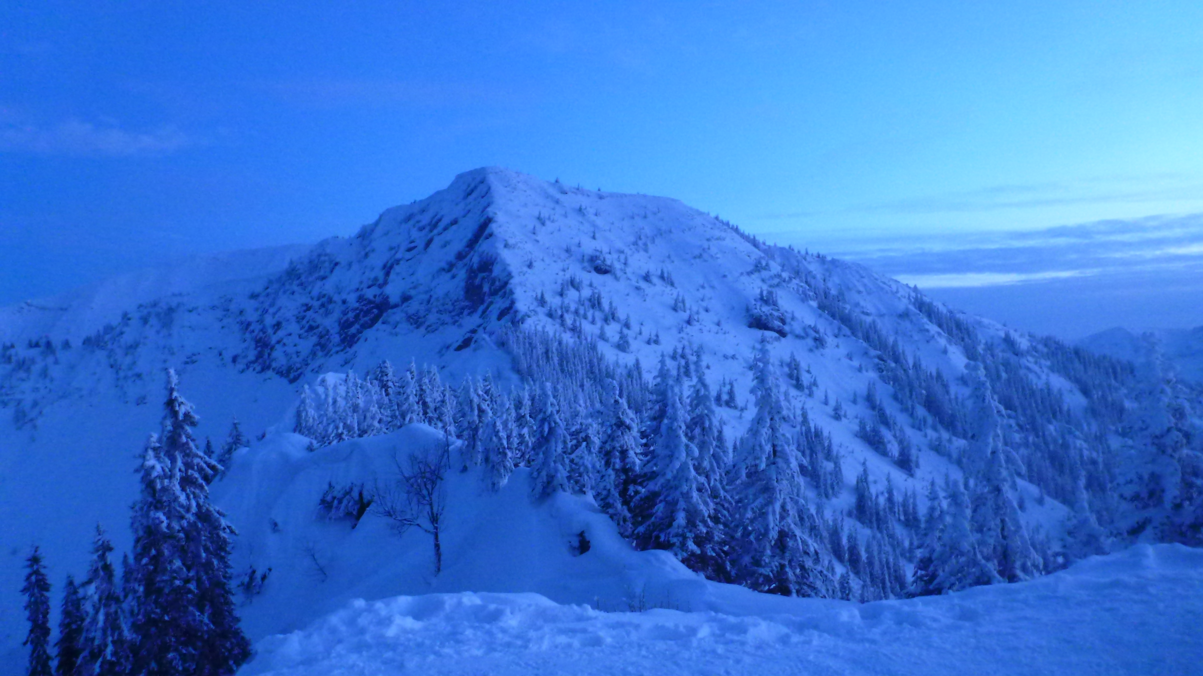 Sonstiges: Vom Hackerbauer kurz über Forststraße, dann durch dichten Wald und Nebel steil nach oben. Ab ca. 1500 m ins Ebersbacher Kar und über gute Spur über zwei Steilstufen auf die linke Seite auf den Schlusshang zu und zum Kuchelnieder. Dort Skidepot und über guten Stapfschnee auf den Bändern zum Gipfel.