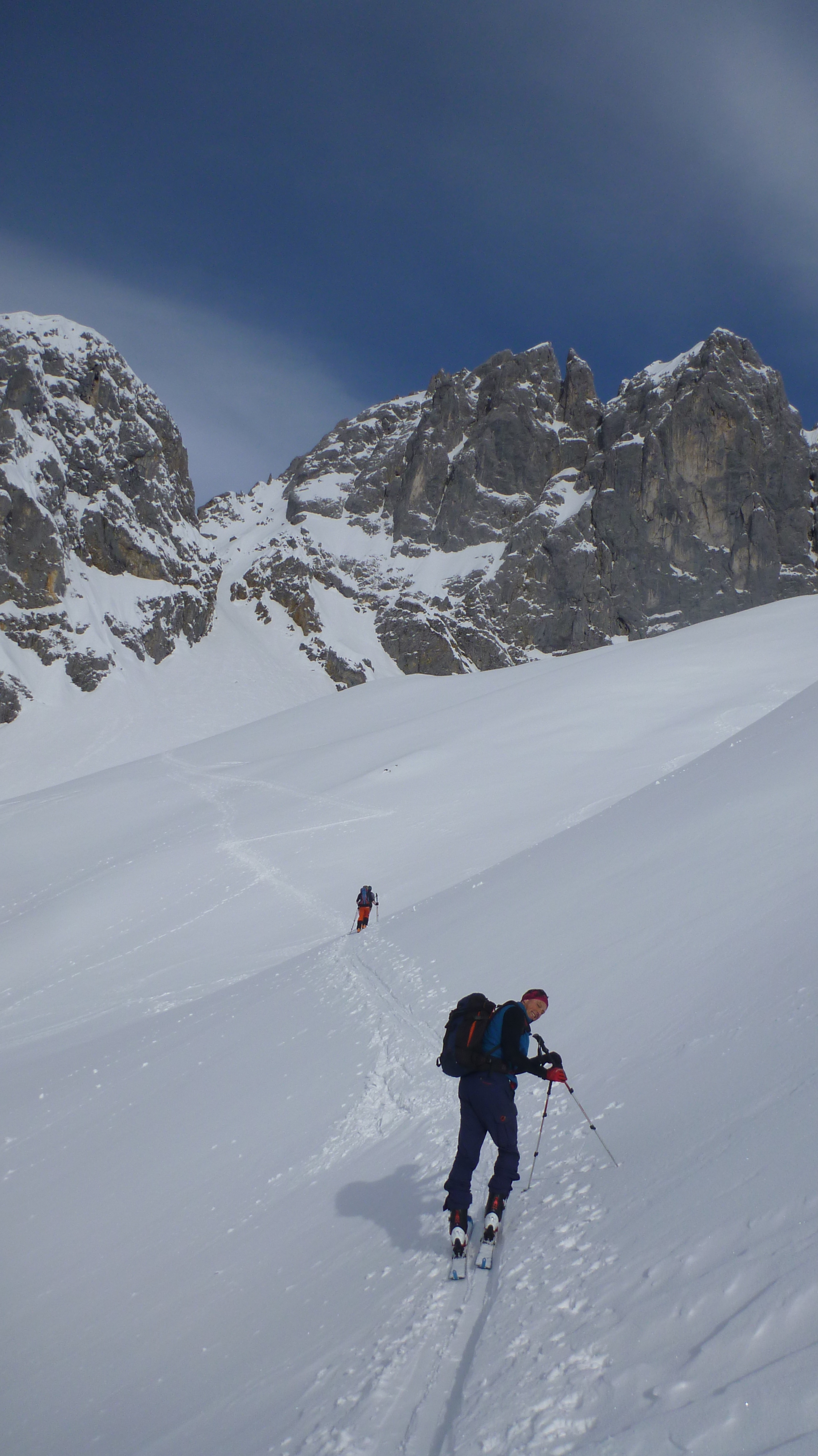 Tourenverhältnisse: beste Bedingungen, griffige Spur im Aufstieg, gute Stapfspur ab Skidepot, keine Steigeisen nötig, in der Abfahrt von Pulver über windgepresst und Bruch alles dabei