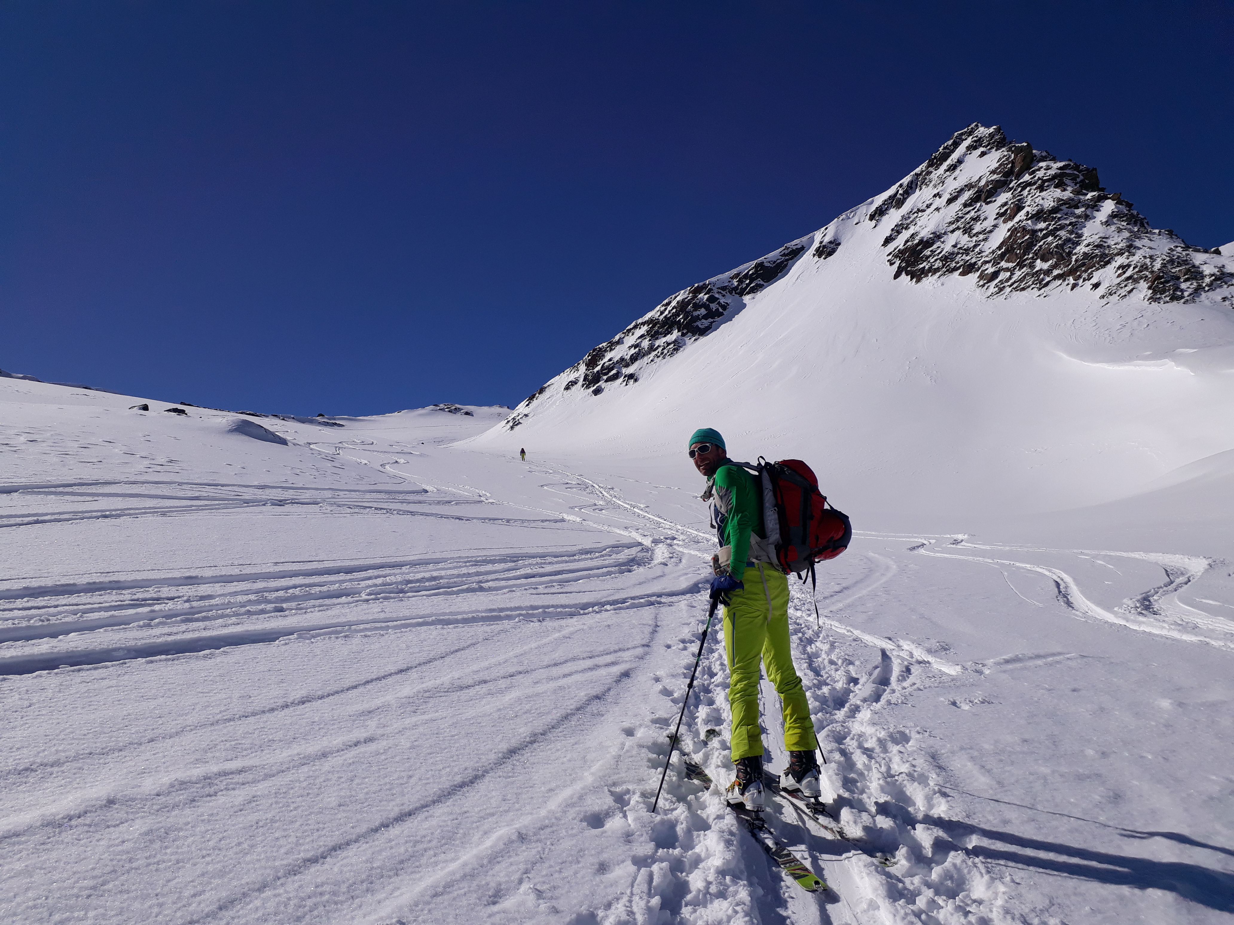 Gefahreneinschätzung: Lawinenmäßig Querung im Aufstieg zur Pyramidenspitze etwas heikel, ansonsten gut vertretbar
