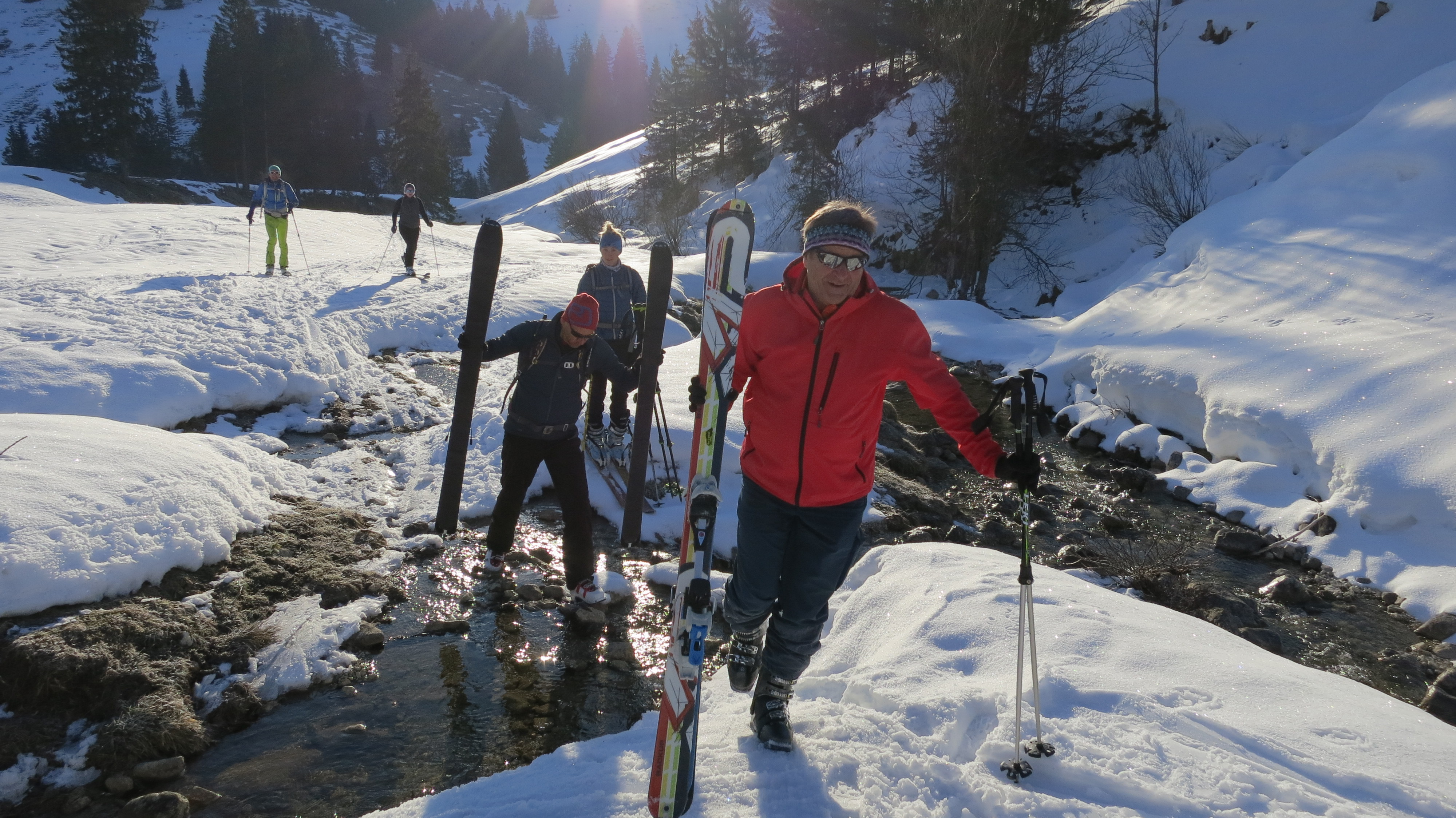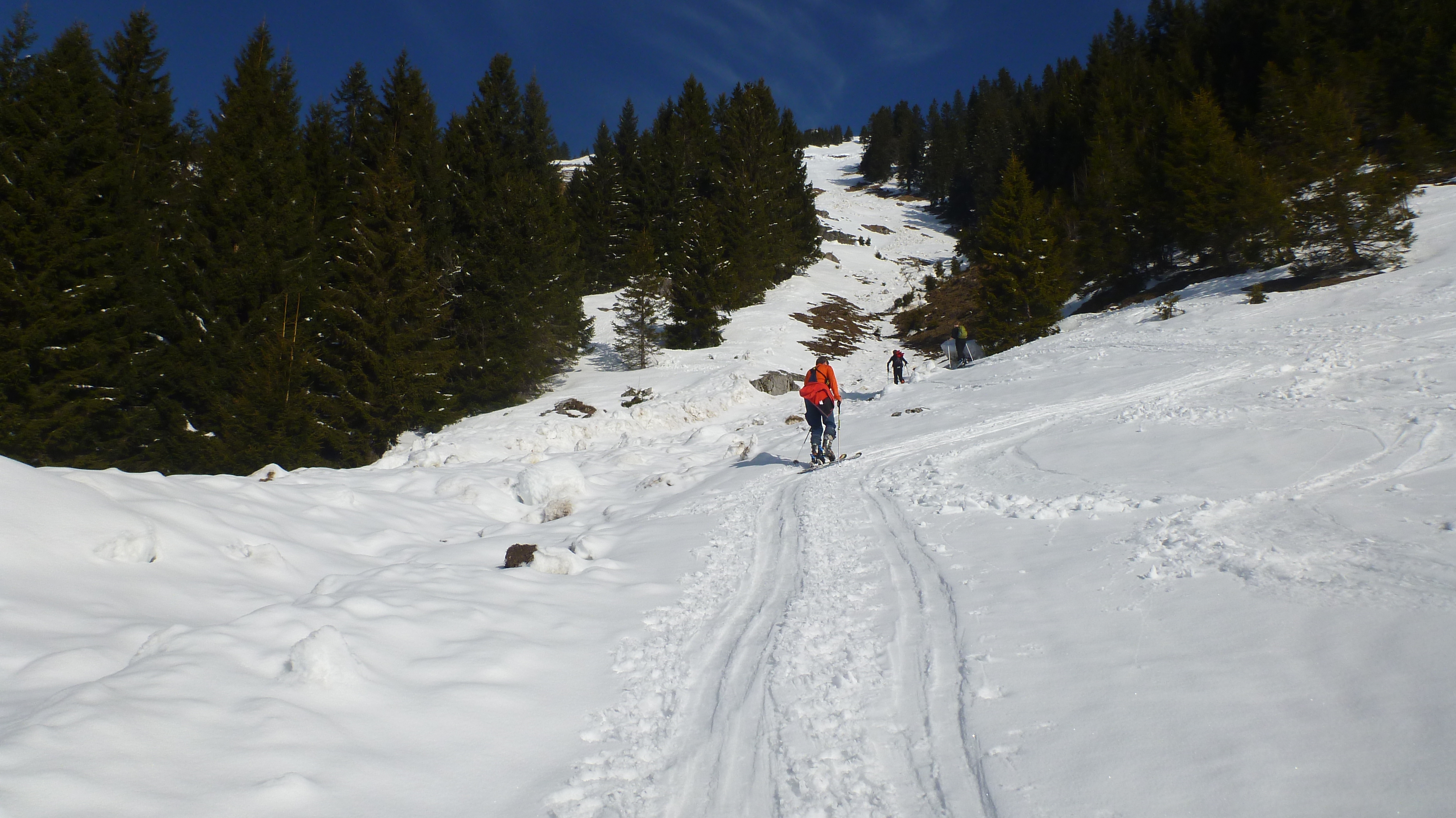 Tourenverhältnisse: Verhältnisse insgesamt recht gut. Aufstiegsspur zur Gruttenhütte teilweise recht rutschig. Im Aufstieg zur Roten Rinn Scharte liegen Lawinenboller, unangenehm zu gehen, die letzten 50 hm mit Ski auf Rücken, Steigeisen nicht nötig. Abfahrt von der Roten Rinn Scharte griffiger Schnee, teilweise mit Windeinfluss, Ausfahrt nach Hinterbärenbad gute Bedingungen, Aufstieg zur Pyramidenspitze im Waldbereich teilweise aper, danach sehr gute Verhältnisse, Abfahrt ins Egersgrinn griffig, im steilsten Abschnitt in der Mitte Blankeis (am Stein), danach griffiger Schnee